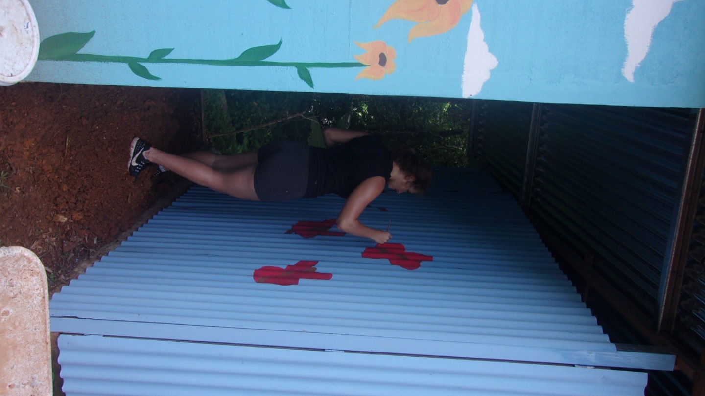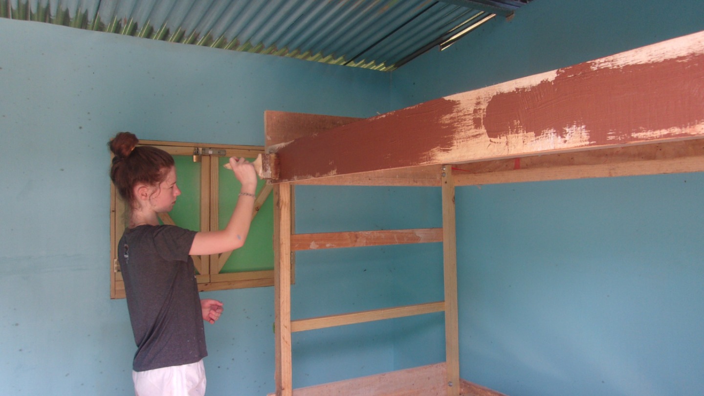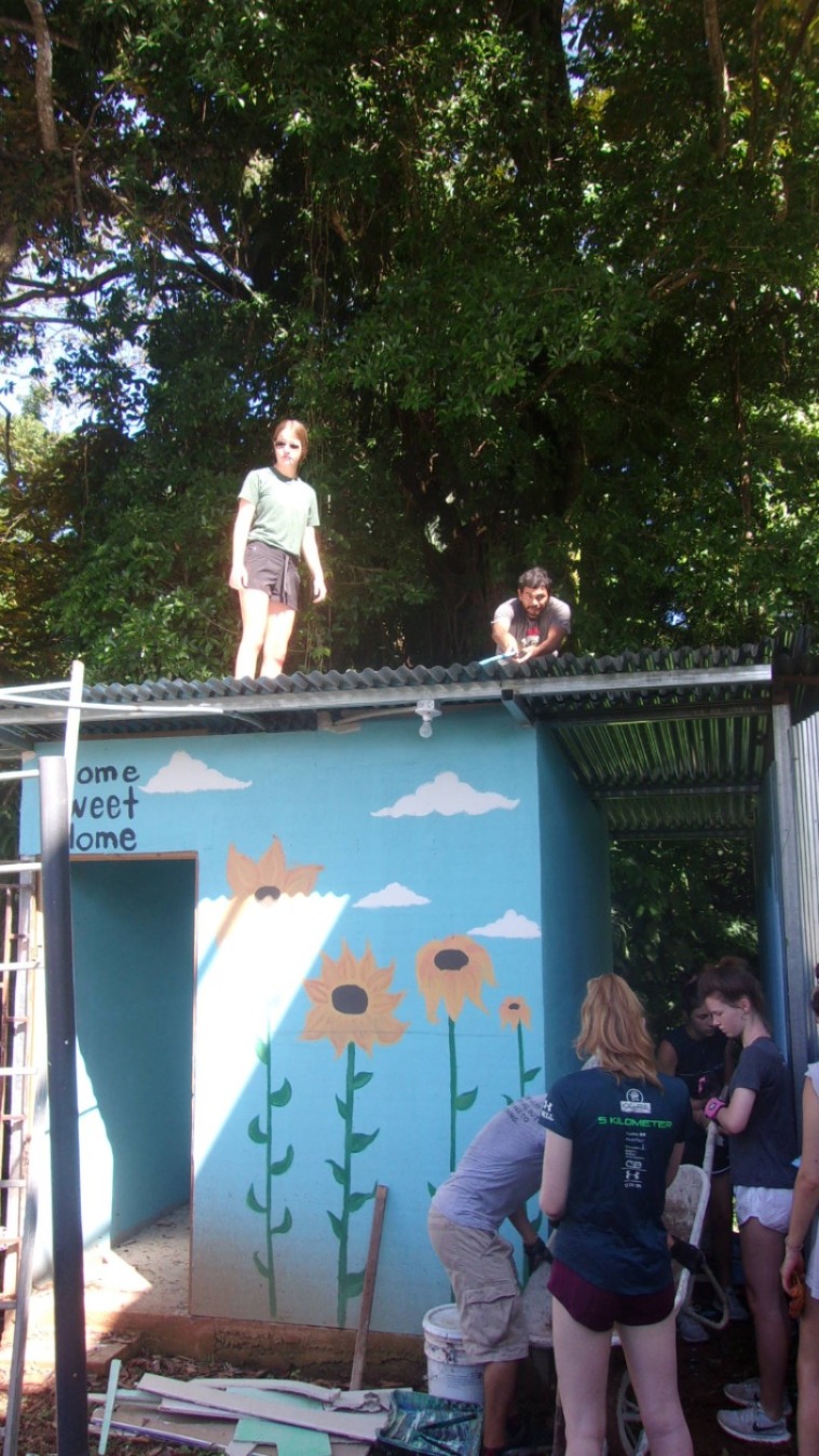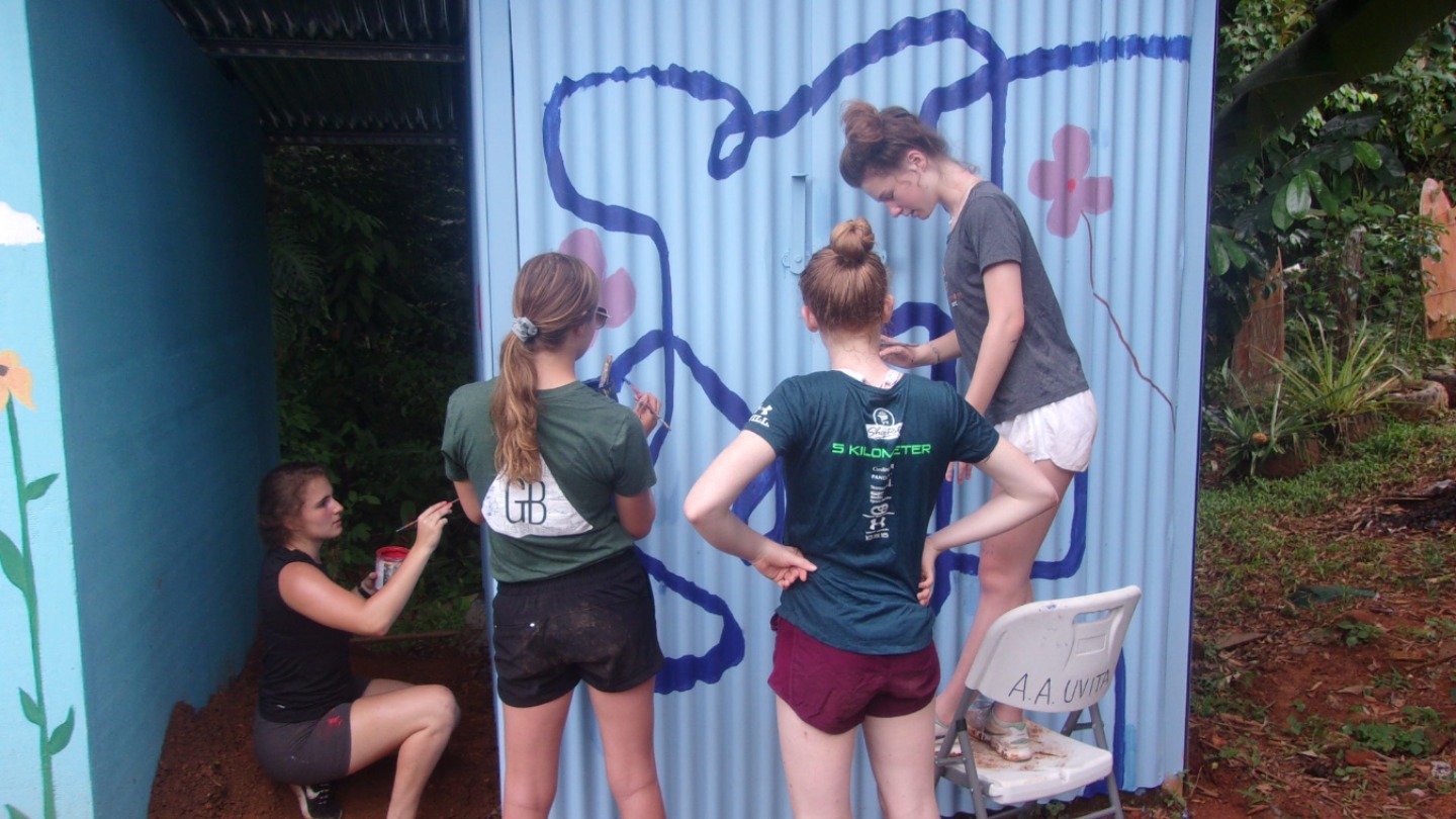 Today we woke up from a solid night in our apartments and made a delicious breakfast of pancakes and eggs. After cleaning, we hopped on the bus and headed to start our workday. We arrived at the central education of Uvita to help create a better area for volunteers to stay when serving in the area. We started to sand down the metal bars creating the door of the bedroom for the volunteers and the bunk-bed inside of the room. Kendall befriended an adorable kitty cat and soon after, named it Quendal; this is her Spanish name in which I thought was how she spelled her real name. Doh! After that, we split into groups and started fetching dirt, painting walls, painting butterfly murals on the walls, painting the bunks, and painting the roof. When everyone was all tuckered out, and after many water breaks/ mango breaks, we headed to grab some lunch. (Today was most-likely the hottest day yet with temperatures ranging between 90-100 degrees!)