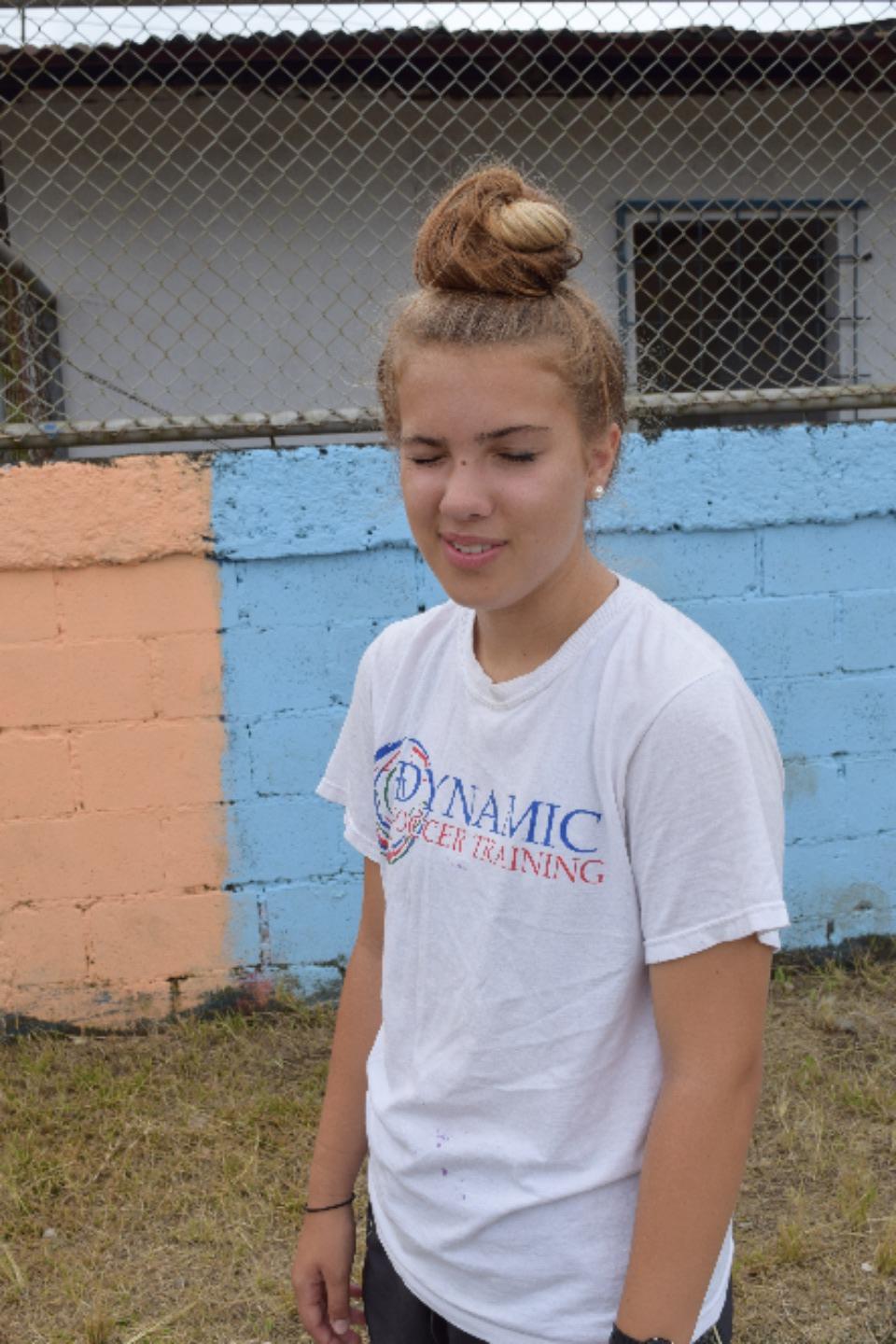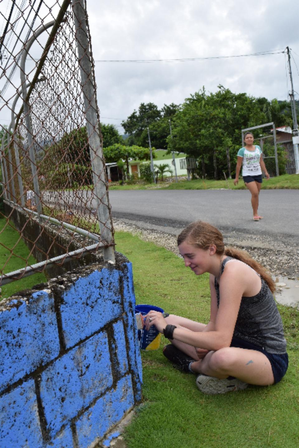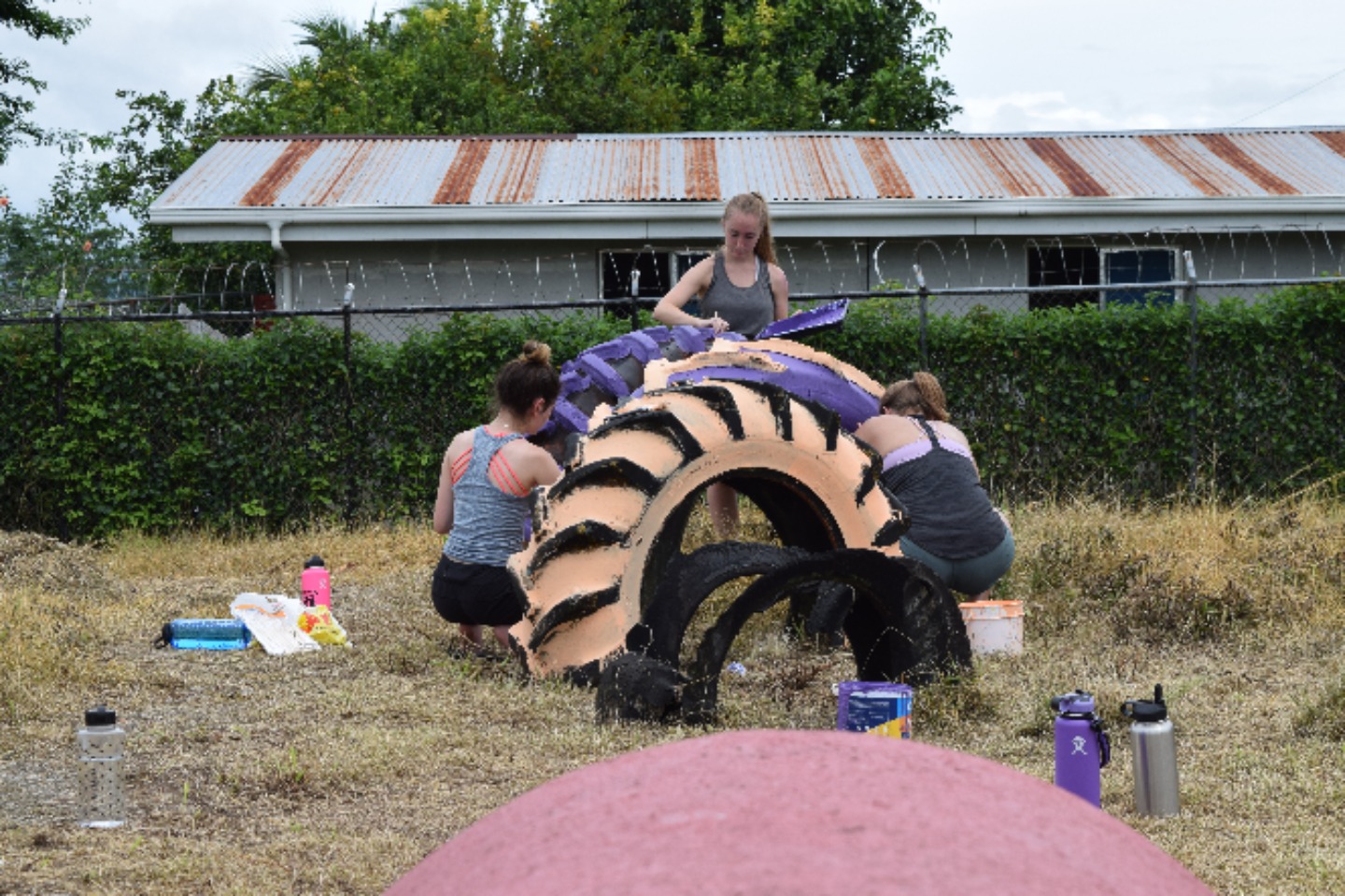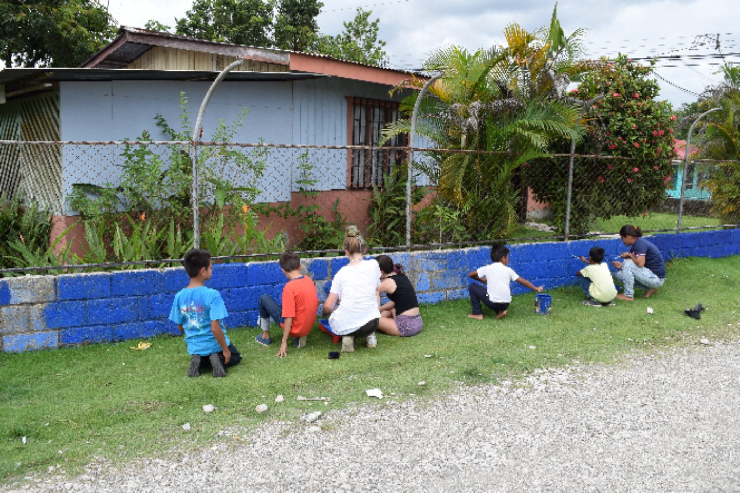 The day started, as usual, we ate breakfast at the hotel, in Golfito. Then we gathered our things and got ready to spend the day doing Costa Rica charity work at Fatima’s Humanitarian Foundation in Rio Claro. As soon as we arrived there, we started working because there were several tasks that we had to complete before it started raining. The group divided into three teams; the first team had to finish painting the wall in a man’s house, the second group had to repaint an outdoors brick wall, that the rain had washed off, and the third wall had to paint some rubber wheels and a mural in the wall of the local park of the village.