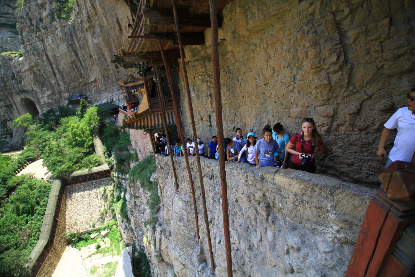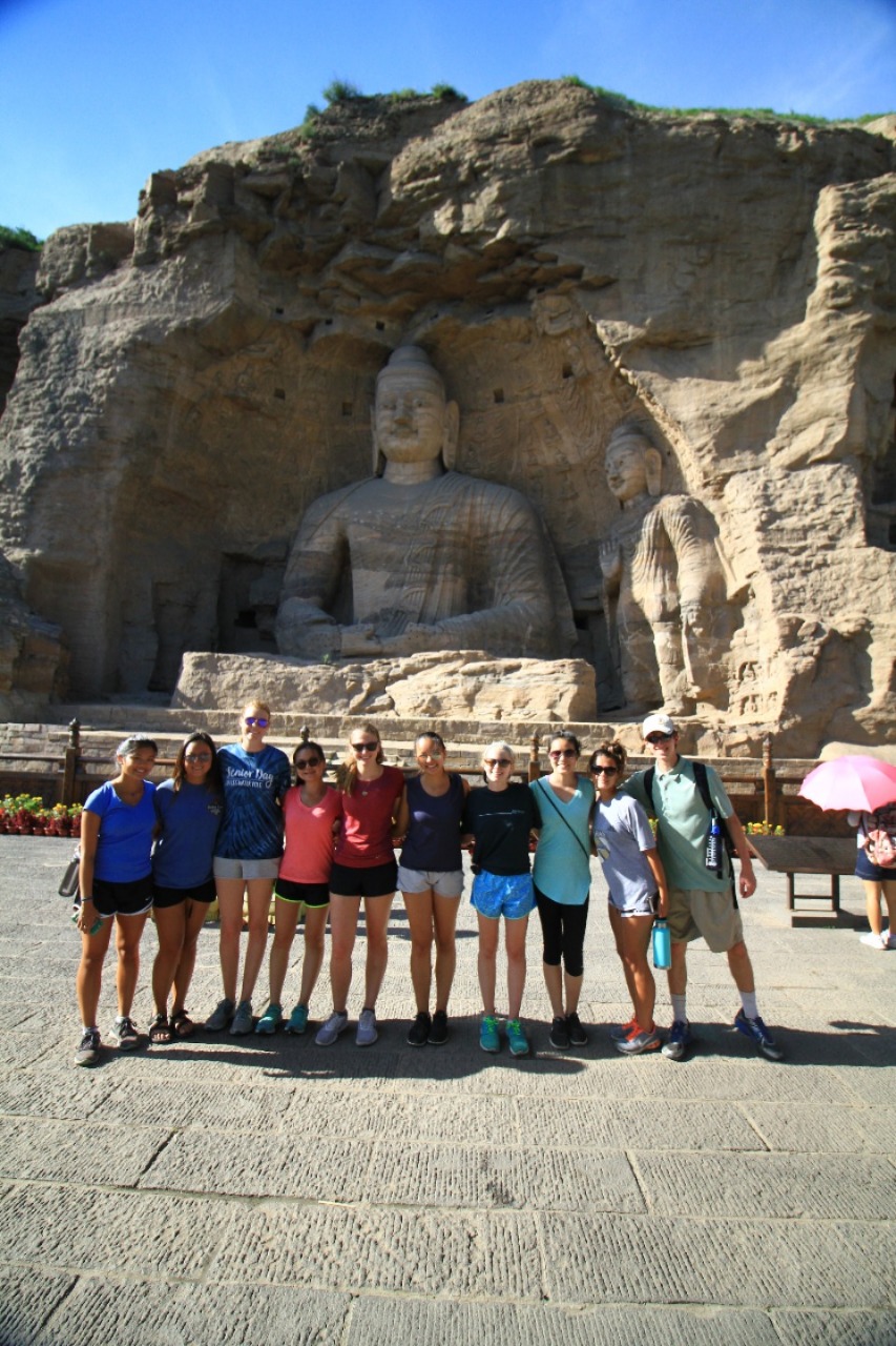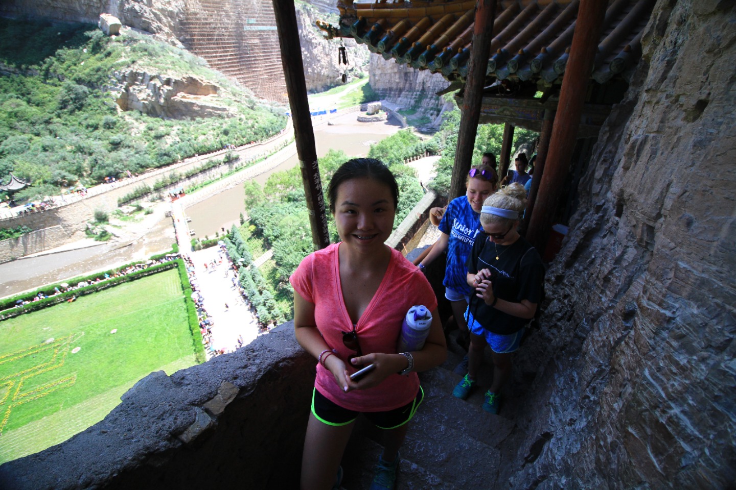 Even though today was our first and last day in Datong, it was still an amazing day! We had just the right amount of time to soak in the entire city! In spite of late train arrival and a head cold that’s going around the group, we pushed through and tried to make the best out of our only day here. After a breakfast of toast with jelly, we headed to the Hanging Monastery for our first activity of the day. The monastery was beautiful, and it was so worth the wait in the line below. To pass the time, we tried to guess what time we would make it to the end of the line. All of our guesses were within a minute of each other, so it was so much fun to either race or slow down at the top. Bex won, even though Shaun said he won (his phone was off)! The monastery was super high, but the tight stairs and narrow passages made the whole experience ten times more fun! When we made it all the way down, we went to lunch in a hotel with a private fancy room for us to dine in. After lunch, we made our way to the Buddhist caves! The caves were so beautiful and so much bigger than everybody expected. To get through the caves, we had to push through a bunch of huge tour groups, but that made for another funny experience! We made it just in time for the museum at the end, with exactly 10 minutes to explore the museum. It was not large, but the artifacts were fascinating to look at. At dinner, we had a great last meal in Datong. It was funny to see the shirtless Chinese men just eating their dinner in the room next to us! Since we had some time to kill before our train, our bus driver took us around to his favorite spots along the way. We stopped at a nice bridge, where everybody got great pictures. We also stopped at a park, which was very busy for a Monday night! Lots of people had bright balloons, and the kids were riding all sorts of neon glowing bumper cars and toy motorcycles. We wandered over to the lake on the far side of the park before leaving to catch our train. Today ended up being a great quick trip to Datong, and we all wished to stay longer – the city was amazing!