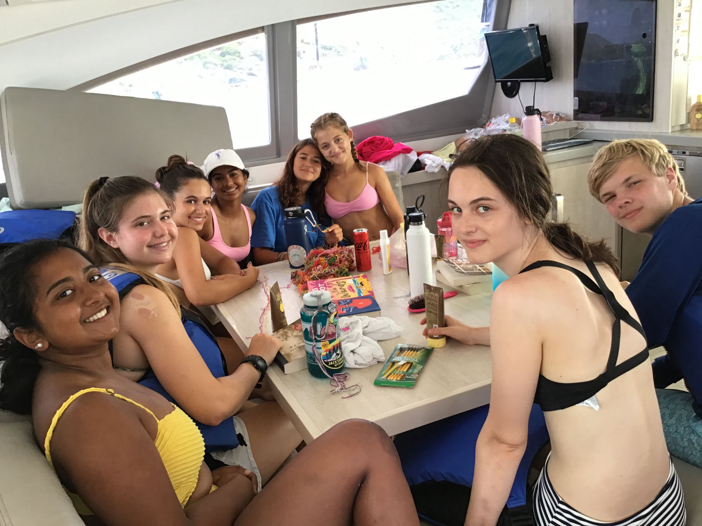 Today we woke up at 8:00 am to wonderful pancakes made by Elle and Hannah. We began our three-hour trip to Marina Cay by motor sailing. Along the way, there was napping, reading, and bracelet making. Griffin took the helm and steered us for a little while. We had a late lunch once we arrived at our destination, and Anna B. decided to have plain white bread while the rest of us had Raman. After lunch, we finished watching the last of The Biggest Little Farm documentary. Before dinner, we all jumped in the water for our showers, and Liam did a backflip off the dinghy. At dinner, we learned some interesting stories from Morgan and Anna S. Once our dinner clean-up was done, we did a personality quiz that into leadership categories. Lily and I were in the blue group, which is creative. Morgan, Chris, and Anna B. were all in the red group, which is logical. The rest of our group was in yellow, which means they like to take action. Once we all went to bed, there was some strong rain. Lily, Morgan, and Griffin all left their hammocks to go sleep in their cabins so they wouldn’t get wet. Surya, Shaila, Anna S., and I all slept on the blue lagoon, so we were safe from the rain. Overall it wasn’t the most exciting day, but we made the most of it! Now we are on our way for a fun day of water sports!