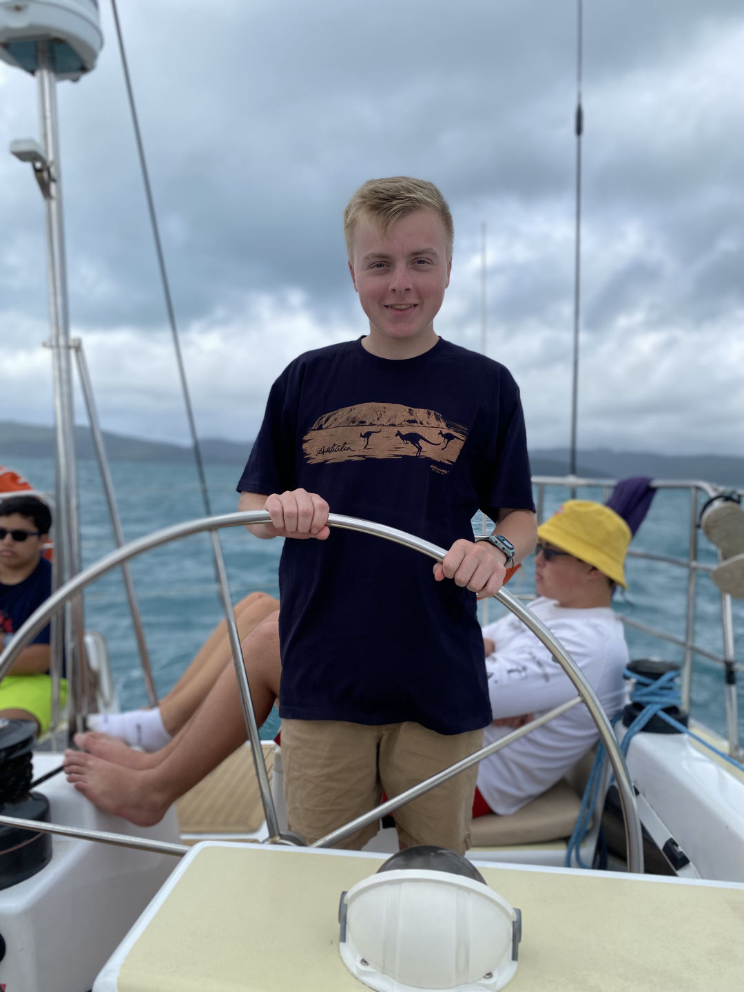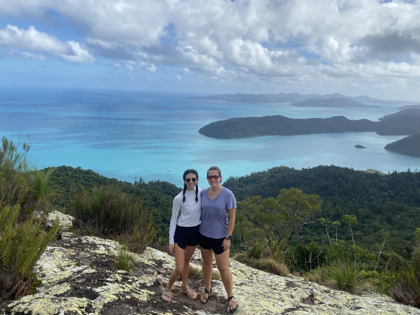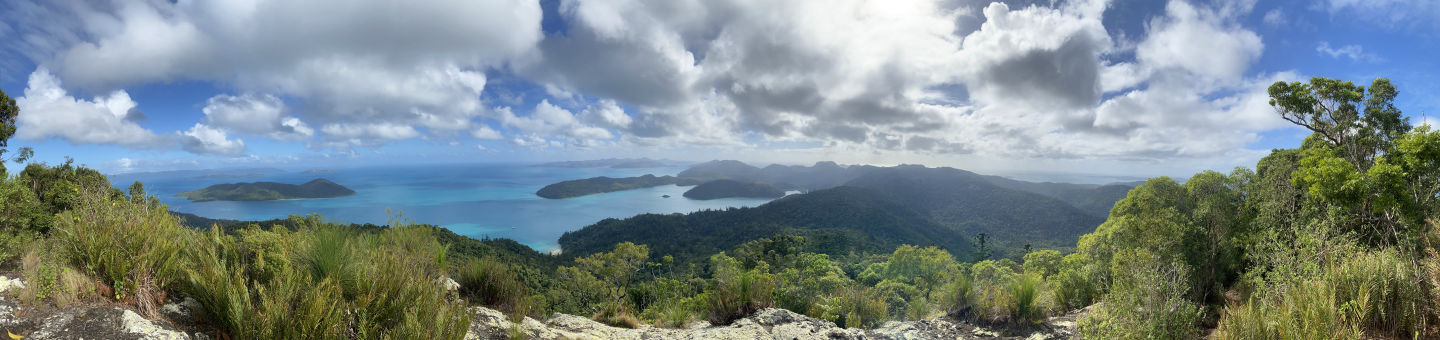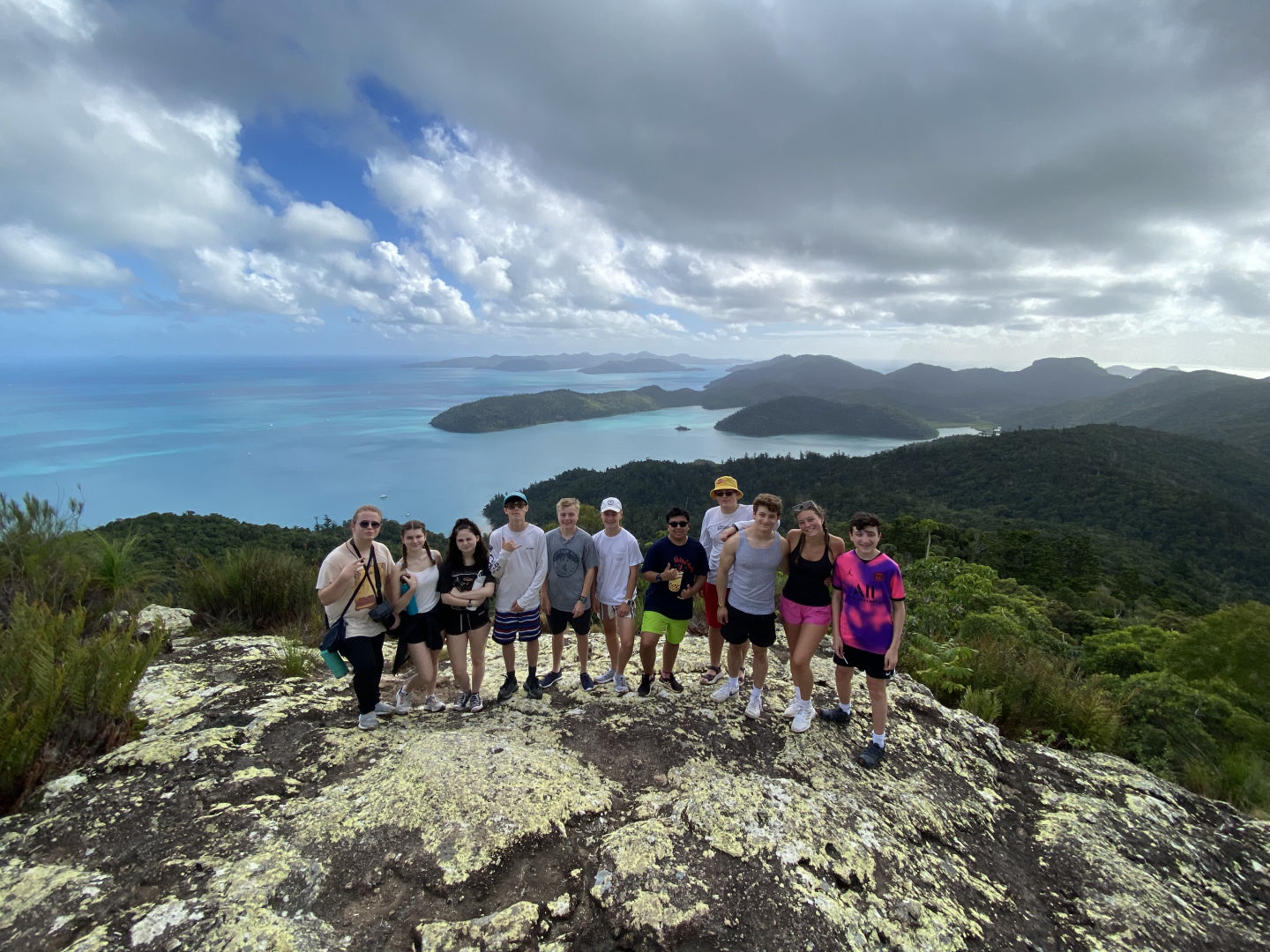 Today, we had another early wake-up at 6:30 and a delicious breakfast at 7:00 provided by our accommodating boat staff, Tom and Mal. Tom and Mal have both been accommodating and positive during our stay in the Whitsundays. From helming our ship, the “Eureka,” to providing delicious charcuterie boards, they have made our stay incredibly enjoyable. After breakfast, we dinghied over to the nearby Whitsunday island for our 5-kilometer hike. The hike brought us to the highest point in all of the Whitsundays, and it certainly felt like it. It took over an hour to get through the steep jungle, however, it was well worth it. The top of the mountain provided a beautiful panoramic view
