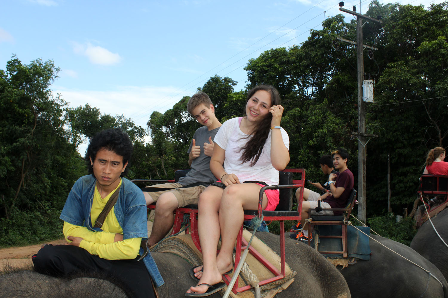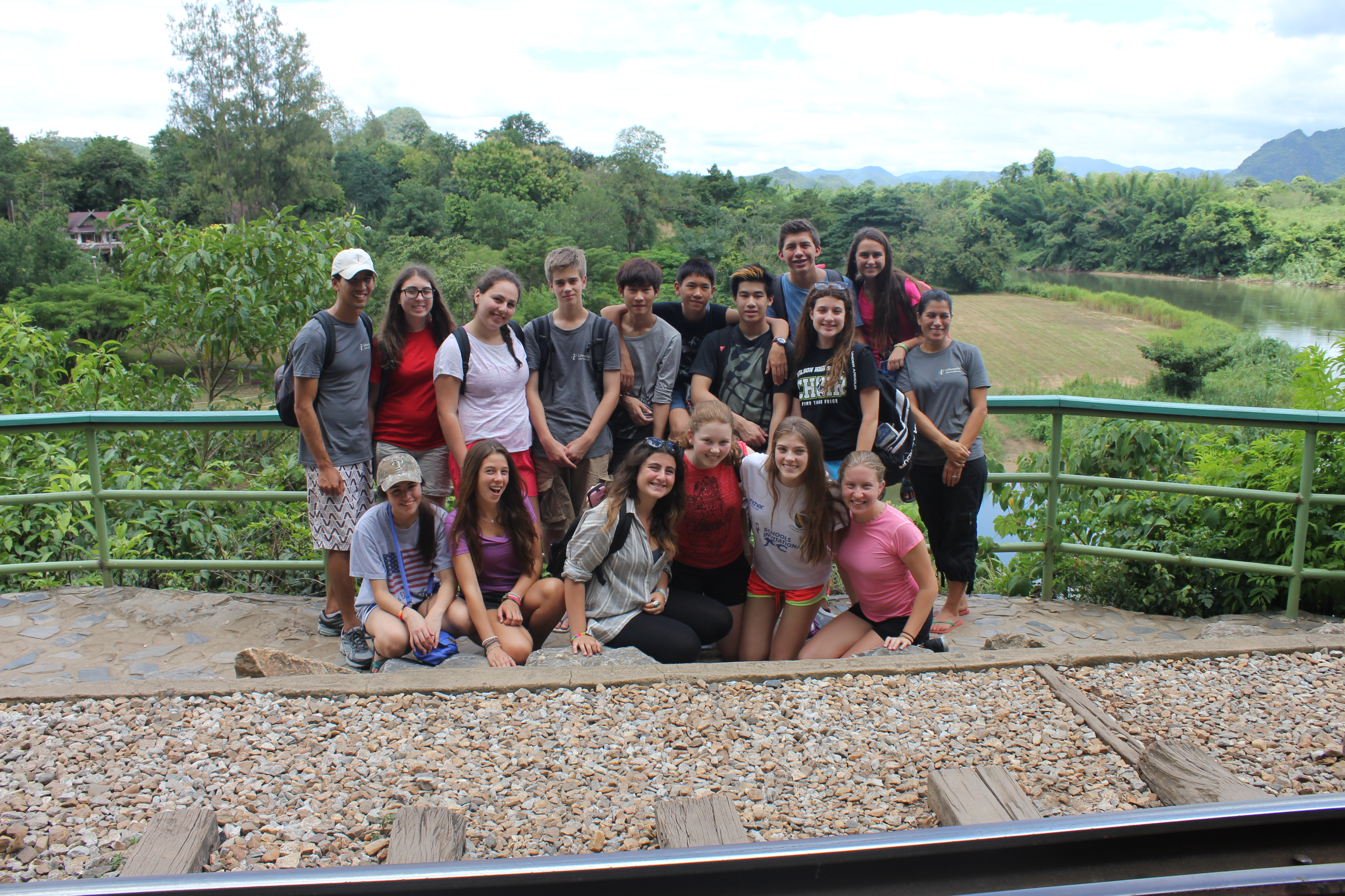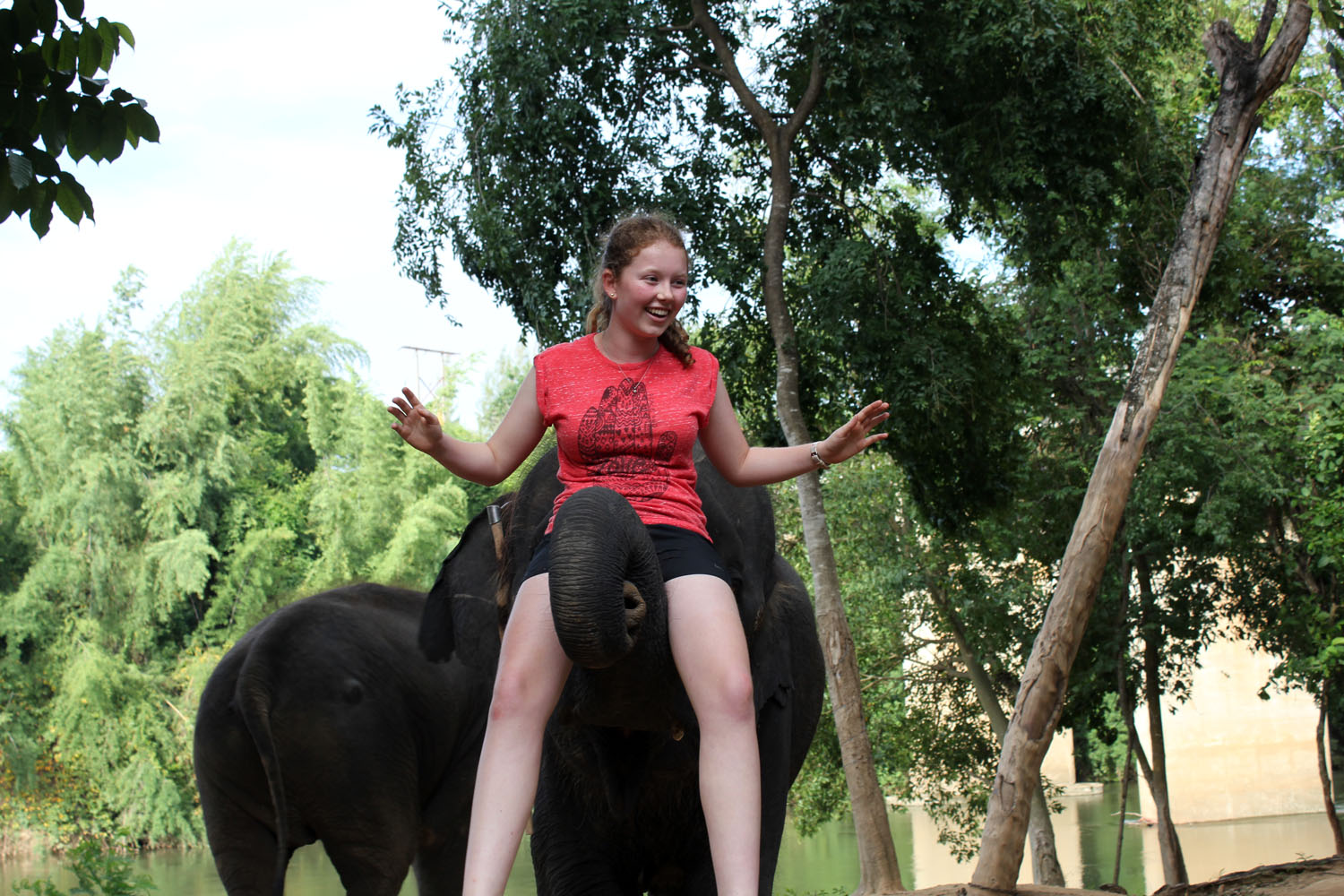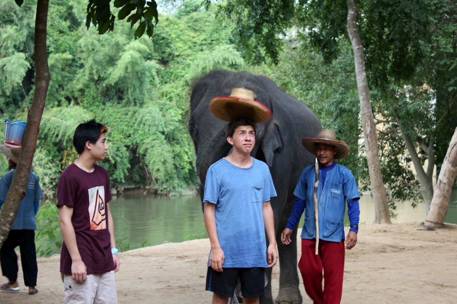 Today was a long day. We began after breakfast with our second day at the school from yesterday, teaching new games and new dances. We had our classic 11 am snack, because, as Avice puts it, “god forbid we be without food for 20 minutes”. We had lunch after a short drive and had the chance to visit a museum about Hellfire Pass and Thailand’s overall role in World War II. Next was probably one of our favorite spots from the trip so far; a waterfall is somewhat hidden among a market that sold some of the most delicious fried snacks I’ve ever eaten (this is saying a lot as my repertoire of fried foods that I consume is perpetually expanding here). Not only was the waterfall lovely to look at, but we also joked it was the hottest shower we’ve taken in a week. After this, we went on the long-awaited elephant rides as well as watched the animals do things from playing harmonica to dancing to “Gangnam Style.” So that was pretty cool.