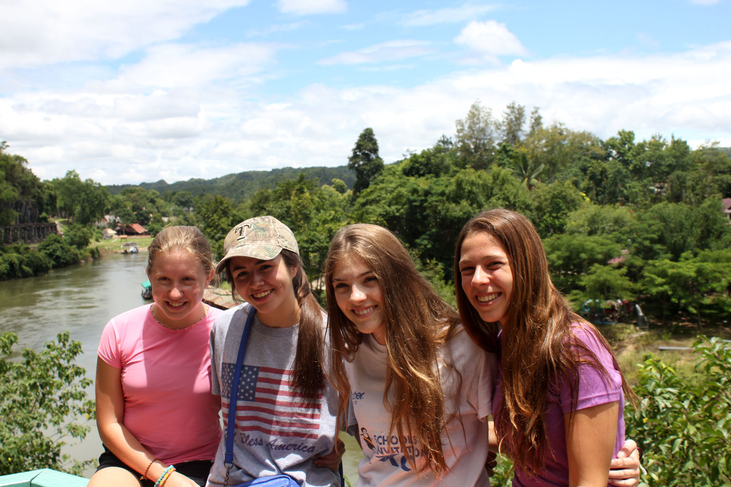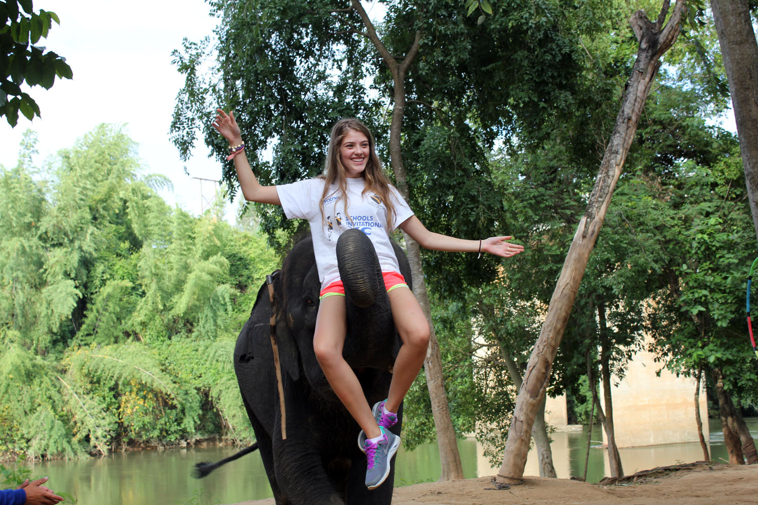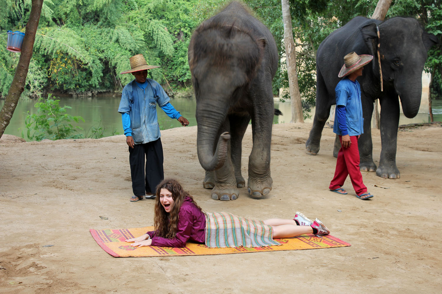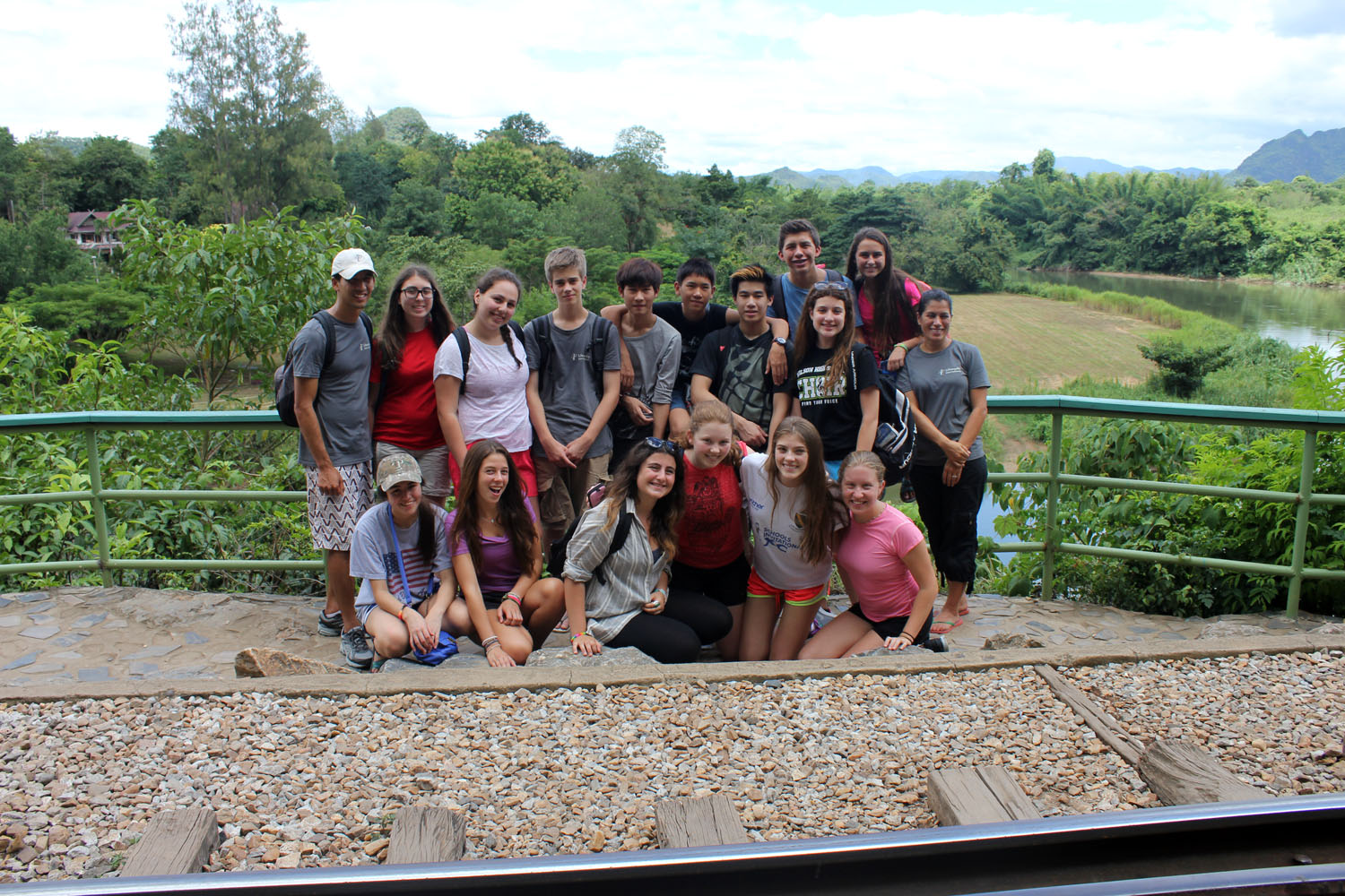 Today was a long day. We began after breakfast with our second day at the school from yesterday, teaching new games and new dances. We had our classic 11 am snack, because, as Avice puts it, “god forbid we be without food for 20 minutes”. We had lunch after a short drive and had the chance to visit a museum about Hellfire Pass and Thailand’s overall role in World War II. Next was probably one of our favorite spots from the trip so far; a waterfall is somewhat hidden among a market that sold some of the most delicious fried snacks I’ve ever eaten (this is saying a lot as my repertoire of fried foods that I consume is perpetually expanding here). Not only was the waterfall lovely to look at, but we also joked it was the hottest shower we’ve taken in a week. After this, we went on the long-awaited elephant rides as well as watched the animals do things from playing harmonica to dancing to “Gangnam Style.” So that was pretty cool.