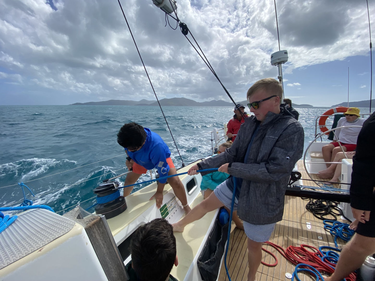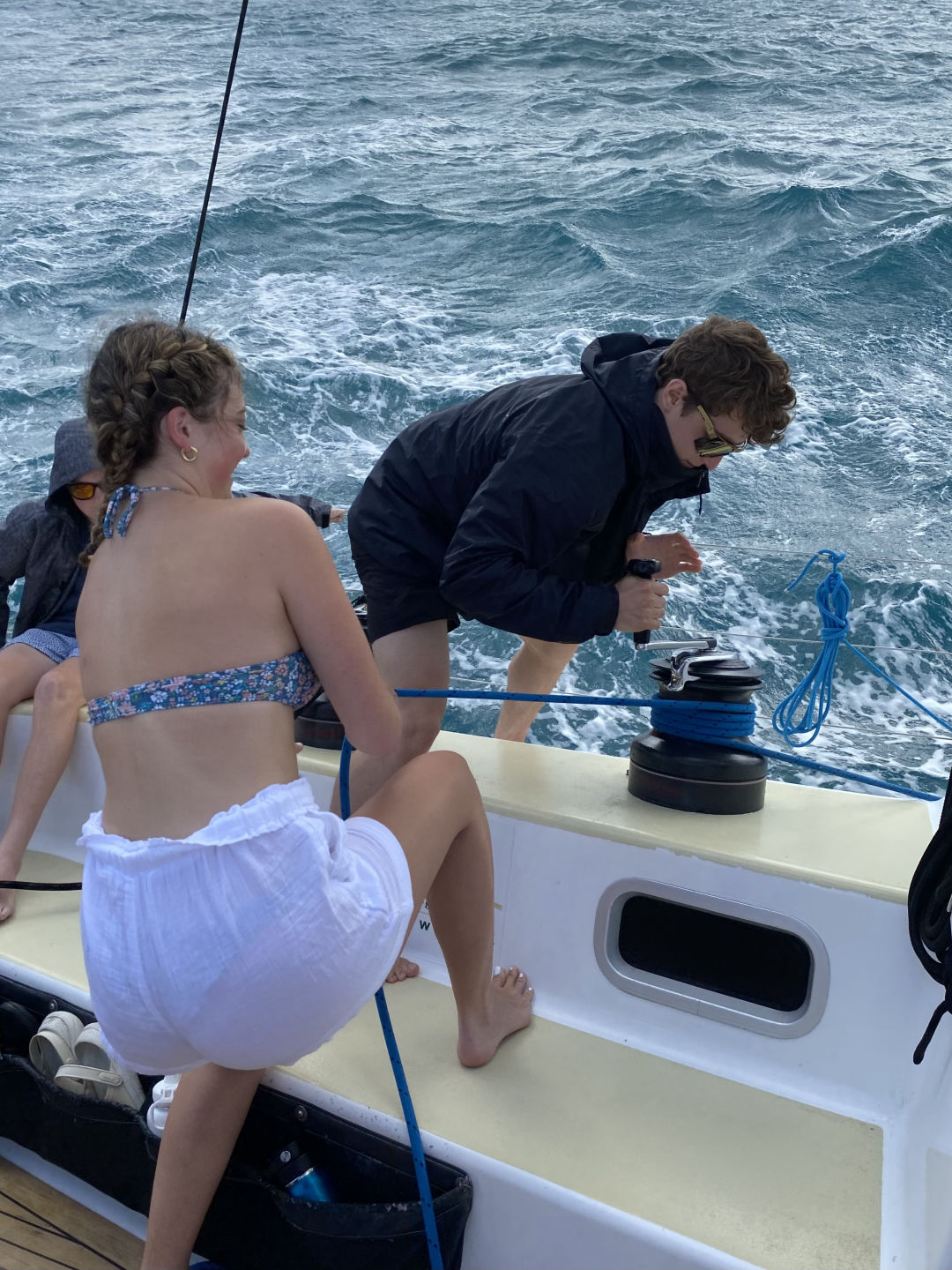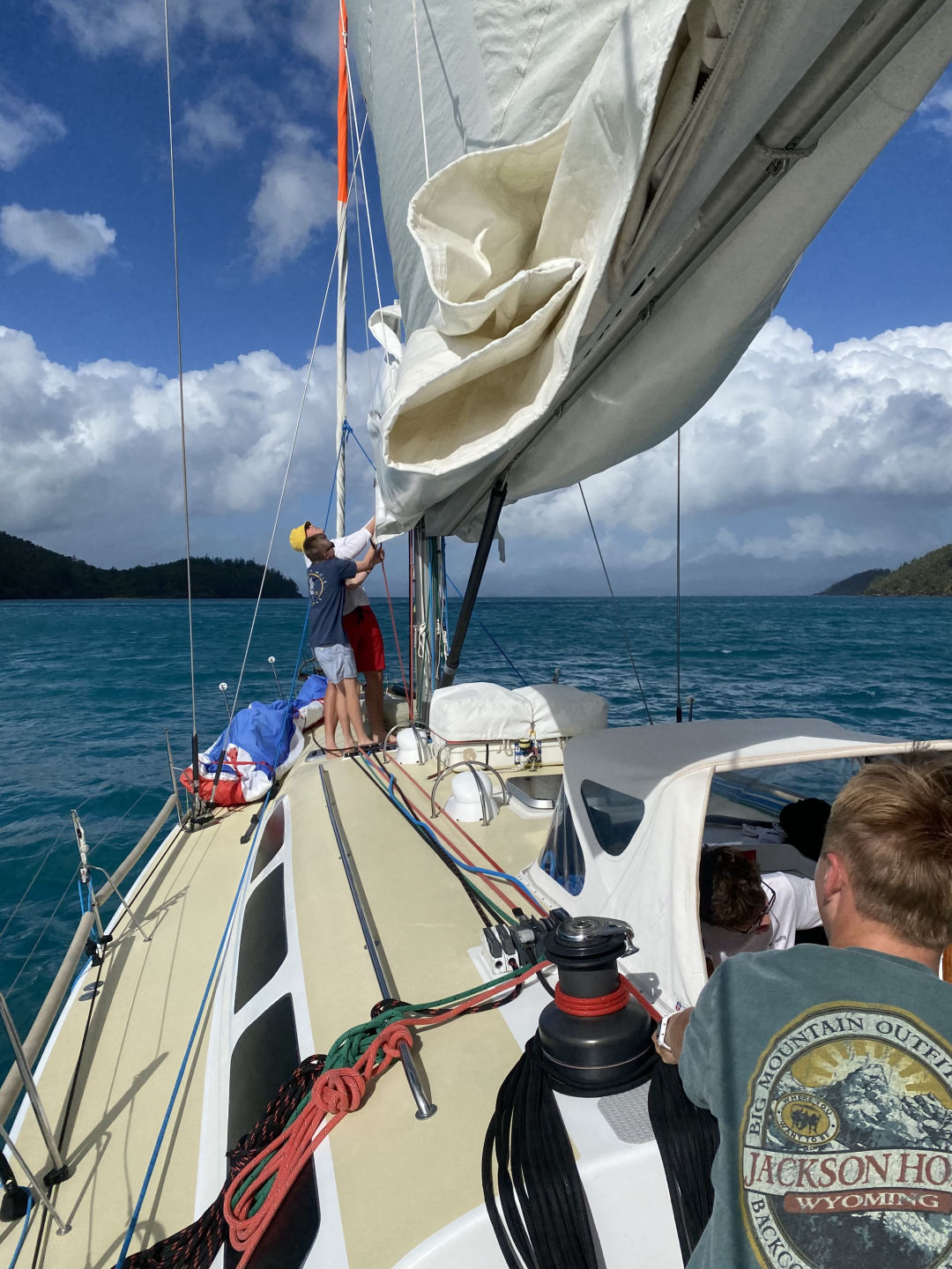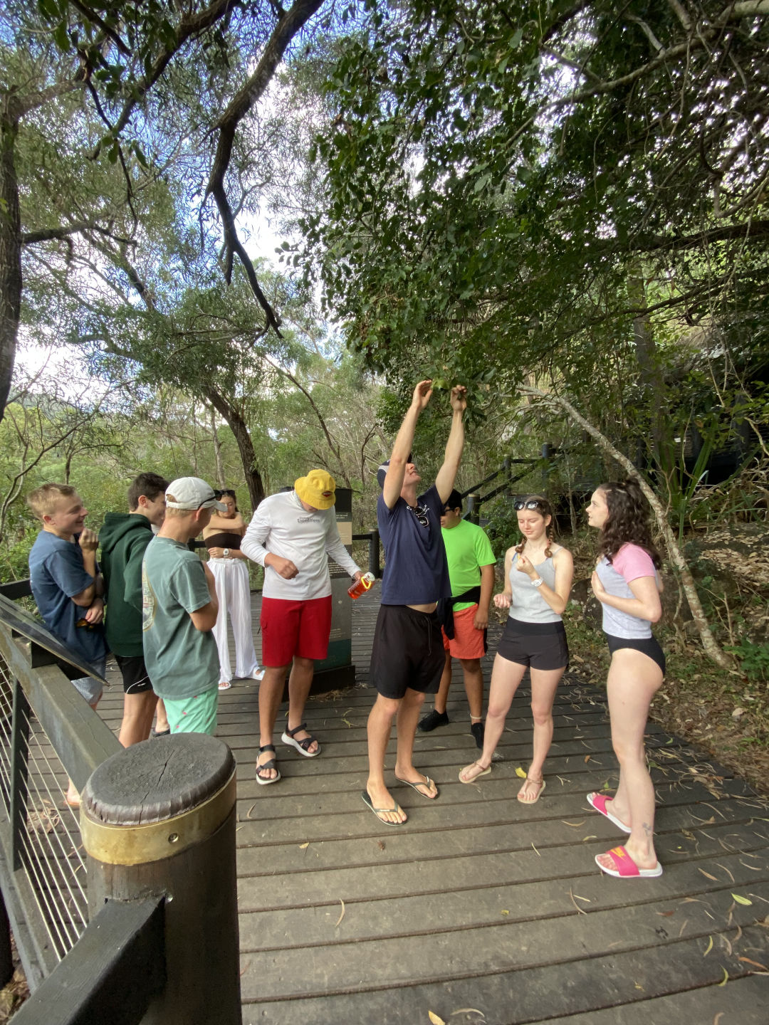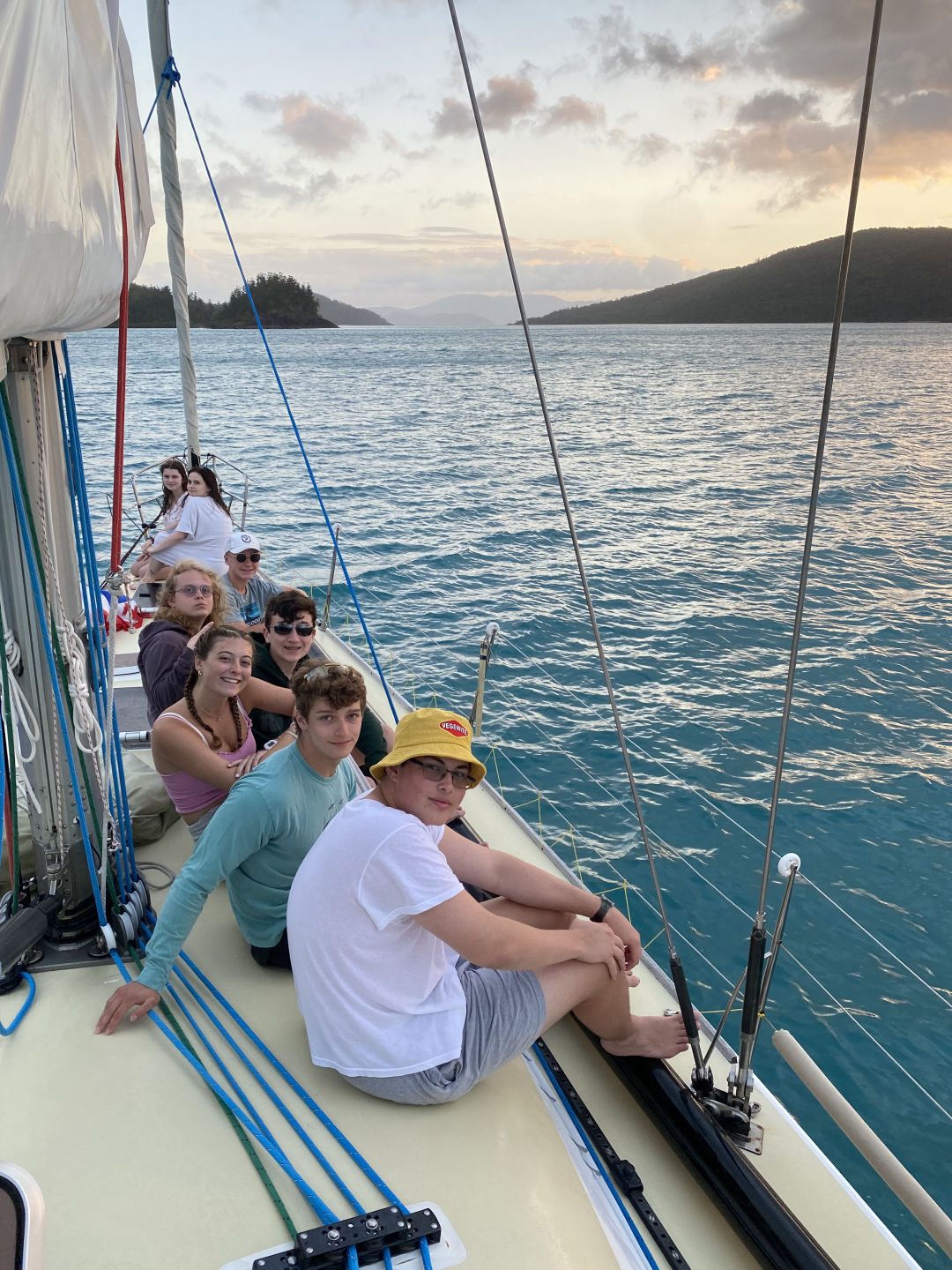 We woke up at around 6:30 to some Disney songs, and after everyone was moving, we ate a breakfast consisting of assorted cereal and some fresh fruit. Then, we went for a short hike to see cave paintings from the native Australians of the region. After the hike, the boat’s crew asked us for some help hoisting both the jib and the main sail. Conditions were thankfully even better than yesterday, and after about an hour and multiple tacks (turning the boat through the wind to change direction), we arrived in Sawmill Bay. Lunch today was ham and cheese wraps with a myriad of toppings to complement them. After lunch, we were dinghied over to Sawmill Beach, where we hiked to Dugong Beach (unfortunately, no dugongs in sight). No swimming was allowed in the bay due to bull shark sightings, so instead, we explored the beach and shallow tidal area. On the way, we saw a very large golden orb weaver spider. At the beach, we found many critters, from crabs to eels to sea slugs. After a brief lesson on the different animals that live in tide pools, we headed back to the boat. There, we saw a beautiful sunset before eating a delicious dinner.