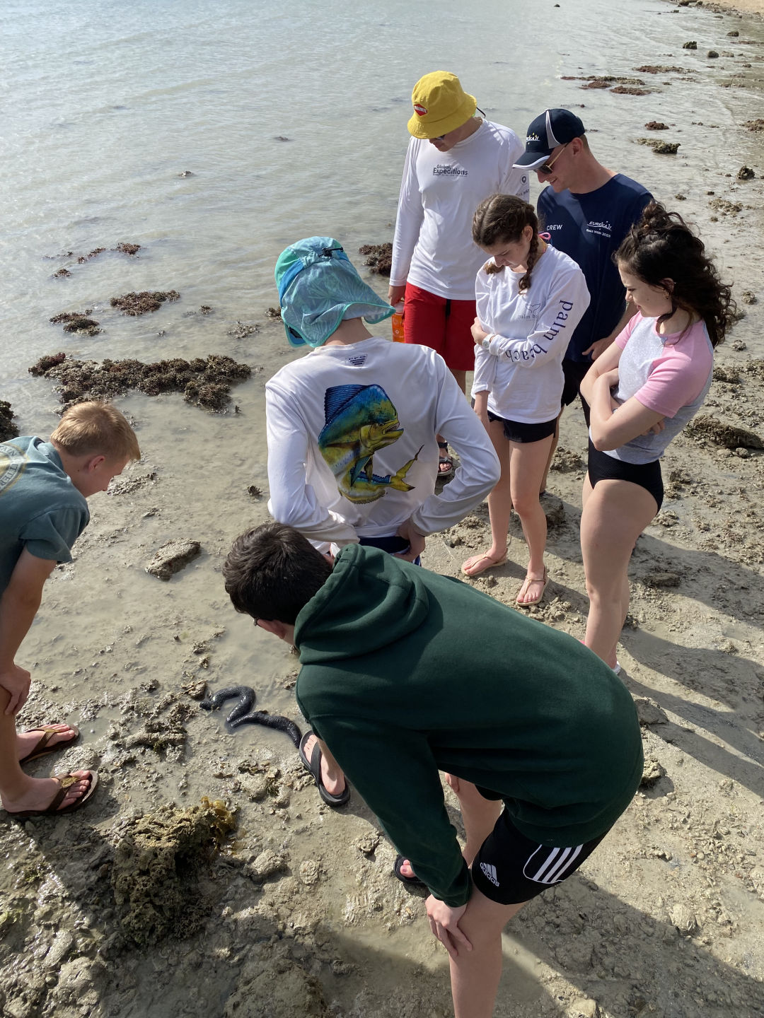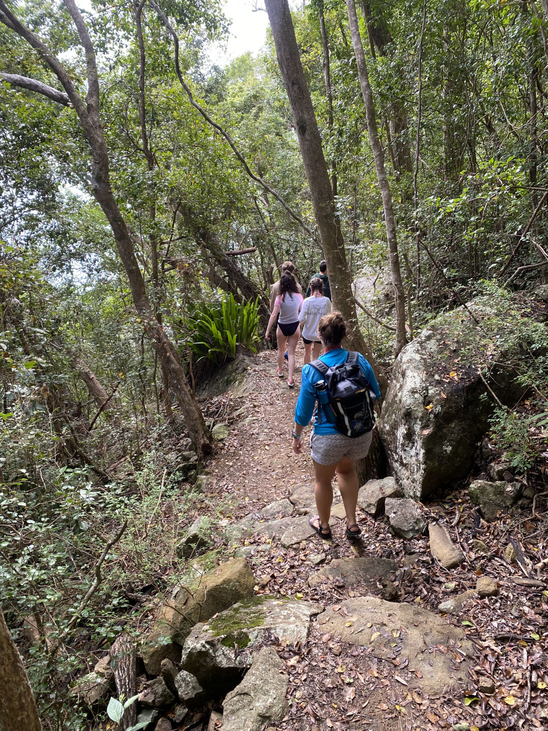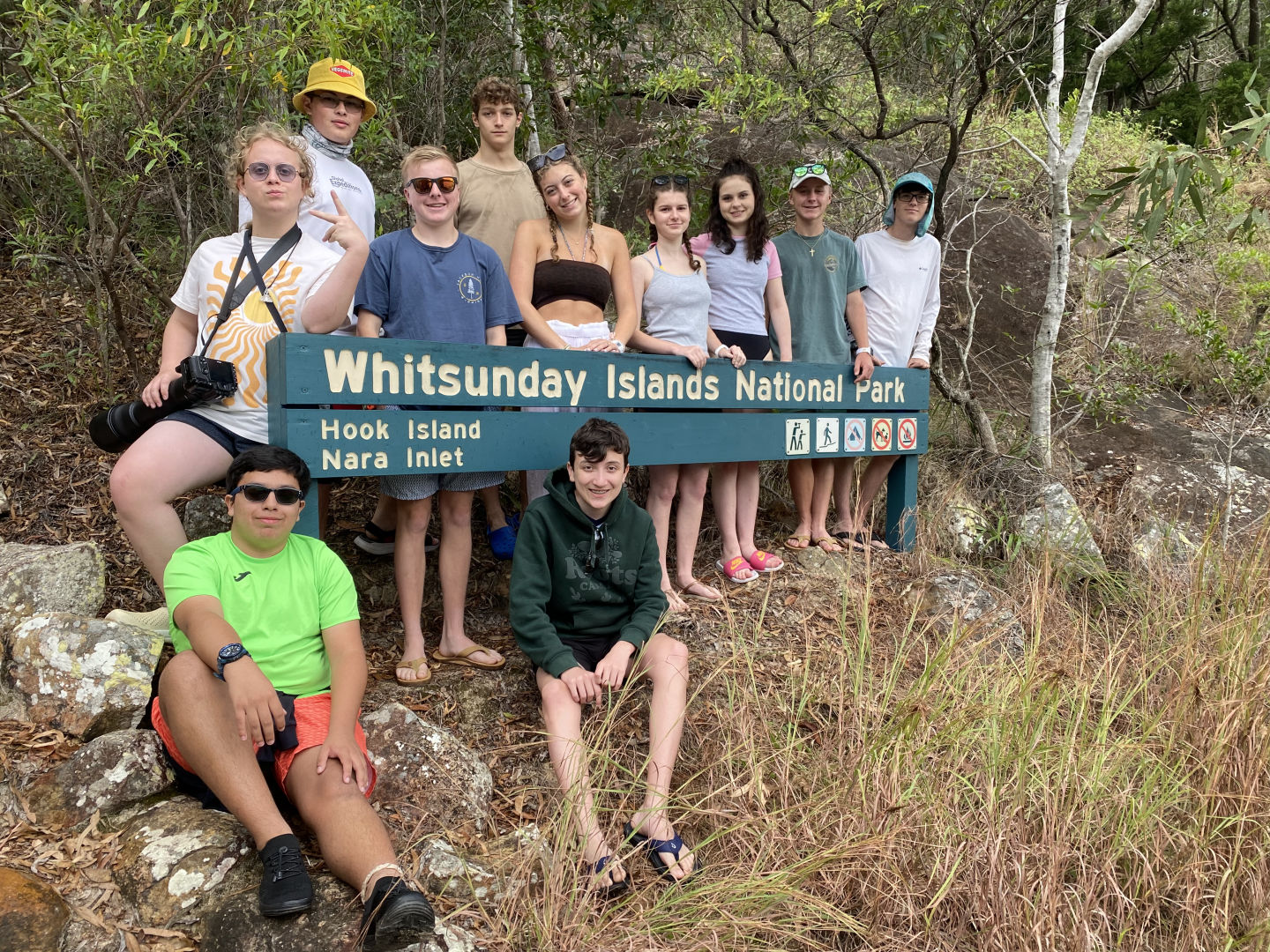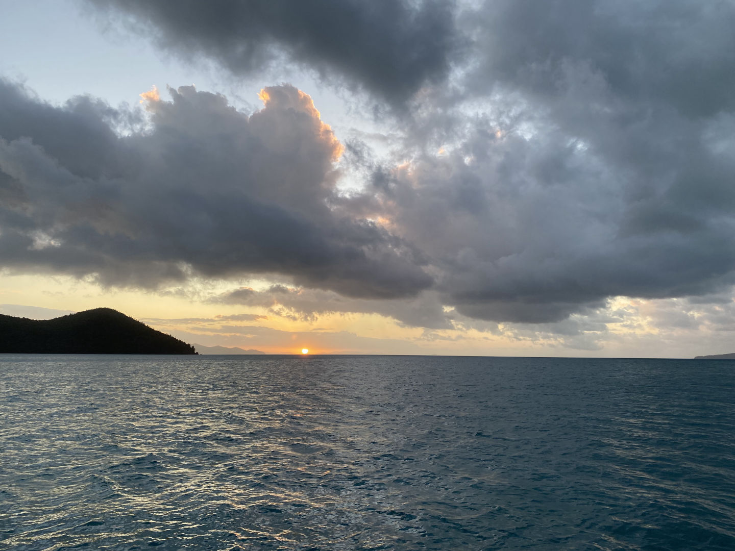 We woke up at around 6:30 to some Disney songs, and after everyone was moving, we ate a breakfast consisting of assorted cereal and some fresh fruit. Then, we went for a short hike to see cave paintings from the native Australians of the region. After the hike, the boat’s crew asked us for some help hoisting both the jib and the main sail. Conditions were thankfully even better than yesterday, and after about an hour and multiple tacks (turning the boat through the wind to change direction), we arrived in Sawmill Bay. Lunch today was ham and cheese wraps with a myriad of toppings to complement them. After lunch, we were dinghied over to Sawmill Beach, where we hiked to Dugong Beach (unfortunately, no dugongs in sight). No swimming was allowed in the bay due to bull shark sightings, so instead, we explored the beach and shallow tidal area. On the way, we saw a very large golden orb weaver spider. At the beach, we found many critters, from crabs to eels to sea slugs. After a brief lesson on the different animals that live in tide pools, we headed back to the boat. There, we saw a beautiful sunset before eating a delicious dinner.
