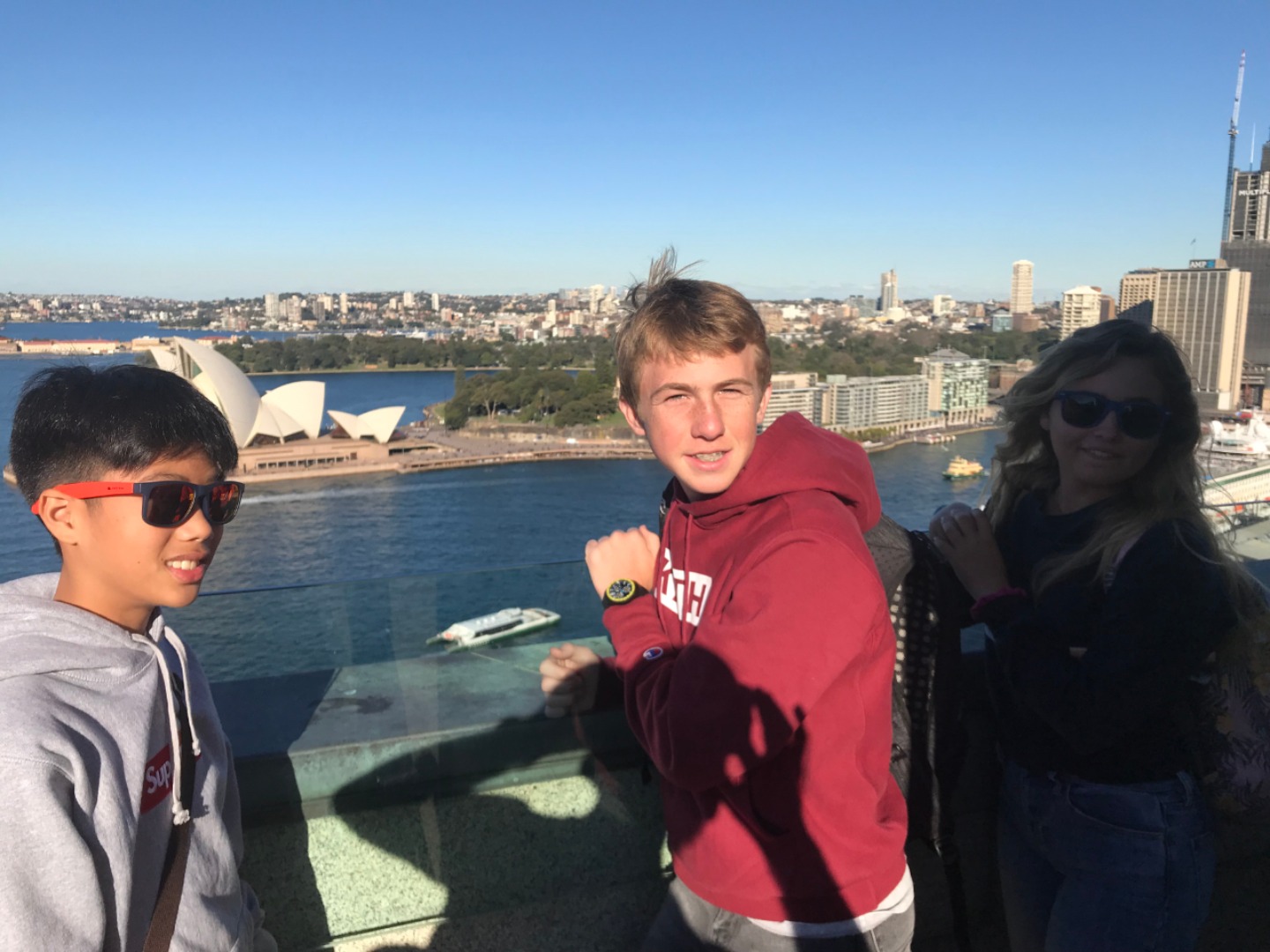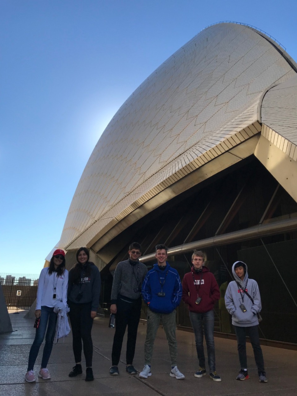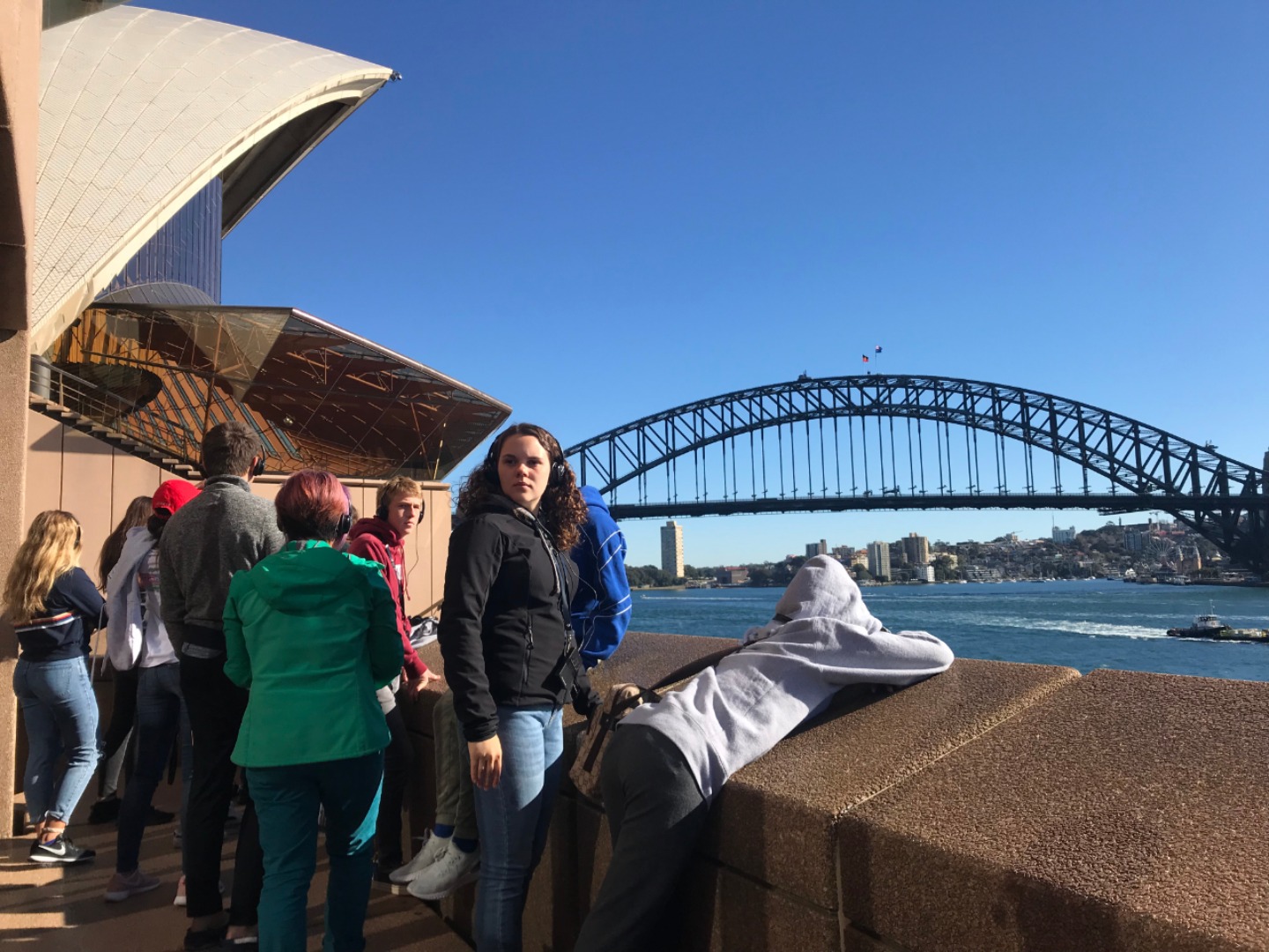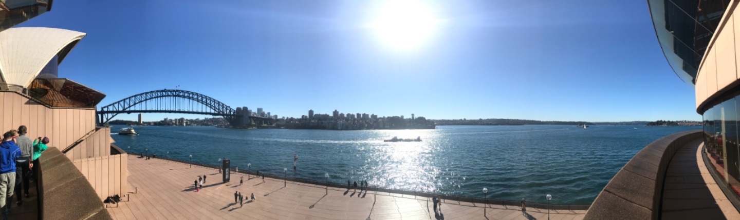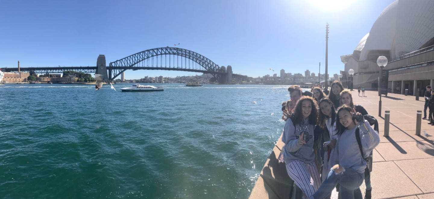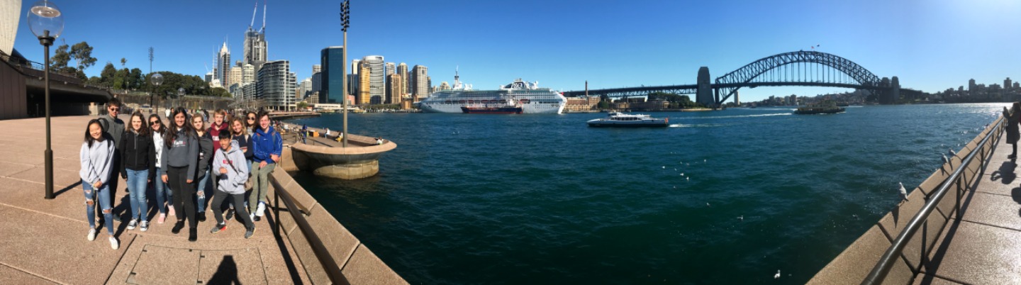 Today, we woke up early(ish) and got ready to go to the Sydney Opera House. After a wonderful breakfast of Nutella and Vegemite on toast, we took the bus to the opera house. When we arrived, we met up with our tour guide who gave us little headsets so he could talk to all of us while we walked around. We got to walk around the inside and saw the main theatre, which was absolutely beautiful with its high ceilings and birch wood paneling. Our very informative guide told us about how they use hardwoods for the floor and soft woods for the ceiling so the room has good acoustics. While he was filling us in on this, some of the orchestra was warming up and playing songs from Harry Potter, which was super cool to hear! After that we walked around the outside and got to see the views of the beautiful harbour. Later, we took a stroll and played some icebreaker games and had lunch in a park, and then headed over to the Sydney Harbor Bridge. We climbed a ridiculous amount of stairs up to one of the pylons where we were rewarded with stunning views of the harbor and the opera house. Afterwards we went to the mall and shopped till we dropped and enjoyed some sushi at the food court, then headed back to the hostel. Overall, it was a very fun, very busy day, and now we’re all going to head to bed to recuperate from all the day’s adventures.