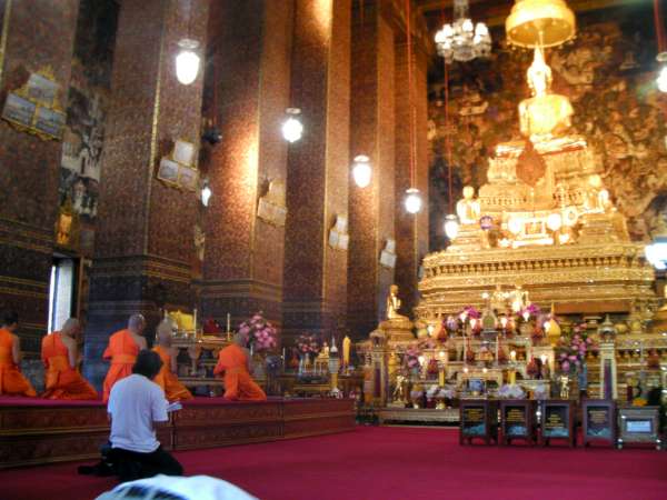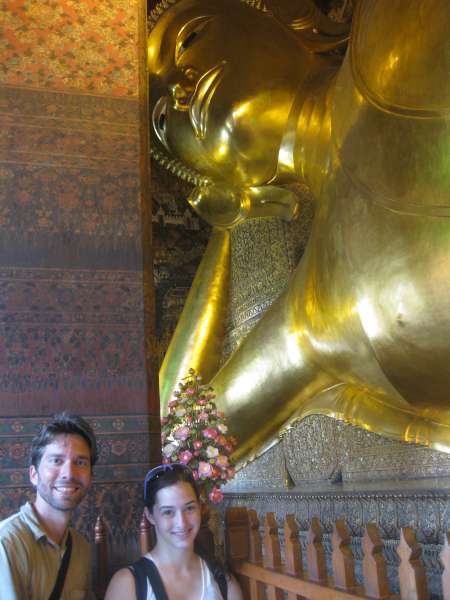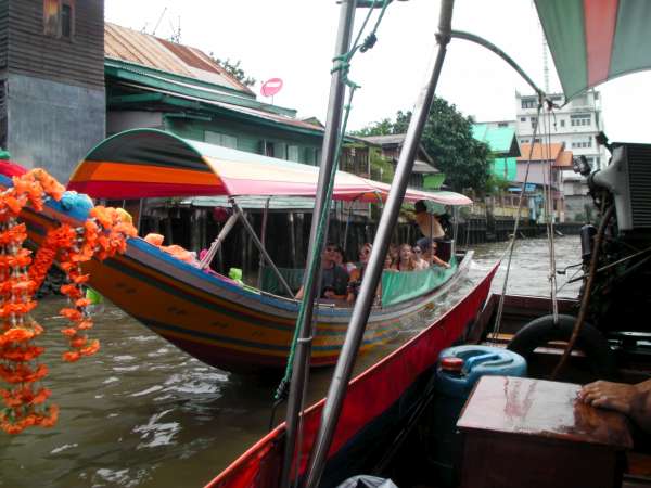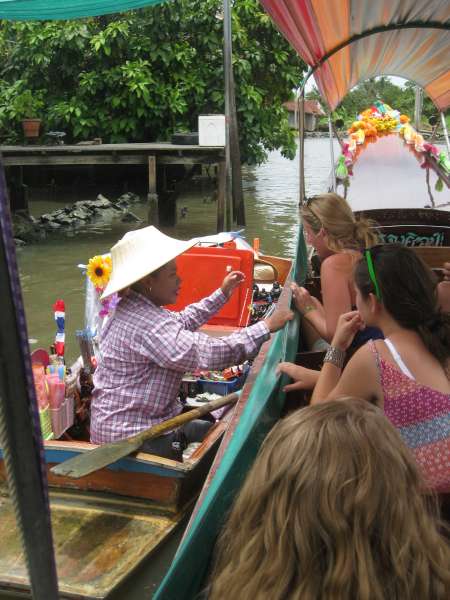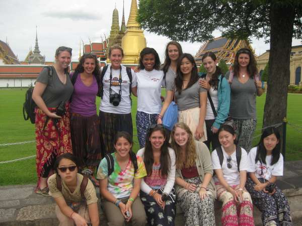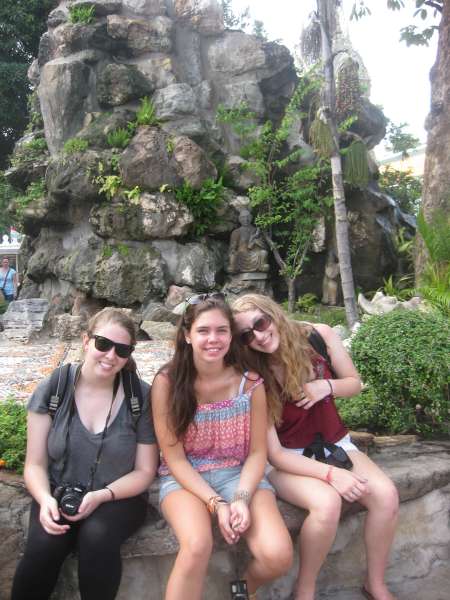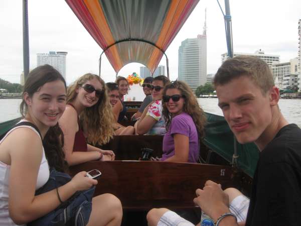 Yesterday we said our goodbyes to the people in the New Life Project, Chumporn and made our way back to Bangkok on a gruelingly long train ride, which we believed to be 6 hours and turned into 9 hours. Today we took a day to tour Bangkok. We had a late start at 10 am. We went on long-tail boat tours through the canals of Bangkok. They were cool, although they were also loud and sprayed water which wasn’t so nice. On the long-tail tour, we stopped and fed some fish from a fish farm that some monks ran. Our next stop was the royal barges. There were huge boats beautifully crafted and were all ore-powered, so they required lots of people to use them. The designs were a mosaic of colorful glass that covered the entire boat. These boats are only used on special occasions like the King’s birthday. Next, we continued on the long-tailed boats and ended up at a little market were people found some stuff to buy. We also ate lunch at a restaurant nearby. After lunch, we walked to the Grand Palace. To walk around the Palace, you had to wear long pants and cover your shoulders. Luckily some people had just bought pants while at the market, others brought pants or a big scarf to tie around their legs, and others didn’t bring anything and didn’t feel like waiting to borrow pants from the palace, so they didn’t go. The Palace itself was gorgeous. Everything was so well made and maintained. All the buildings were done in a mosaic style, and there was tons of gold and Buddha-type sculptures. It was very over the top. Everything appeared to be handcrafted and everything was covered in some art, whether it was sculptures, mosaics, paintings, carvings, and even flowers. One of the buildings was a temple which held the Emerald, Buddha. It was a very large room with lots of decoration and small green Buddha covered in gold on top. After the Grand Palace, we walked to the Wat (temple) Pho, where there was a huge golden reclining Buddha. It took up the entire building in which it lied in. After walking through most people sat down and chatted, a few people continued wandering through and said they found another temple full of monks chanting their prayers. After the Wat Pho people were tired so we went back to the hotel, which ended up being an hour-long taxi ride. Then we ate dinner at an Italian restaurant nearby, which was kind of a refreshing break from all the Thai food. Another successful, yet tiring day in Thailand!