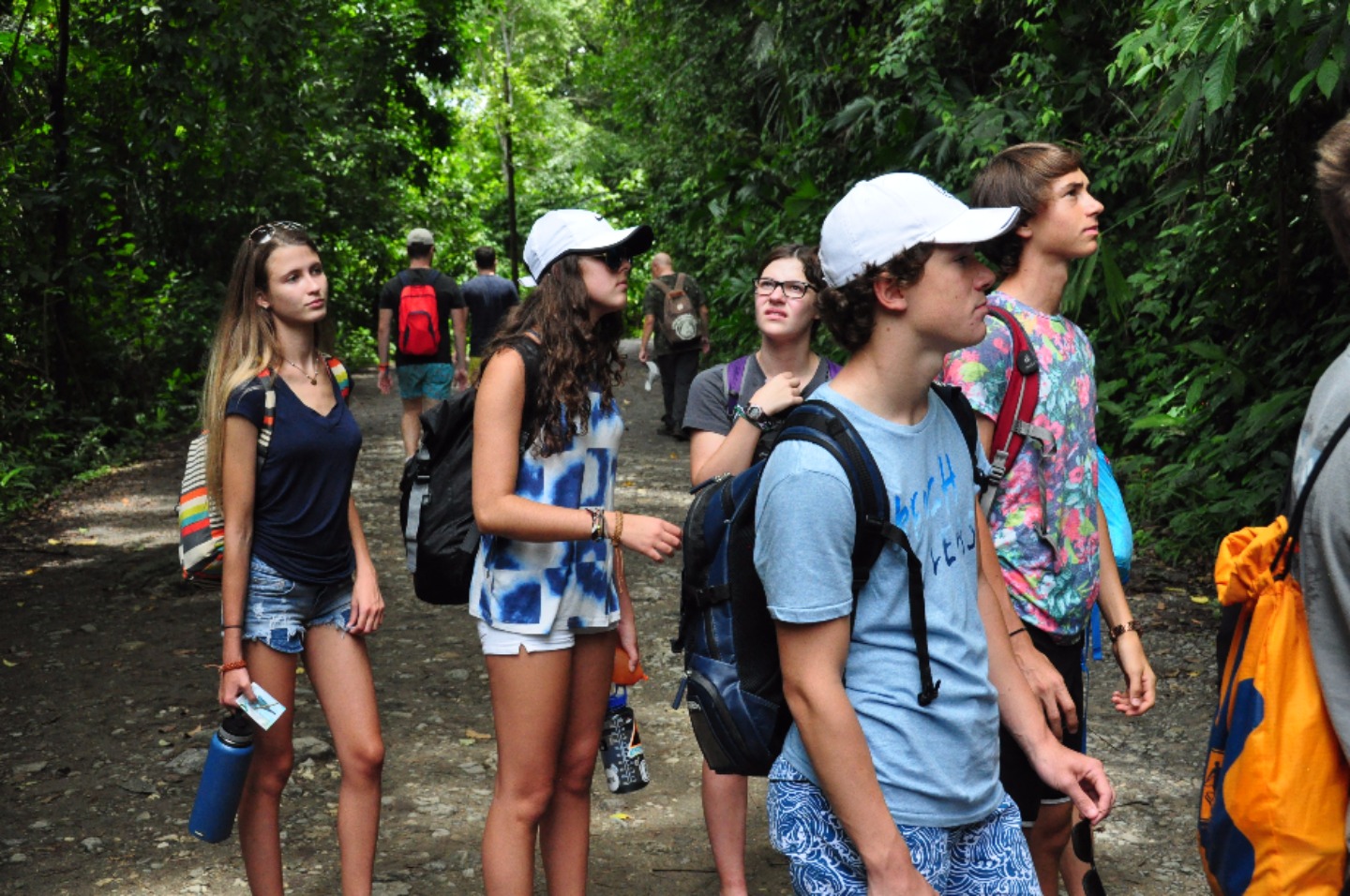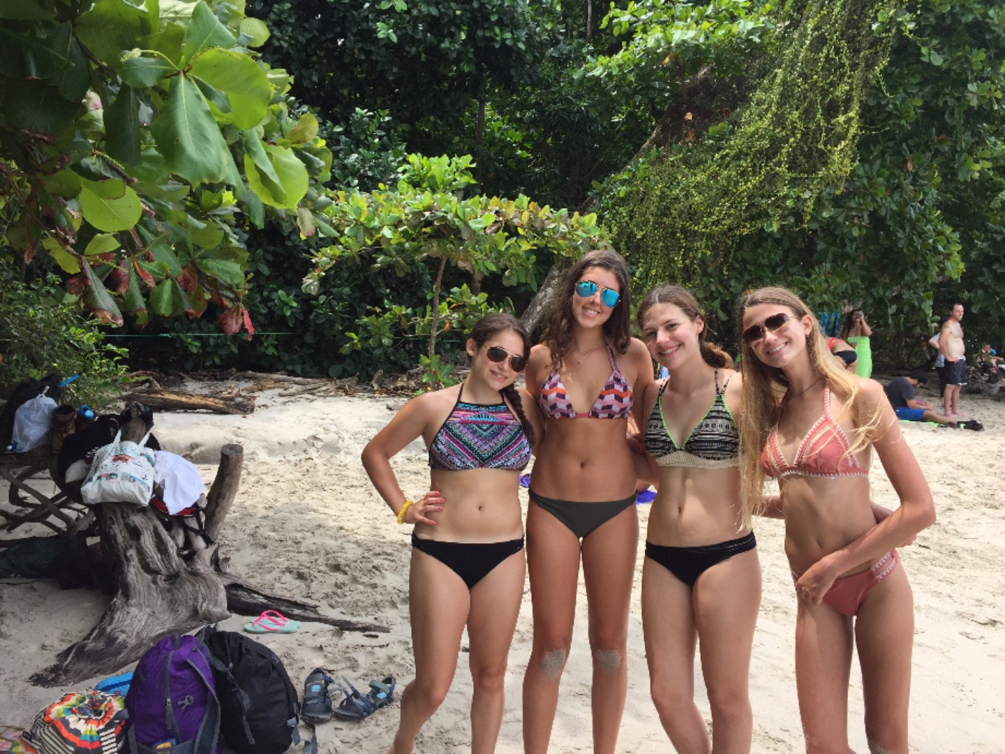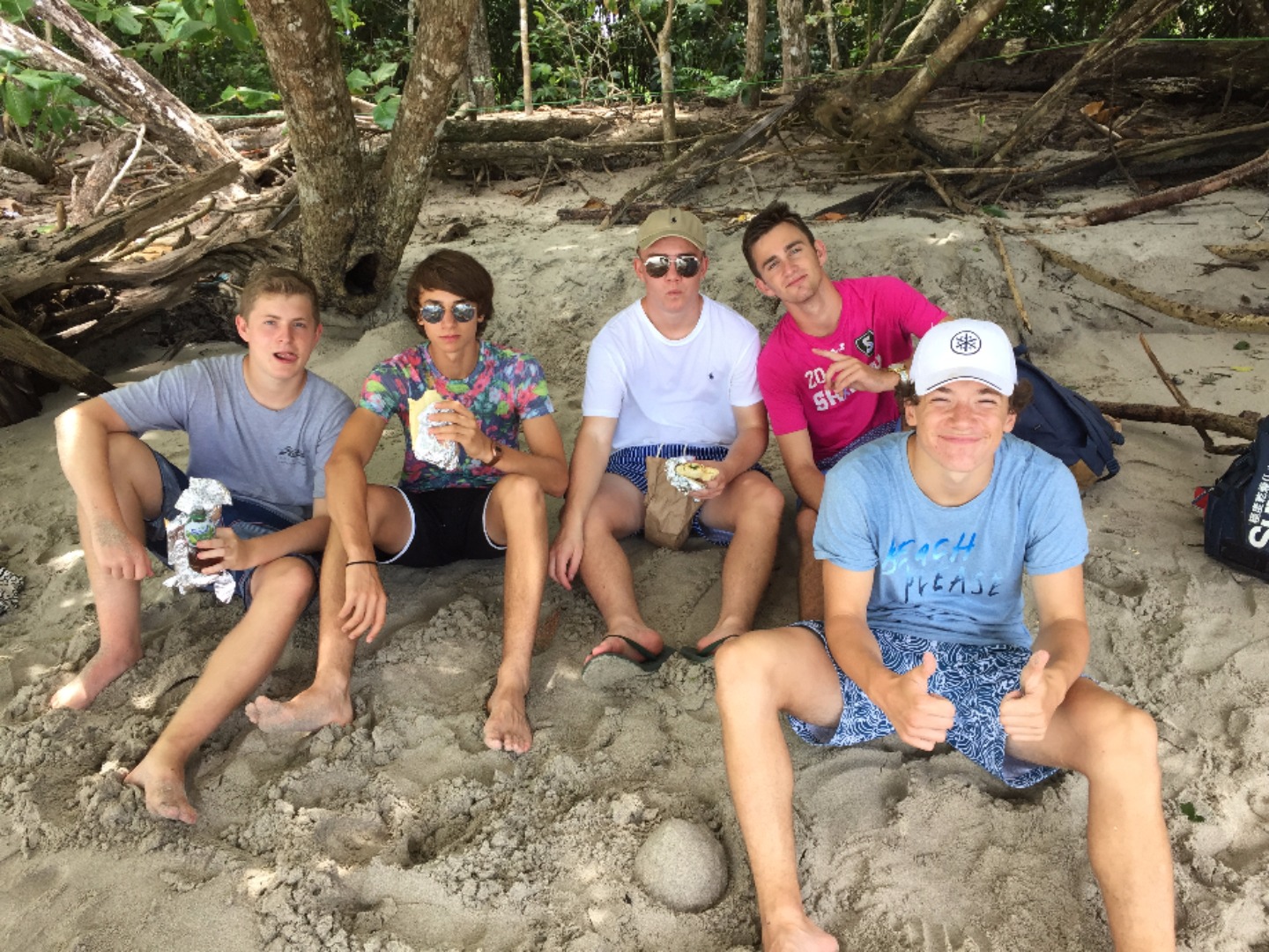 To start the day, we woke up bright and early at 5:30 AM for breakfast which was at 6:30. Breakfast consisted of the same foods that we had the day before. Even though no one was thrilled about the early wake-up call, we were all excited for the relaxing day ahead. After breakfast, we brought all of our things onto the bus and headed over to the West Coast of Costa Rica. About an hour went by, we stopped at a gift shop, and saw some crocodiles in a river below the road. We then headed quickly back to the bus out of fear that we would be pelted with water balloons #boyswillbeboys! After we safely made it to the bus with our souvenirs, we continued our journey to our next hotel. Two and a half more hours on the road led us to our hotel, the Blue Monkey. We dropped our things off and quickly got back on the bus to go to a supermarket and take a nature tour. The tour guide showed us a variety of animals and insects including, monkeys, sloths, spiders, frogs, and iguanas. Once we reached the end of the tour, we found ourselves at the beautiful beaches of West Coast, Costa Rica. Everyone quickly headed for the ocean to cool off and enjoy the huge waves. After the waves strongly pulled us under and broke Rachel’s sunglasses (#sorrymom) and stole Chloe’s, Sarah told the rest of the of the girls, “This is why I suggested putting your sunglasses in your backpacks.” (Backpacks, which were hanging on the trees so the raccoons and monkeys couldn’t eat them) We got out of the water to eat and found ourselves being tormented by a giant iguana. We decided the water was the best place to be and went back to swim some more. After a couple more hours of waves taller than really tall people, we hiked back to the bus and supermarket. Once we bought our cereal and other goodies, we went back to the hotel and had free time. Dinner was at 6:30 and even though we weren’t super hungry due to the mouths full of sand that we ingested, everyone enjoyed either pasta with meat sauce, burgers or quesadillas. To top off our day, we had brownies for dessert and discovered even after showering we still had a beach in our hair. We now have free time before our next exciting day of rafting!
