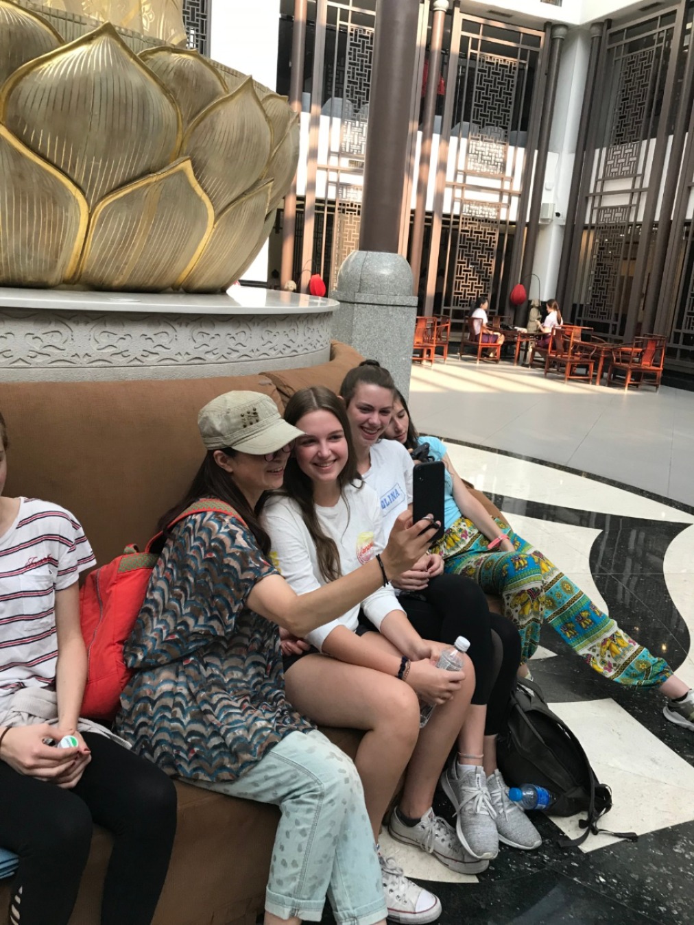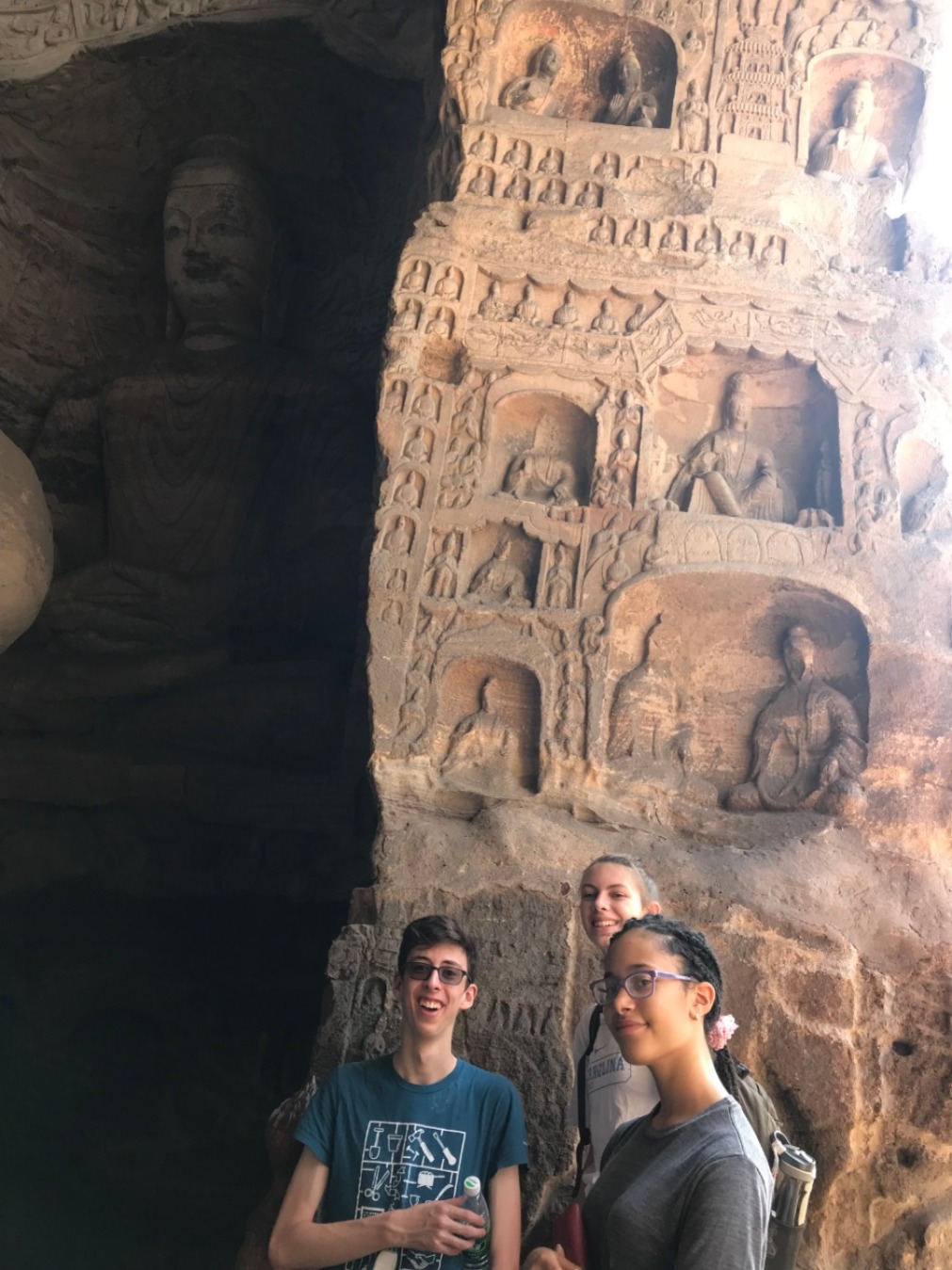 Today was day 15 of our China adventure! We woke up in the nicest hotel so far and had a nice breakfast before heading out on a bus ride to the Buddhist Caves. The caves had many different sculptures and statues inside them, some even with color still intact. They ranged from the size of my hand until 15.6 meters, about the same size as me, stacked ten times. The sculptures had gorgeous colors, such as gold and blue. The hair on the sculptures were blue, representing heaven. The sculptures were also depicted in the same 15 hand motions, each of them containing a different message. A lot of the caves also had huge amounts of holes burrowed into the historical sculptures that were used to support scaffolding during restoration. In my personal opinion, if the ancient people could carve and build the temple, our modern-day historians could salvage it. This made me a bit sad. After the Buddhist caves, we got on the bus and went to lunch. The lunch was fantastic, my favorite dish being very thin, glass noodles. After lunch, we went to the Hanging Monastery. I was also fascinated by the feat of engineering that is the monument hanging off of the side of the mountain. After that, we headed to the train station and boarded our overnight train to Xi’an. I can’t wait to see the Terracotta Warriors and shop at Muslim street!