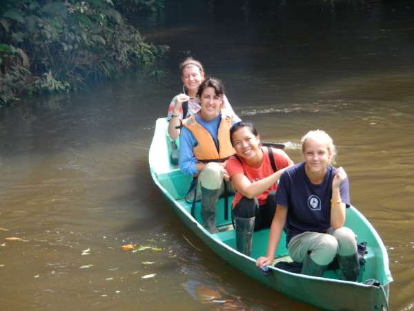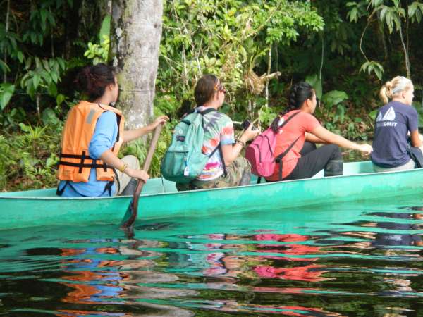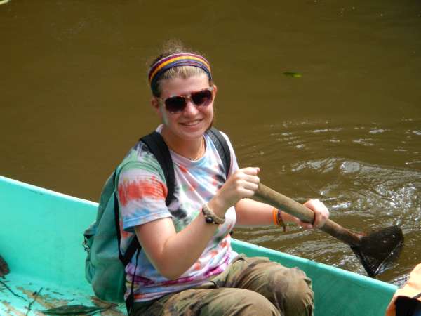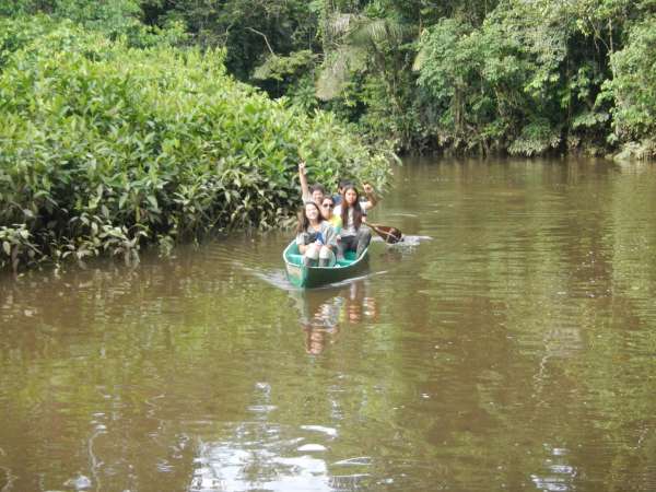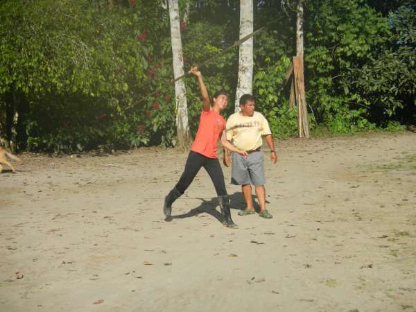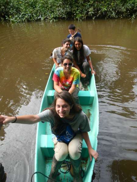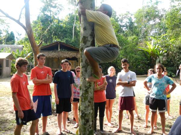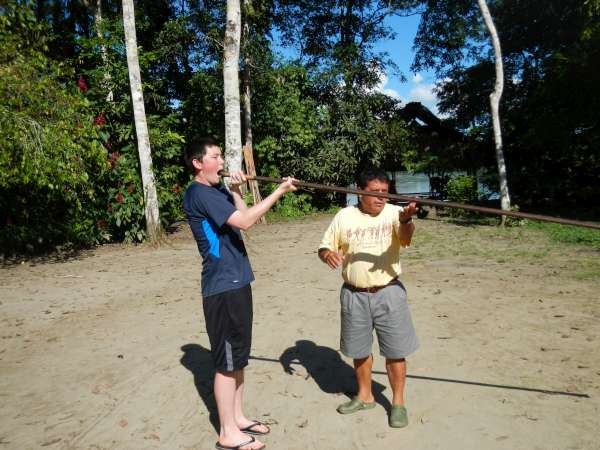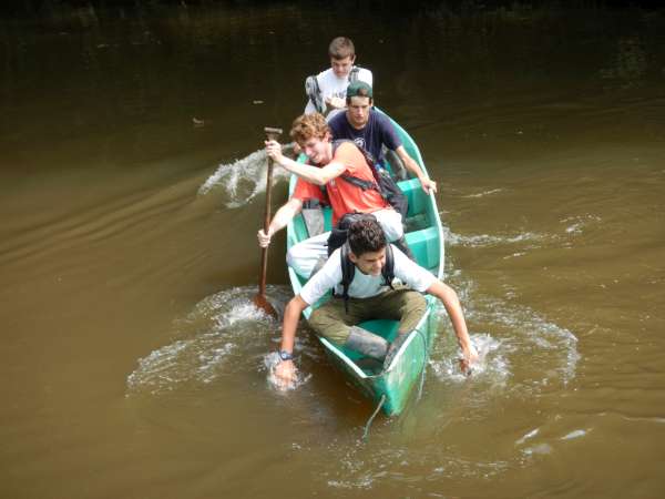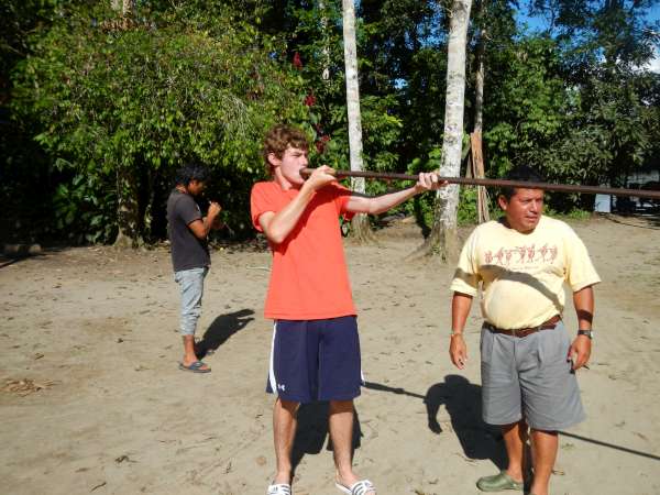 After an early breakfast we boarded the canoes and set out on the river. Naturally, the boat led by yours truly was victorious in reaching the dock first. After waiting for the others to finish, splashing up the river inefficiently, we began our second canoe ride — this time around a quiet lagoon surrounded by exotic jungle plants. We floated around the shore of the lagoon, hoping to find a capybara, but our efforts were futile. Those with enough physical magnificence continued our exploration of the lagoon by hiking along the shore. After, we returned to our original canoes to paddle back up the river to the lodge for lunch. Once we finished a delightful meal, we prepared for our next canoe journey. We put on the appropriate clothing and covered ourselves in bug repellent before setting out on our adventure. This time the trip was much longer. We paddled for about a half an hour until we finally reached our destination; Hectors island in the middle of the Napo River. We disembarked from our vessels and lined up for our next activities: blow darts and spear throwing. Our objective was to hit a target 15 to 20 feet away. Lisa won the blow dart competition but for the spear throwing there was no clear winner. Our next activity was tree climbing using an Amazon technique which was truly difficult. No one besides Javier and Liz made it more than four feet off the ground. After a quick soccer match, we returned to the hostel via motorized canoe, because no one had the energy to paddle back upstream. We took showers, put on clean clothes and went to dinner. After dinner we had a bonfire and roasted marshmallows while Hector told us scary stories about the Jungle. We eventually went back to our rooms to get some well needed rest, although a few were a bit freaked out falling asleep after hearing the stories by the campfire!