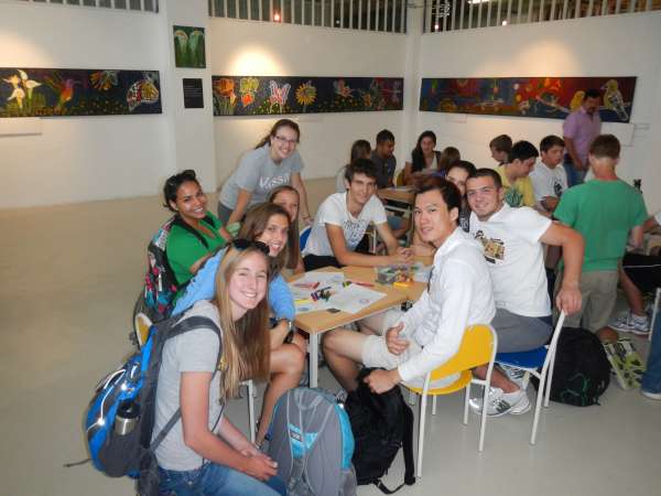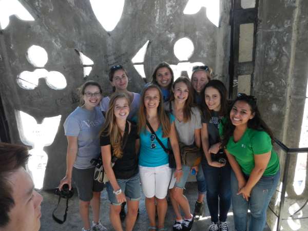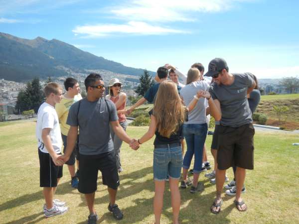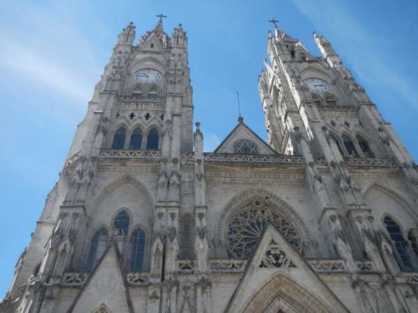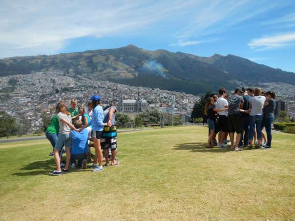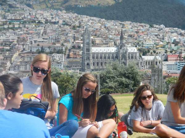 After a long-awaited journey, our first day finally began this morning at 8:00 when we woke up to sunny weather and an action-packed day ahead of us in downtown Quito! For a simple start to the day, we ate an American style breakfast (cereal does not go well with hot milk, we found out though.) Following breakfast, we headed over to the Itchimbia Park where we played some “ice breaker” games in the park with a breathtaking view of the surrounding mountains and city. After a quick peek at local artist’s paintings, we headed off on an afternoon tour of Quito. We started the tour off by stopping in at a little ice cream shop and bakery – “the best in the neighborhood,” according to our hilarious tour guide. We continued our journey by climbing the horrifyingly steep spiral stairs and narrow ladders up to the top of the bell tower and a high church tower of the Gothic cathedral “Basilica del Voto Nacional” finding that the terrifying climb was worth the incredibly rewarding breathtaking views from the top. Next stop? The Plaza Grande, which included the president’s palace and statues. From there we stopped at the La Compania de Jesus, an old church built in 1605 with 54 kilos of gold. The paintings were fascinating, but a bit creepy. Overall it was very interesting. Our last stop was the Plaza of San Francisco where we did a little shopping and then headed home to get ready for an authentic Ecuadorian dinner. We then packed and went to sleep for a super early departure for the Galapagos!
