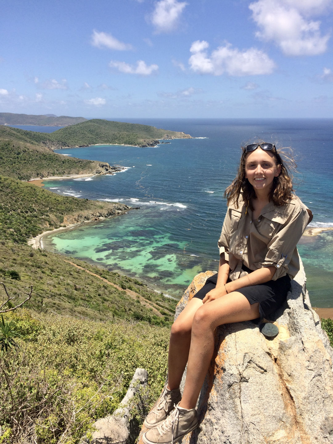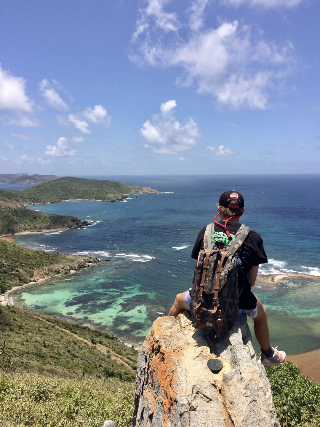 We had a slow cereal breakfast underway, and as we finished, we found ourselves motoring into a beautiful anchorage beneath a beautiful steep peak. This was Spyglass hill, which is named after its history as a lookout for pirates and even the British as they defended their fleet and the islands. We ferried ashore to a little dock in the corner of the anchorage and followed the road as far as we could until we found a tiny trail that cut up the side of the mountain. The trail was overgrown and had not been hiked by GoBeyond for a couple of years, so it was a totally new adventure as we rediscovered Spyglass together. It was a tough climb; cacti, rocks, and steep slopes set us out of breath by the top of it, but upon reaching the peak rock, we were breath taken by the beauty of the islands.