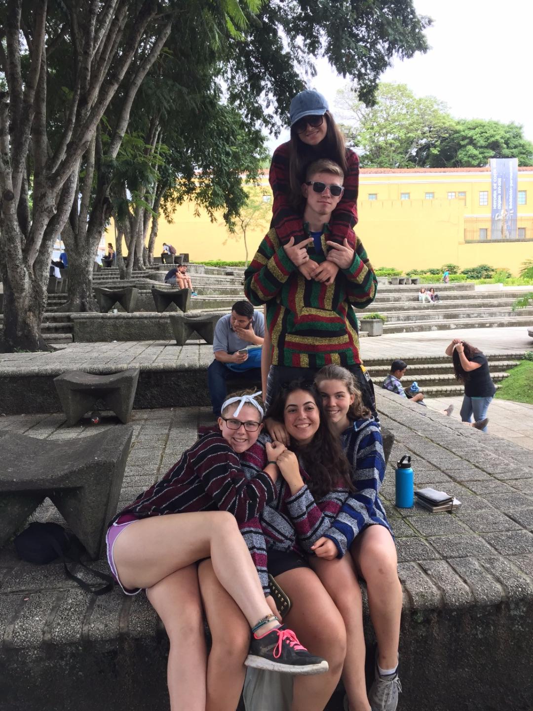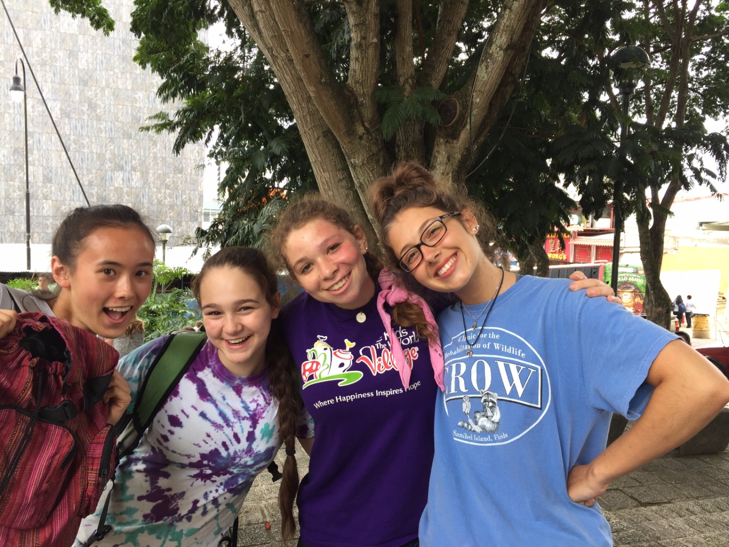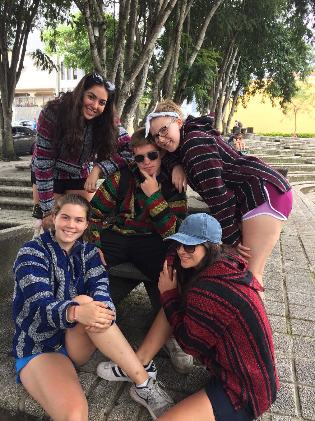 Today we went to La Carpio where we painted another mural for the entrance of the Costa Rican Humanitarian Foundation building. The other group was shoveling rocks and sand to help clean up from the amazing wall project! Then we went to the market in San Jose where we bought all sorts of touristy things like jackets and other cool Costa Rican souvenirs. We all practiced our bargaining skills, and some of us managed to bring the price down to one-third of the original price! A few of us were given free rings made from the extra pieces of one of the metal workers. We then ran to the supermercado to get slushies and Trits (our favorite ice cream) and ate them on the bus. On our way back, we sang and danced together on the bus. Now we’re hoping to go to the soccer field in our neighborhood to hang out a bit before we head back to dinner with our host families. Buenas Noches!