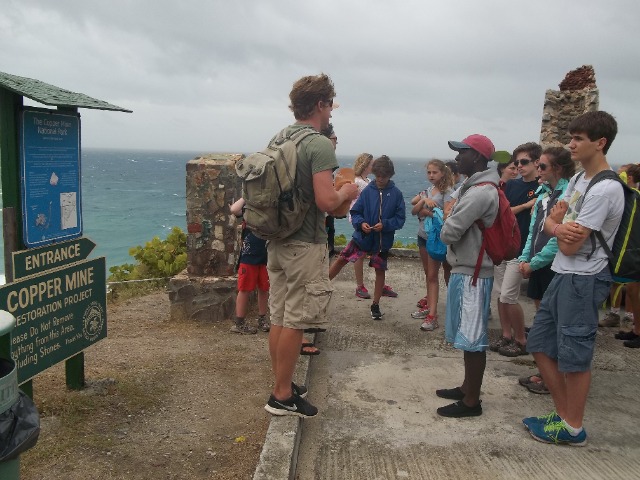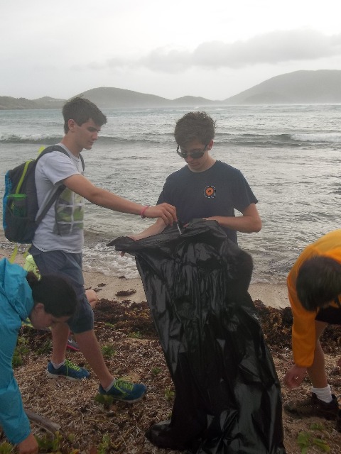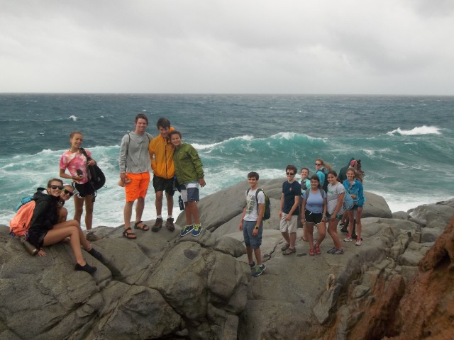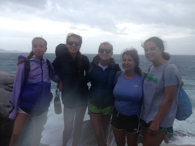 Today we didn’t wake up as early as we normally do because everyone was really tired from yesterdays activities.  But despite the late start, we did twice as much. As soon as everyone got up, we started preparing breakfast, which was scrambled eggs and salsa. After breakfast, the Quest students joined us, and we all got ready and went to wait on the bus that took us to the Coppermine National Park. The Coppermine is one of the most beautiful sights that a human being can ever witness on this wonderful planet of ours. I’ve lived in the BVI my whole life, and I’ve never seen something this spectacular. The weather from tropical storm Bertha was very extreme; it was like there was a fierce battle between the earth, wind, and water, as the waves crashed against the giant boulders and sometimes covered them. We got to go down and climb the boulders, and we also took some very cool selfies. By the time we left the Coppermine, we were soaked. After the Coppermine, we then proceeded to a nearby beach to do a clean-up. While on the beach, tropical storm Bertha came back for her revenge and started attacking us with an onslaught of rain. At this point, we started to walk back towards home but ended up stopping at this very cool place where there was a mini-golf course. There we took shelter and played a game or two in the rain which made the golfing much more fun and challenging. We also played this cool game called ninja. After the bus came and we got back to the boat, we went to get lunch at a restaurant called the Bath and Turtle. The food was pretty good. After lunch, we did some shopping in a gift shop and a supermarket that is close by. Later in the afternoon, we got ready to go the islands number one coolest spot, The Baths. There we did some exploring through the spaces of the boulders. I find it cool how the boulders fit together like a giant puzzle. Finally, we left The Baths and came back to our boat where we took some showers and started preparing dinner. If you had to ask me, today was a very eventful and awesome day.
