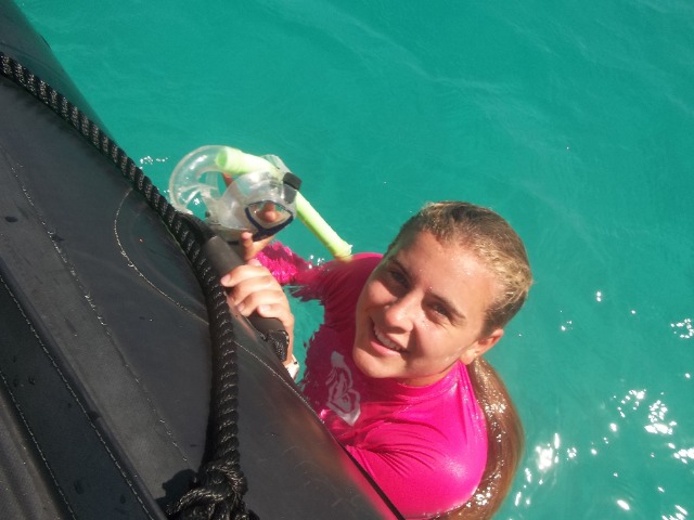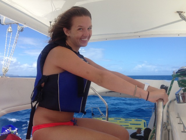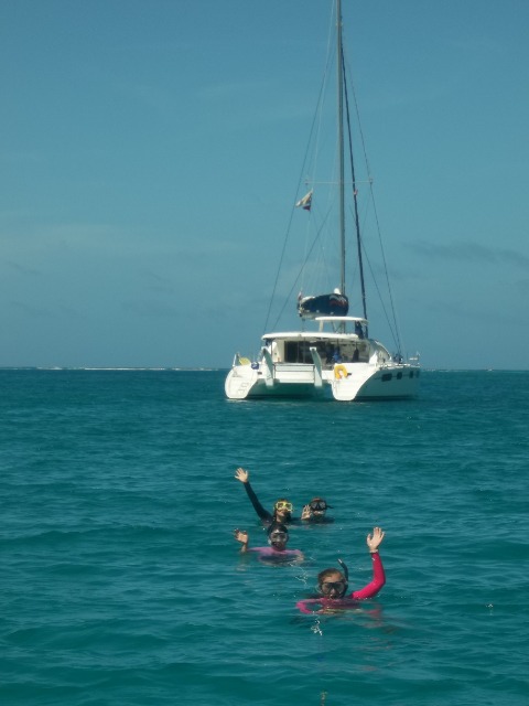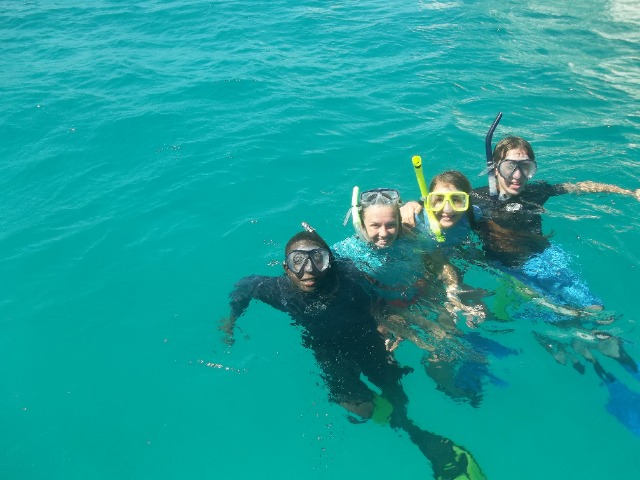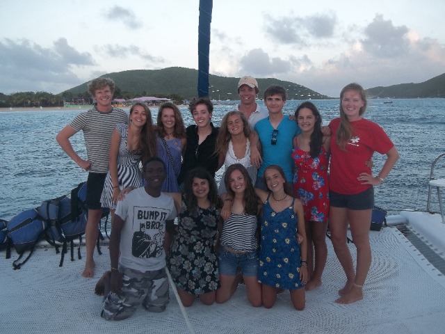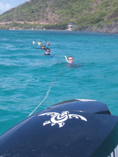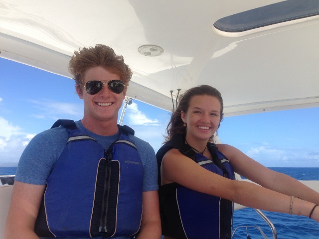 Today we awoke to the smell of pancakes wafting through Catalinaville. It was a surprise to everyone with cereal having been on the menu for this morning’s breakfast and because it was skipper Elliot acting as chef in the galley- thanks, Elliot! After our leisurely breakfast at The Dogs, we dropped the mooring ball and raised sail for Deep Bay. I was on the helm for some of the strongest winds we’ve seen thus far. It was a nice sail with only one short squall. Once we made it to Vixen Point, where all of ActionQuest was staying, we dropped the sail, David and Gwen picked up moire dinghies, and we motored on to Deep Bay. In Deep Bay, we dropped anchor, had our lunch prepared by Sophie and Lily, and then welcomed the Quest students onto our boat for our afternoon activity, turtle tagging! We used a method where you get dragged behind a dinghy on a tow line, and when you see a turtle, you dive down to catch it. It was hard, and we didn’t catch any turtles, but it was still fun. Now we are motoring back to Vixen Point to join ActionQuest for an all program BBQ and dance.