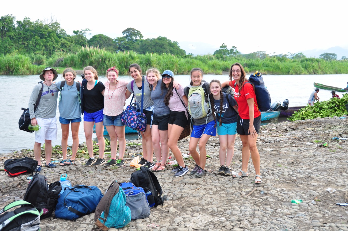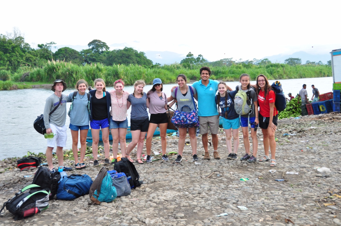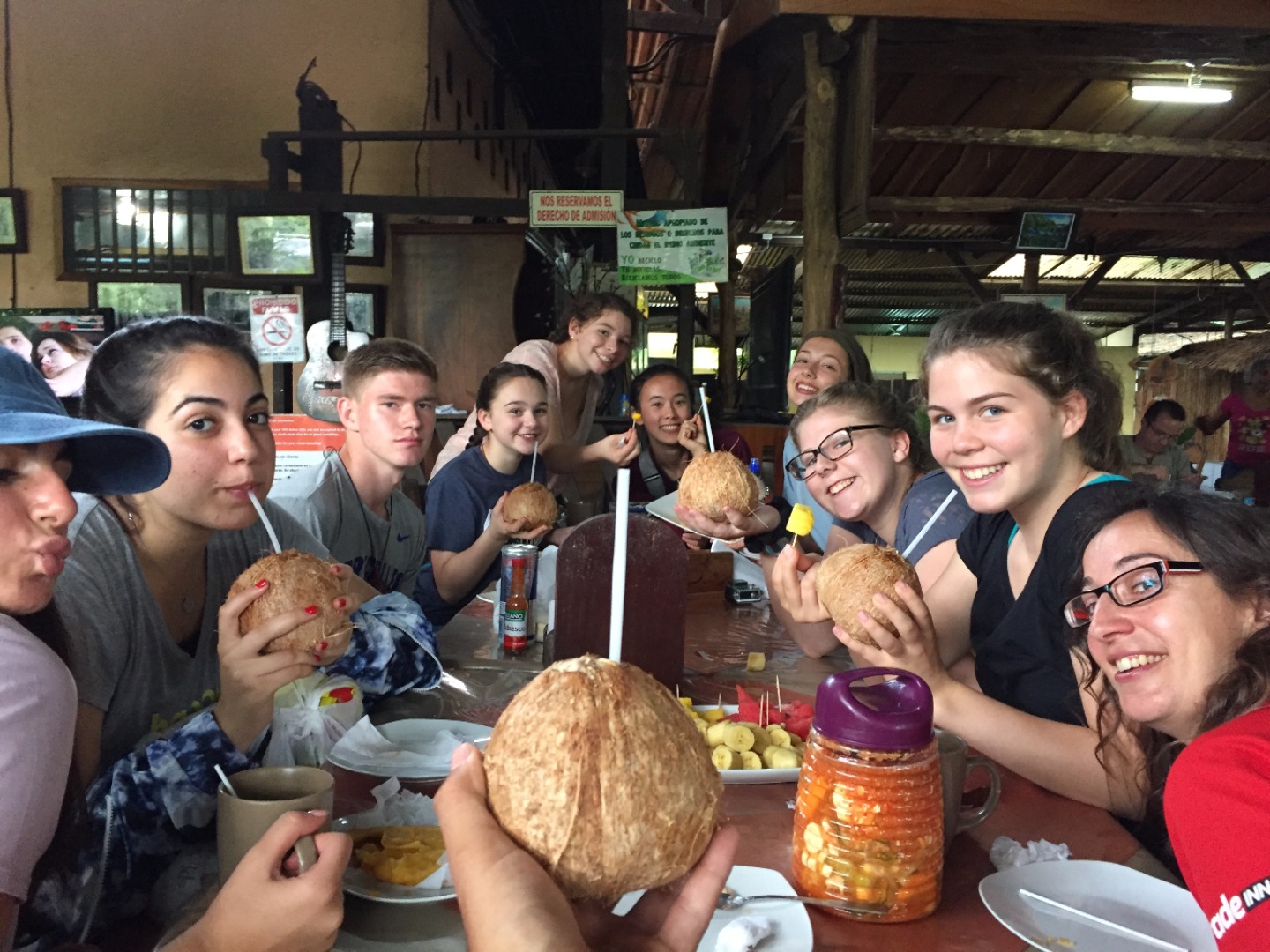Today we woke up bright and early at the glorious hour of 6:00 am and headed out on the road towards the Cabecar tribe, the first of the two indigenous groups we would visit throughout the day. The first segment of our journey was largely filled with sleeping in contorted positions on the bus, with a bit of chatting, singing, and more than a little laughing mixed in. As one might imagine, the white-bread-and-cream-cheese sandwiches the hotel had made us for a to-go breakfast were neither filling nor particularly appetizing, so we decided to stop for a better brunch. As luck would have it, however, traffic had other ideas, and we sat in essentially the same spot for over an hour. The bright side to this annoying set back was that when someone, who shall remain nameless, desperately needed the bathroom, that someone was able to hop off the bus, do what they needed to in the privacy of the woods, and hop right back on! We eventually made it to a small restaurant/market, where those of us who hadn’t used the woods used the bathroom, and we all filled up on empanadas, got our caffeine fix with some “cafe con leche,” and quenched our thirst with coconuts or “pipas”. We headed back on the bus, and after what felt like a few years, reached the river we needed to cross to get to the Cabecar community. There, we said goodbye to Henry, our driver, and hopped on the back of what was essentially a pickup truck, which made its way across the shallow river and then began the bumpy ride through the woods to the Cabecar village. When we got there, we saw three different presentations. The first was on how the women of the village turn tree bark into material that used to be made into clothing and is now used for crafts, and the second was on how they turned a specific plant into a string. We were able to try both, which was fun, but hard work. The last presentation was on how the women make dyes from leaves, and when that was finished, we were encouraged to use the different colored dyes to paint squares of the finished craft material that we were given. We then had the chance to buy crafts and jewelry from the different villagers, all of which were incredibly beautiful. We won’t spoil what was there, just in case anyone purchased gifts!