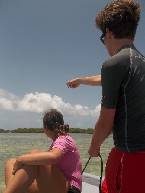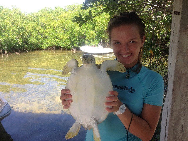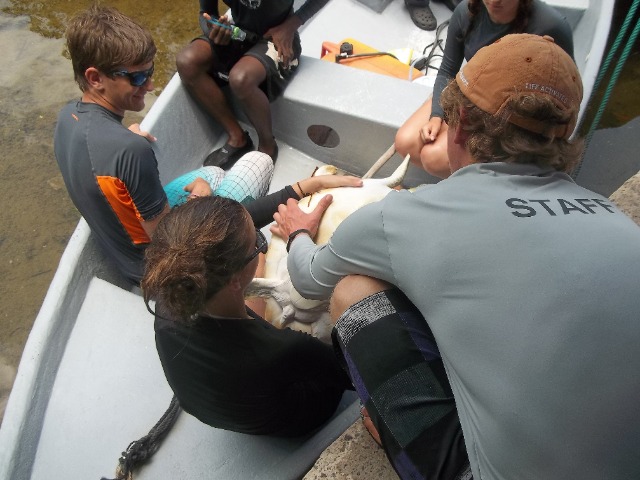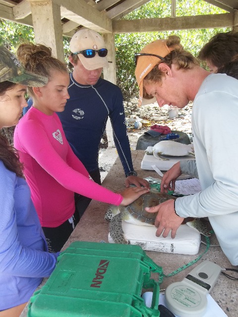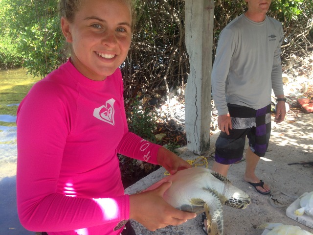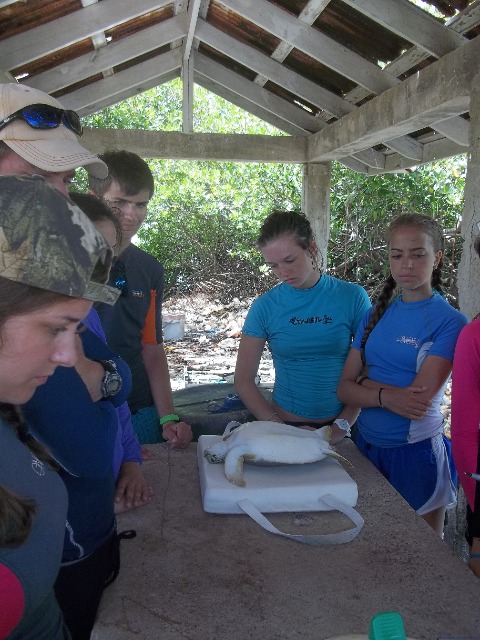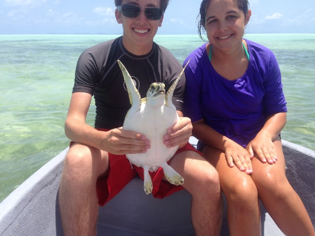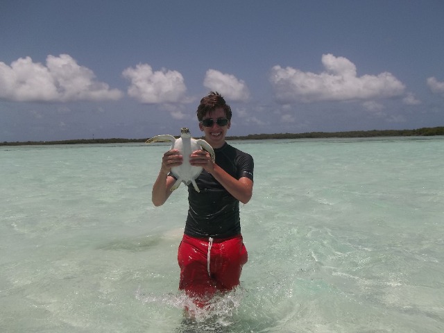 We used a technique called rodeo style where you chase the turtle until it gets tired and then you literally belly flop on them and grab them. After chasing down the first turtle for a while, Ashley jumped in and missed and same with Bonnie and I. When I jumped in the second time, I finally grabbed the turtle and pulled him up! I named him Andy Chet. Andy for Anna and Chet (short for Chester) for Bonnie’s male alter ego. On our way back, we saw a second turtle that basically jumped into our boat as David said. We all know he just didn’t want Elliot to get mad at him for letting us go for another one. In the next group, Jacob and Lily both caught one. Lily named hers Captain and he was giant. I still don’t know how she lifted him up. Jacob named his Yurtle the Turtle. The last group caught 3 turtles; two caught by Justin named Flash and Admiral and one caught by Kat named Bubba. Doing measurements on the turtles was sort of challenging because they try to bite you, but after a while, it gets easier to handle them. Bonnie, Sophie, Drew, and Rami released them after they had all been tagged. After that, we went to go get money off of the boat and then we had some shore time. We also watched a documentary on turtles in the hotel on shore. Even though it was interesting, unfortunately about four people fell asleep, including myself (its been a long day). After the movie, we got back to the boat and showered and I almost made Lily cry. She is very afraid and sharks and jellyfish so I pretended that I saw a shark and some jellyfish in the water and I started screaming. She almost peed her pants she was so scared. It made my day. We had a delicious dinner with some French fries that Elliot bought us for winning yesterdays scavenger hunt. The fries made a great day end even better!!