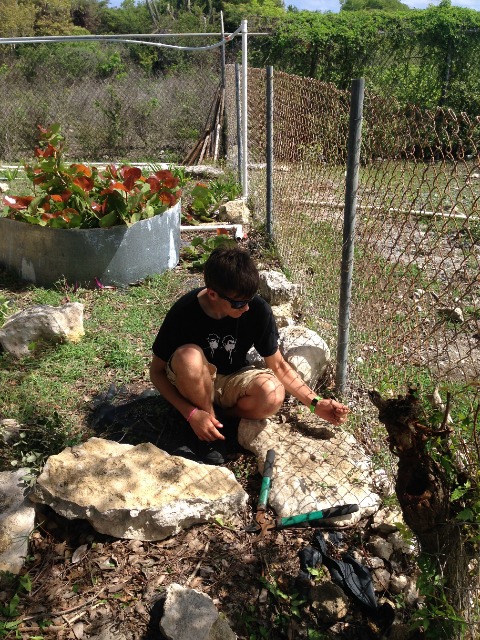 Our day started just like any other; with the song “Brand New Day” playing as we woke up. After our breakfast, we were told that our destination was the Anegada Rock Iguana Headstart Facility. The facility is made to help protect the dwindling population of the Anegada Rock Iguana. This iguana is very special because of its unique genetic makeup. It is theorized that all species of iguana in the Caribbean evolved from that species. The facility held iguanas in many cages in a relatively small compound. Our role was to help feed the iguanas and do some general maintenance. Feeding the iguanas proved to be a rather difficult task as many were waiting for the chance to escape and bolted for the door the moment we opened it. After feeding, a few of us got to work on weeding the facility along with its fences. What seemed like a rather easy task of pulling out weeds turned out to be a lot harder because many had roots that extended very deep into the ground. I even ended up pulling out a root system that went four and a half feet down! After a long morning at the facility, we set sail for the Marina Cay. Unfortunately, we set sail just as a storm came in. The sail was very rough, but by the end of the trip, the weather had calmed. After dropping anchor, we hurried through dinner to make it to a meeting with the entire fleet. We all listened to a recording of a speech that proved to be inspiring and emotional for us all. Although our itinerary was small, we made the best of our day, whether it be by napping through the storm, listening to an inspiring speech or enjoying getting our hands dirty at the iguana facility.