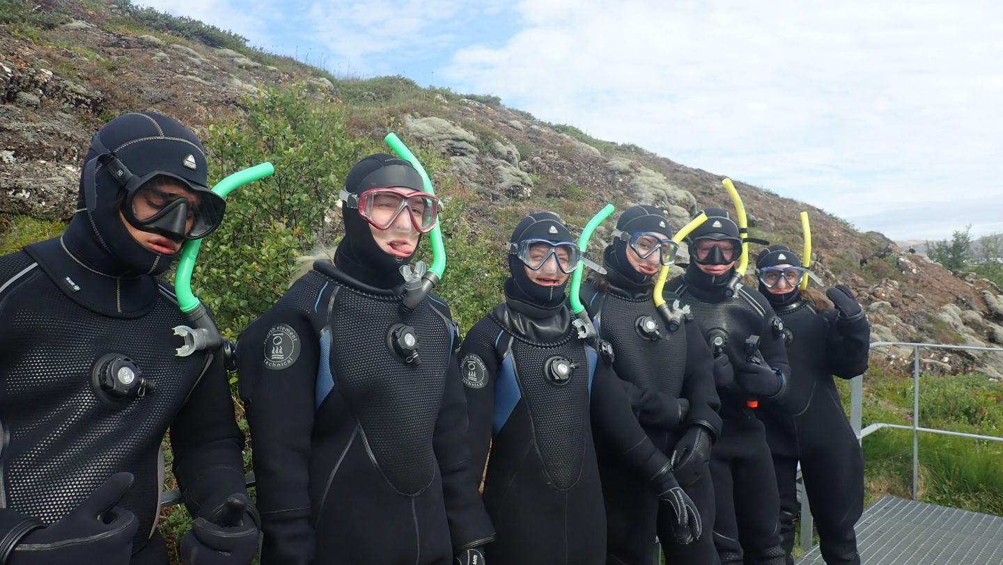 Today started off early, with us waking up at 6:50. We hopped on the adventure bus, and I had a lovely nap, and then we arrived at the dressing area for snorkeling. We all wore a layer of thermals, and they gave us a fleece-lined jumpsuit to put on before the dry suit. They did not have our exact sizes, and I was put in an XXL long dry suit that made me feel like a Teletubby, and Ava and Zora had to squeeze into a child’s extra small. We got all suited up with our head caps and gloves and walked over to the entrance of the fissure. I worked up a sweat walking over in the dry suit, so once we got in the water, I felt very refreshed, aside from my lips, which became numb. The fissure was beautiful and so clear, and my XXL created a nice air bubble that allowed me to float very easily. Others were not so lucky. Leigh and Thea had rips in their dry suit, so water got in, and they were very cold. Luckily, the swim was only 30 minutes, and we got hot chocolate and cookies after and changed into dry clothes, so it was nice and toasty. After swimming, we ate our sandwich wraps and went back on the bus to drive through the Golden Circle. The first stop was a beautiful waterfall with two very different viewpoints, so that was very cool to see. We then went to the geyser, which, although it smelled like eggs, erupted 3 or 4 times while we were there, which was cool. Then we got back to our hostel and had tomato soup and garlic bread, and Kimmi and Robbie surprised us with some KFC for after, as well as a slice of chocolate cake. We then started writing nice things about each of the group members and will probably end the day with a nice bounce on the jump pillow.