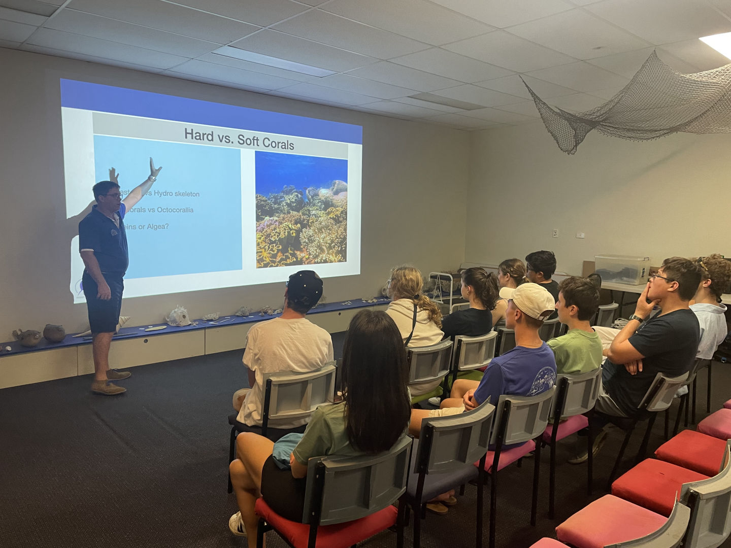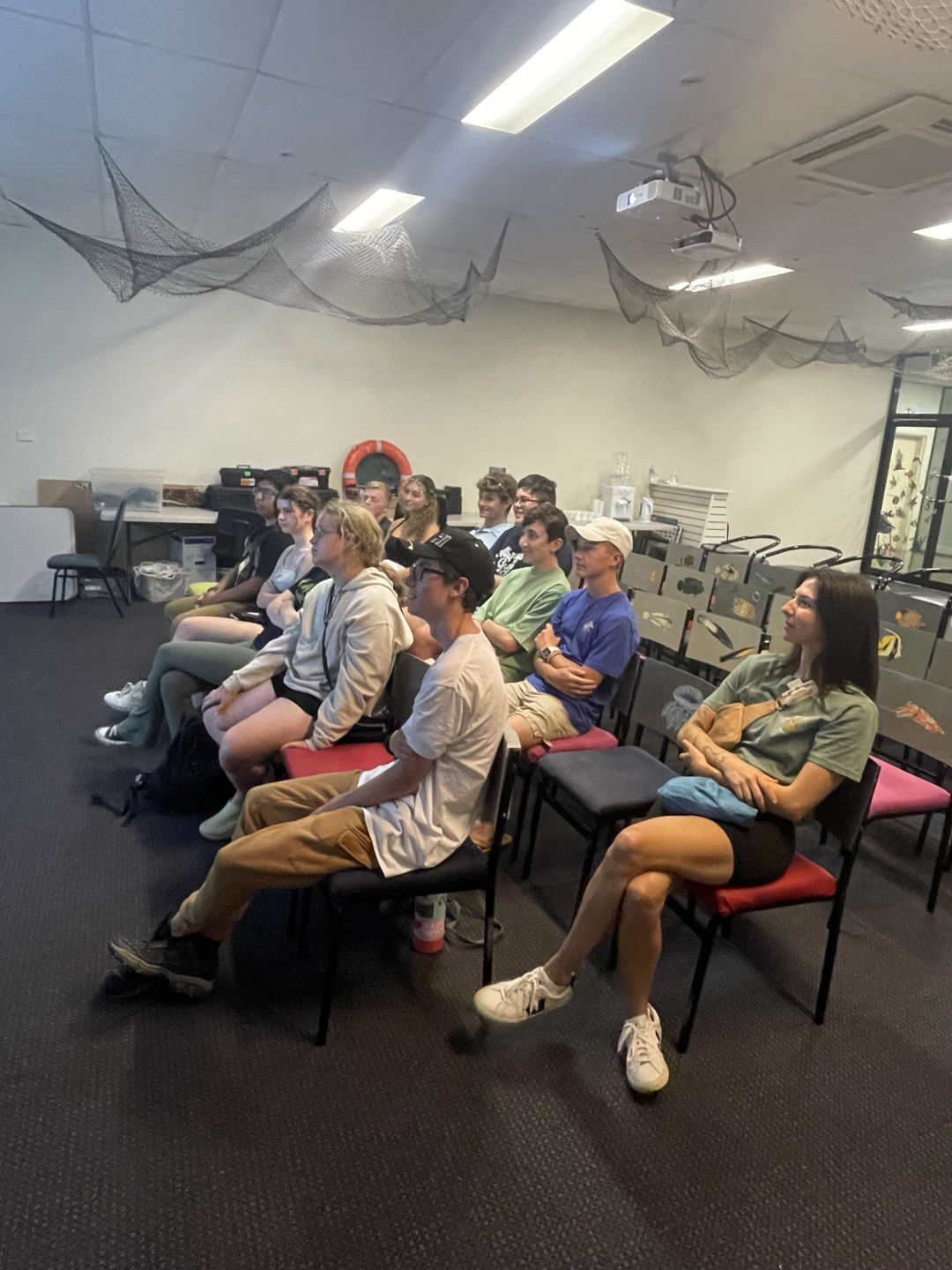 This morning was a lovely, slow morning for us in the Kuranda rainforest. After two full and satisfying days of volunteer work with a local non-profit called EnviroCare, which repairs and nurtures the local rainforest with a variety of projects, we all enjoyed sleeping in an extra hour until 8:30. Steph and I woke up a little earlier than the students. We drank tea on the porch of our rainforest cabin surrounded by the green trees and our newest friends, the brush turkeys. See photo 1. We all met for breakfast at 9:15, where we had cereal and a few quick things before we caught our shuttle from Kuranda, left the rainforest, and drove into Cairns to Motel Nomad. They graciously let us check in early, so we settled into our rooms for a little while, then walked to a nearby shopping center to have lunch. After lunch, we headed back to the hotel, did laundry, played frisbee, and got ready to go learn about the Great Barrier Reef and its creatures with a cool group called Marine Discoveries (see photos 2 and 3). We took the bus from our hotel, swung by the dive shop ProDive to get fitted for gear and finalize the paperwork for our live aboard dive trip starting tomorrow, and headed to Marine Discoveries. We learned about the great expanse of the reef, what corals are, and how important they are to the marine environment, as well as a ton of the invertebrates, fish, sharks, turtles, and more that we might see while we are diving. We are really excited about our weekend trip with ProDive, and we can’t wait to see what underwater wonders are waiting for us! To end our day, we took the bus back, ordered pizza, and got packed for our early (6 a.m.!) pick-up tomorrow to go diving!