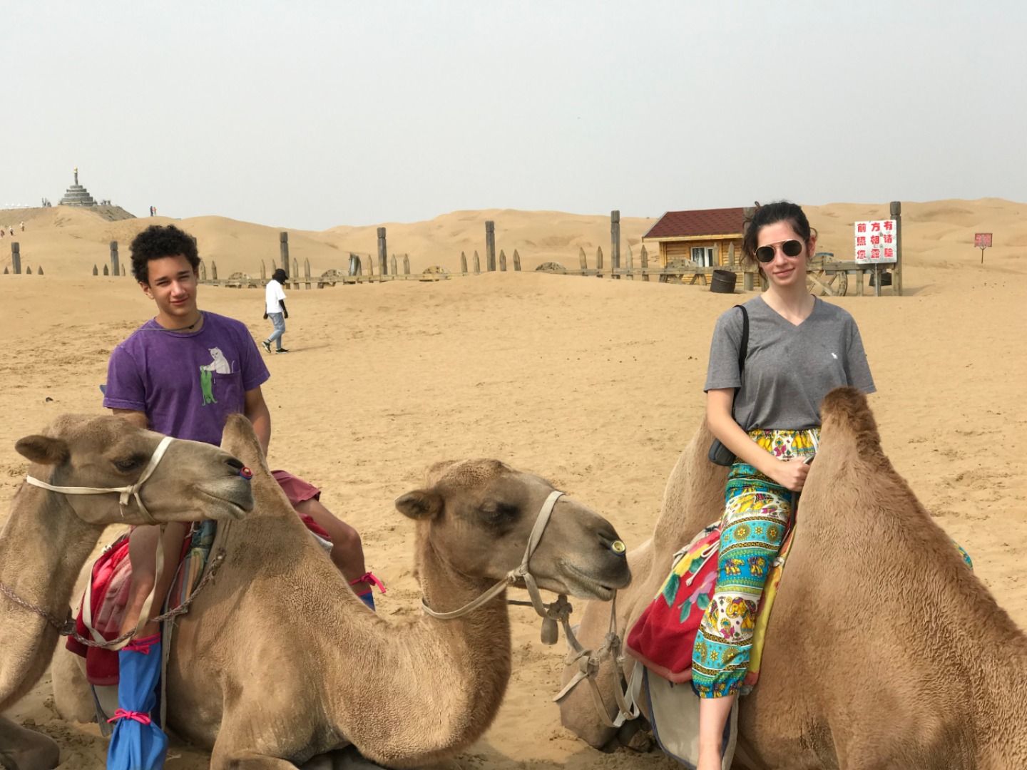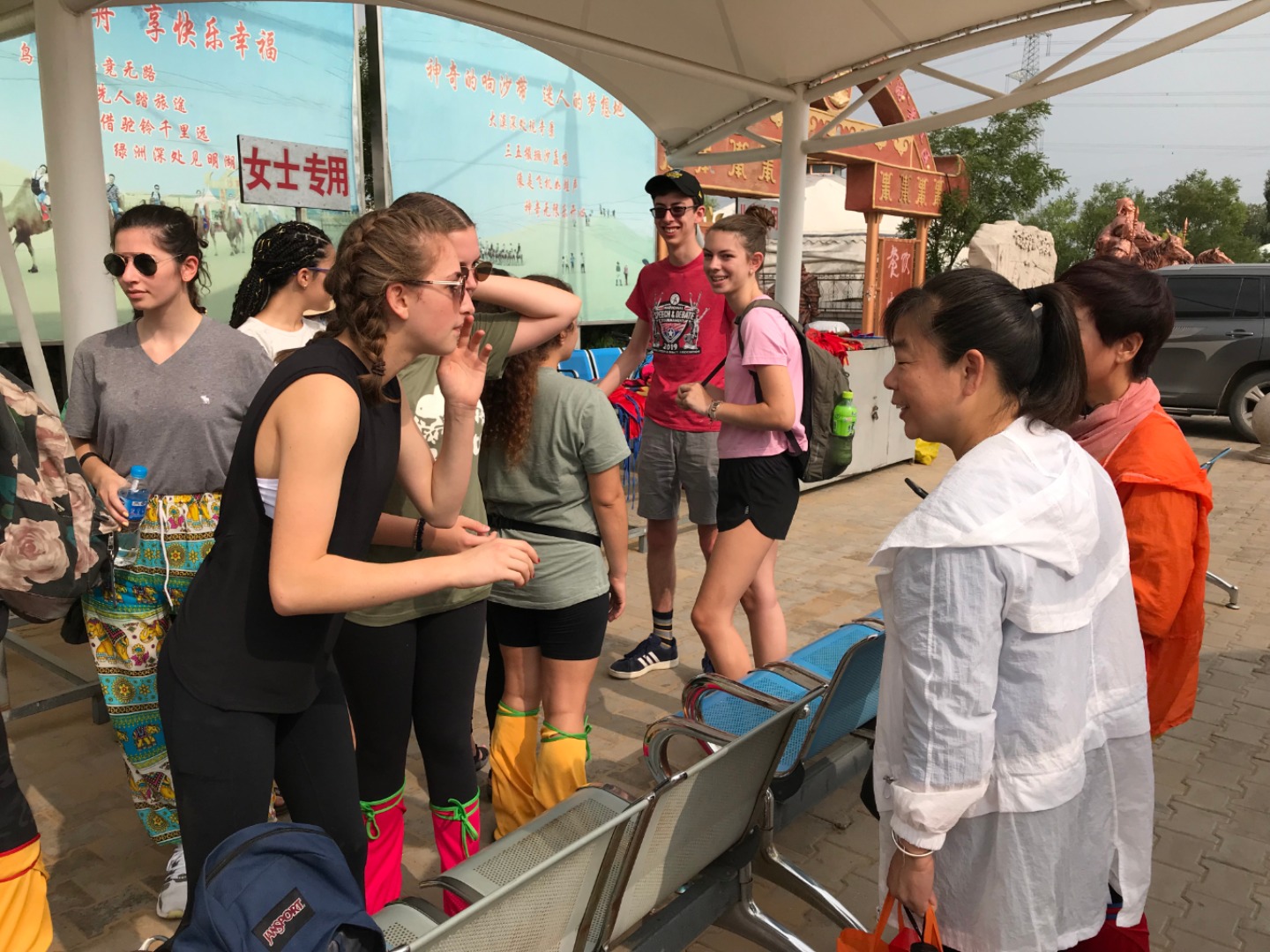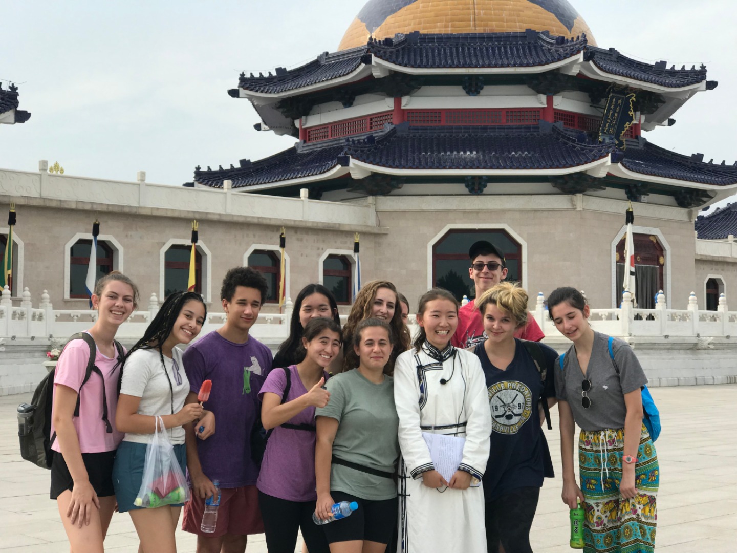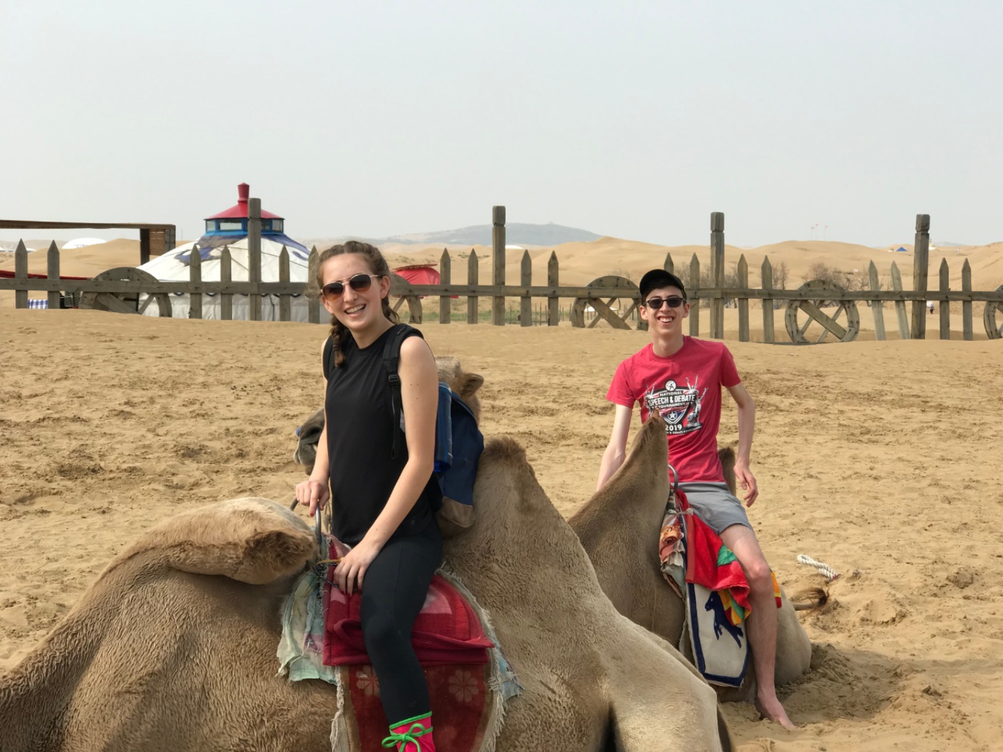 This morning, we met in the lobby at 7:30 am. During the morning, we visited a sand gorge in the seventh largest desert in China spanning nearly 400km (250 miles) in length. We saw camels (some of us even rode them!), climbed up to a Mongolian Buddhist monument, proceeded to slide down the side of a dune, and then visited the tomb of Genghis Khan. Genghis Khan’s empire spanned at one point 3.5x the size of modern China (2x the size of Russia) and was incredibly male-dominated. We thought it was interesting that Mongolian and Chinese culture still retained a lot of their male-oriented culture, something that we are not used to. On our way back, we had some deep conversations about this, and it was very interesting to learn. We then went to a fast-food restaurant to eat something quick before bed. We will be headed back to service tomorrow morning so it’s time for bed now! Good night!
