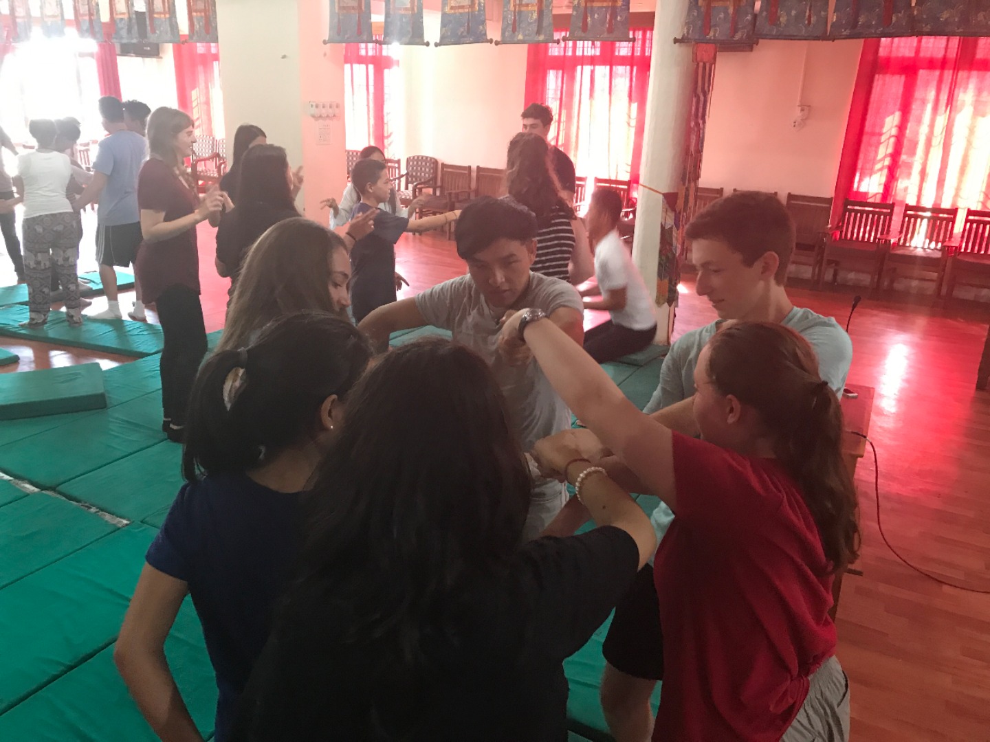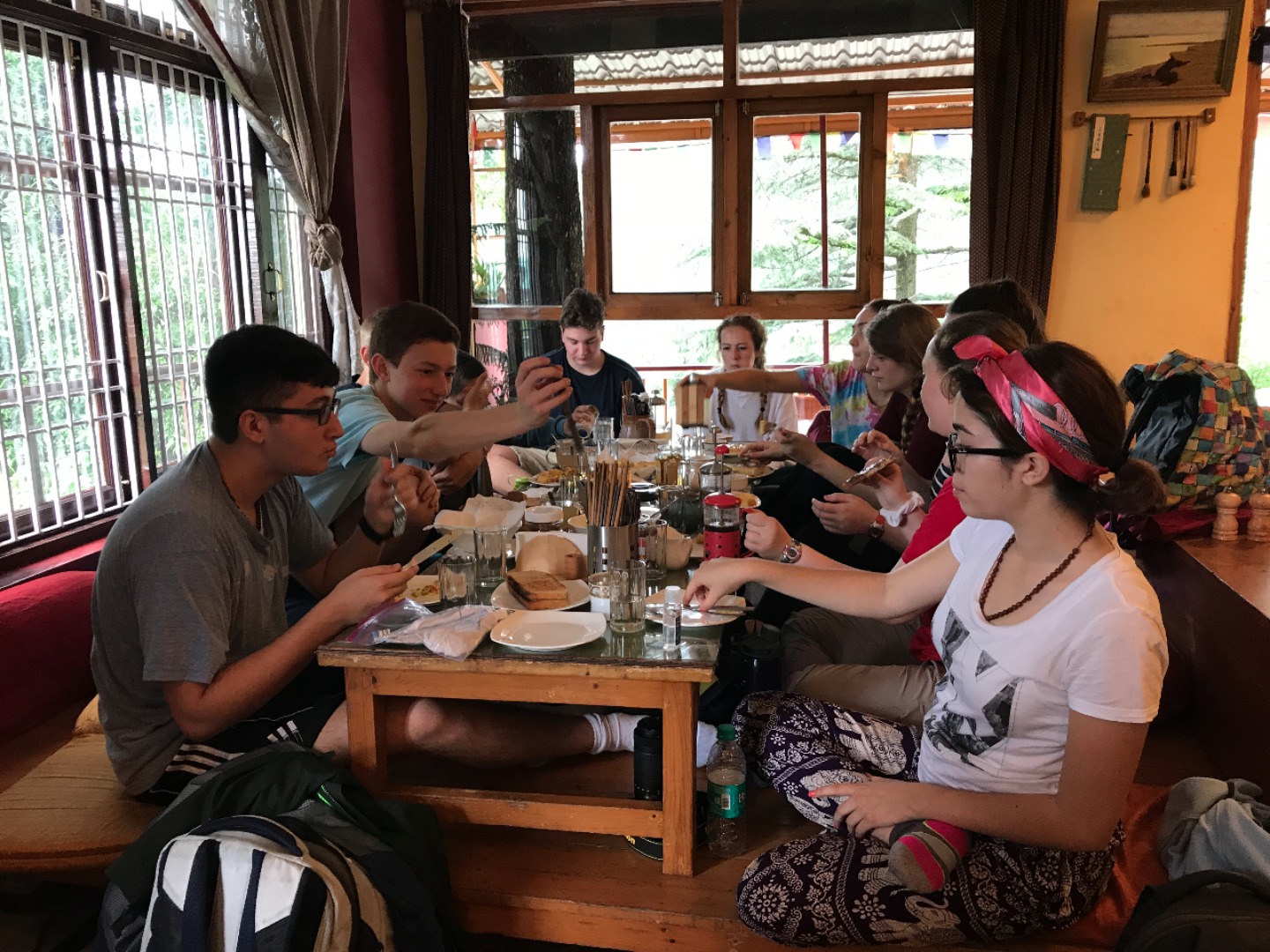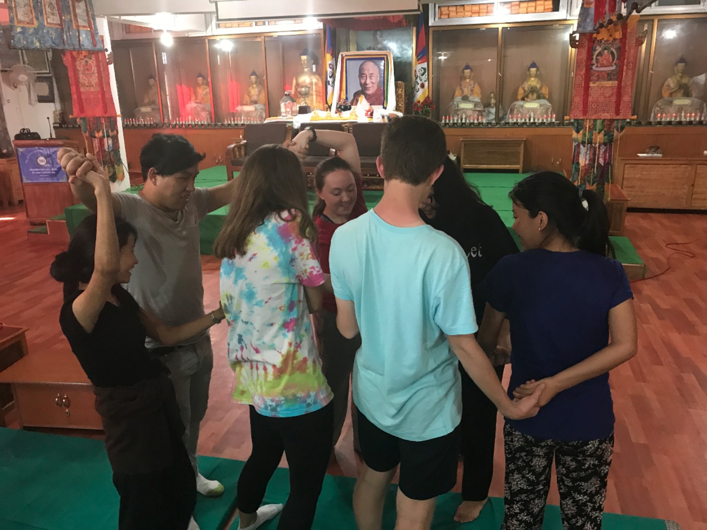 Eventually, we headed back into town and sat down at a cafe. I asked her what she wanted to work on regarding her English studies and she happily whipped out a book written by the Dalai Lama. She flipped to her bookmark and started reading aloud. As we went along, we paused to work on the pronunciation of difficult words and she would often stop me and ask for a definition. It was frustrating when I couldn’t think of a straightforward synonym, when the words she wanted to learn were completely abstract concepts, and when the language barrier seemed insurmountable. However, once I began to get the hang of things and was able to give an explanation that clicked, seeing the look of sudden realization and excitement on her face was incredible! Before I knew it, it was time to say goodbye to our partners for the day and head over to Men-Tsee-Khang. We all sat in a circle and introduced ourselves to the group of astrology and medical students. We heard more stories from people about their journey over to India, as well as from those that have lived here their entire lives. We wanted to hear all the amazing things they had to say, and they were also very curious about our lives back home. The games we played together to get to know one another and give them a chance to practice their English were loads of fun. By the end, everyone was cracking up and feeling much more comfortable. Once we had finished up our volunteer work for the day, we headed out for dinner and team building. It was a great first day of work and an exciting taste of what’s to come in these next two weeks.