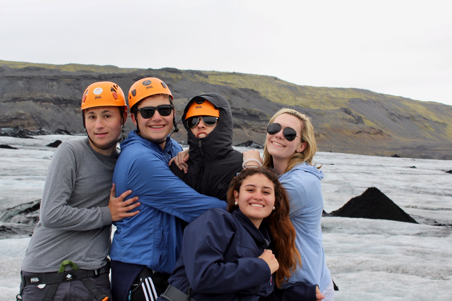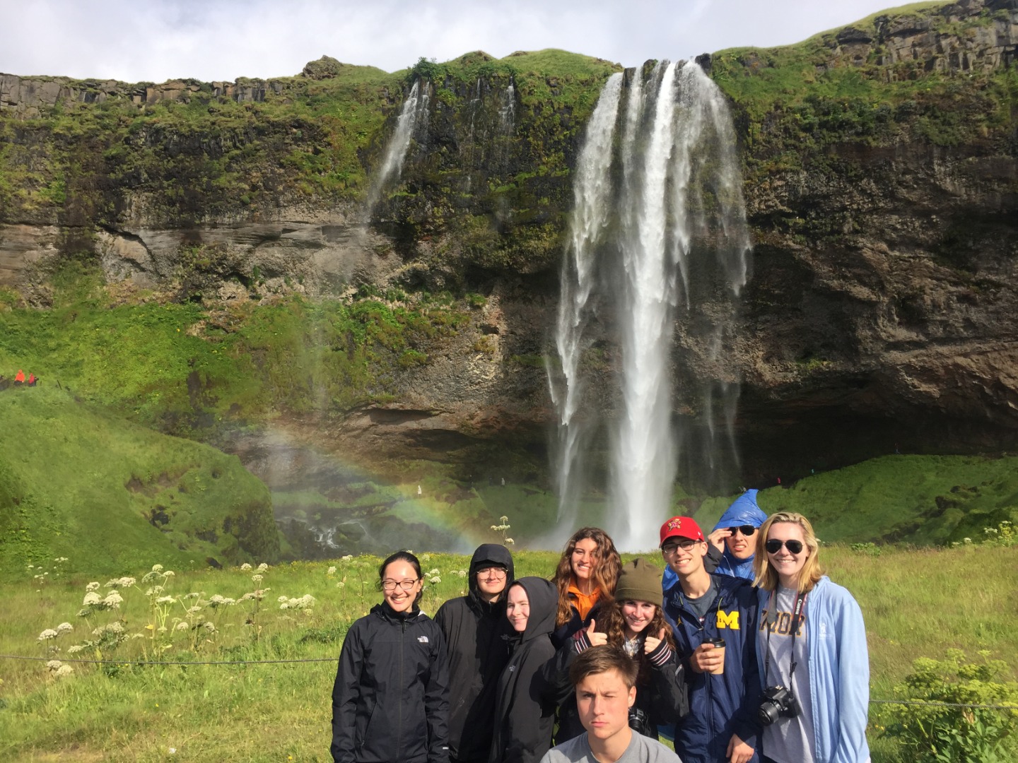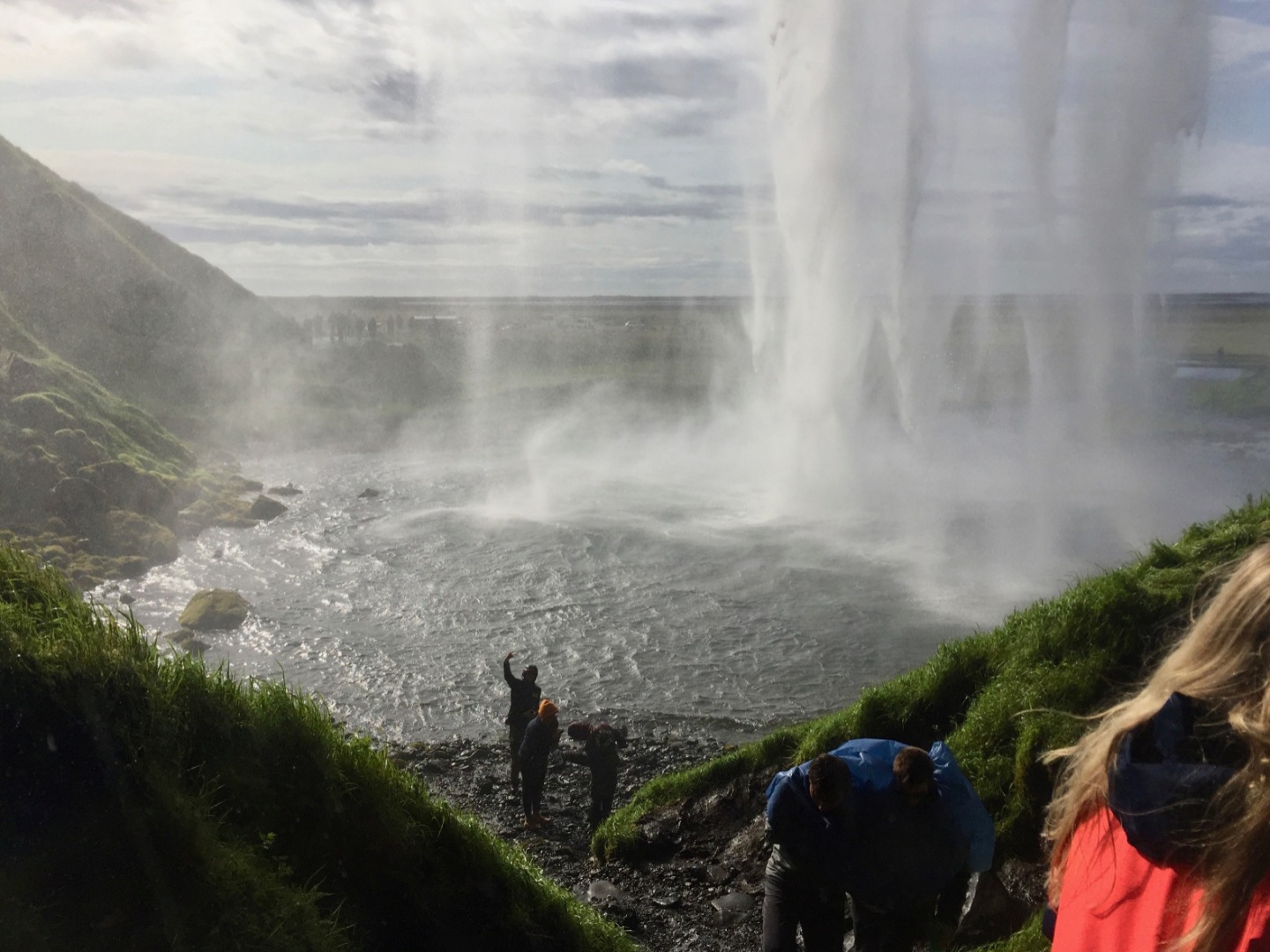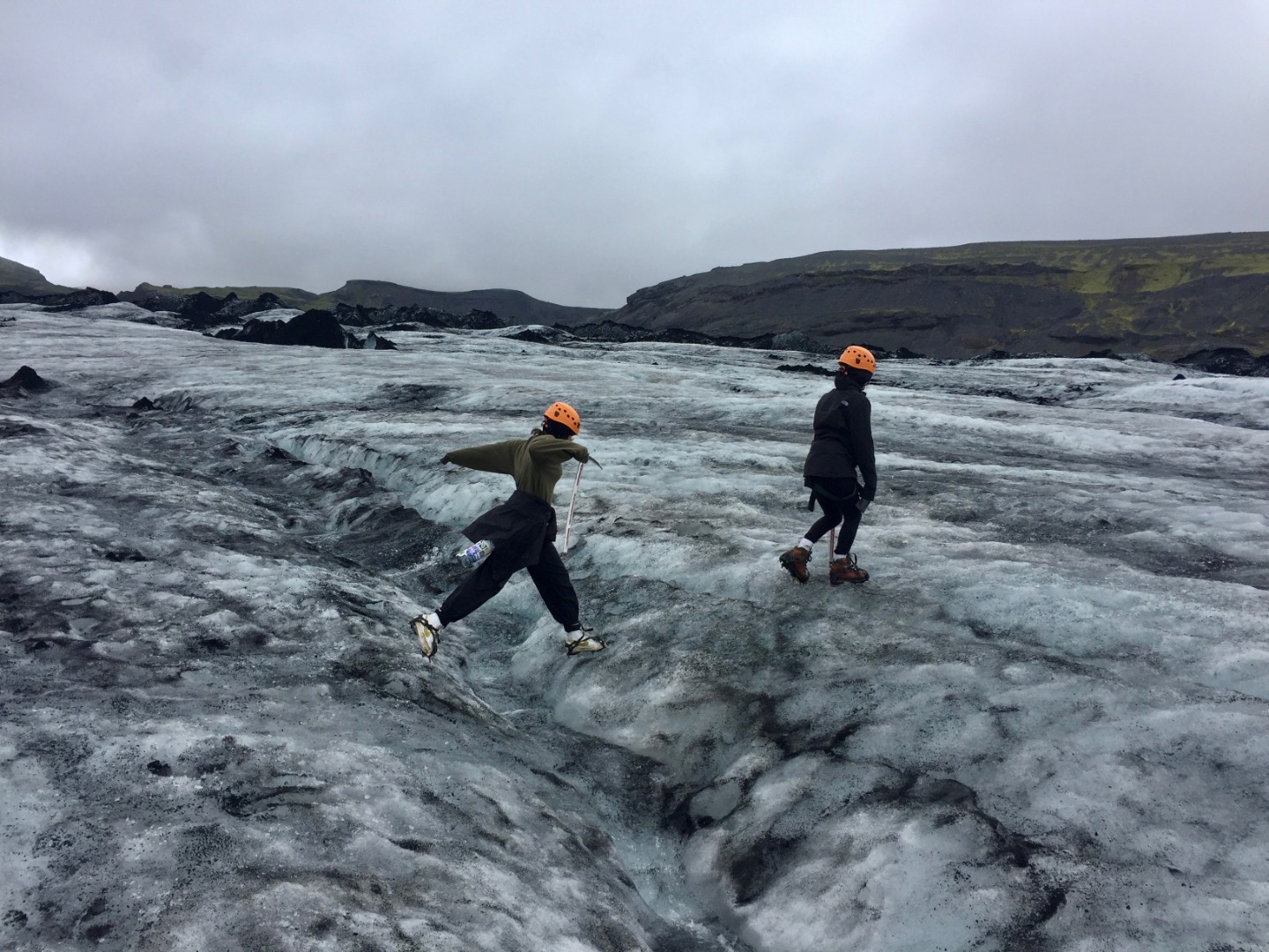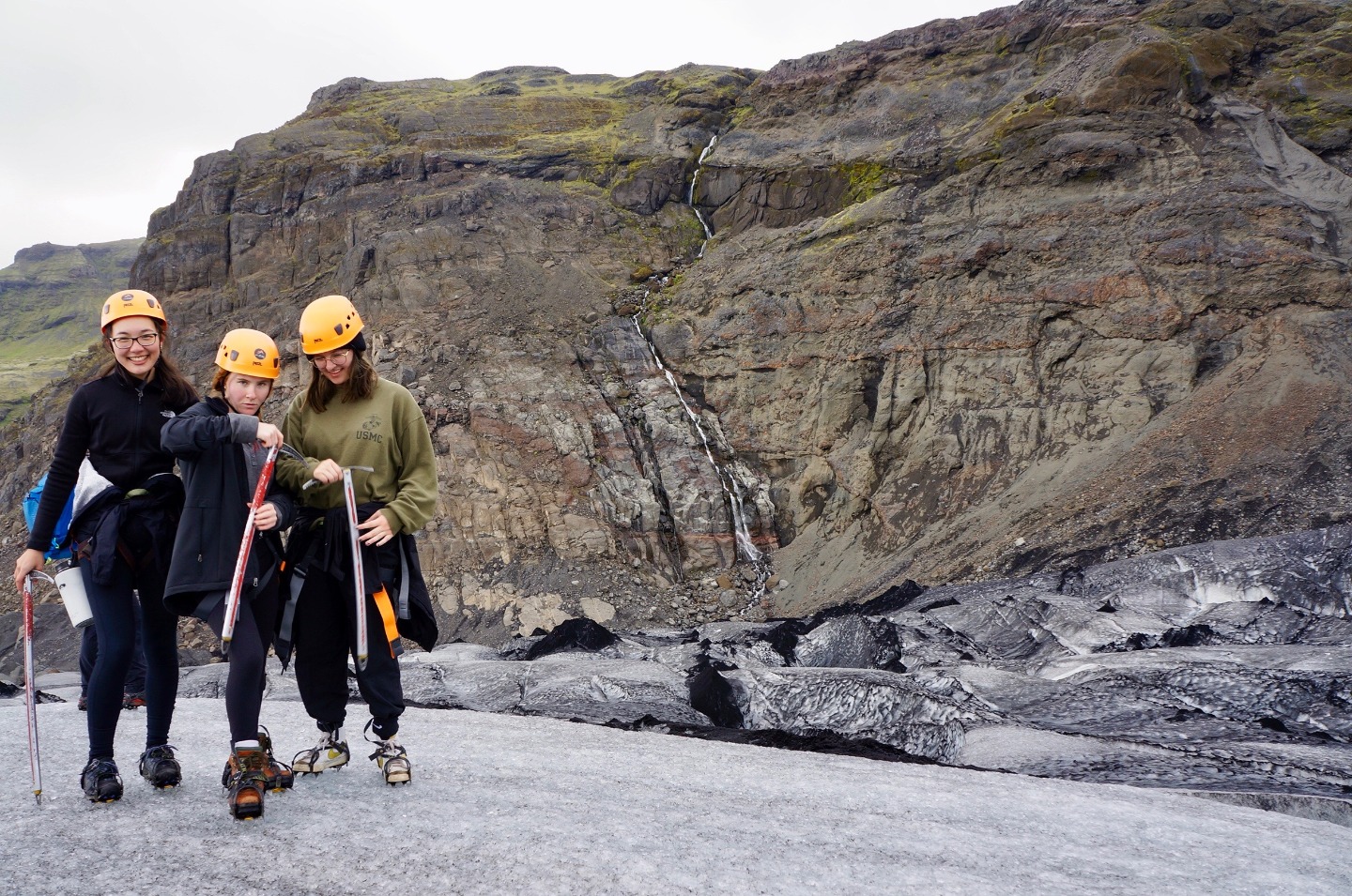 Today I woke everyone up at 7:45 am. We had a delicious breakfast along with cups of tea. After that, we joined the residents of Solheimar for their daily morning meeting and prayers. This was our last morning with them, and we enjoyed singing along. Then Gummi took us to the greenhouse we had worked on previously to see our final product. Everyone felt so satisfied with the work they had done and felt accomplished with what they had done. Solheimar was a beautiful community with really kind people, and we enjoyed every last moment there until our bus picked us up for the glacier hike. The bus ride was about one hour and 45 minutes, but we lost track of time because the scenic view was amazing. Getting ready for the hike was a little difficult because we had to find the right size helmet and crampons and we had to get climbing harnesses. Soon after we got all of our gear, we began our hike onto the glacier-covered in layers of ash from various volcanic eruptions. As we reached the summit, our guide offered to take us to an ice cave to which we happily agreed. Arriving at the cave was a difficult journey because we had to be careful of loose ice and slipping. However, the ice cave was magnificent, and the danger was worth what we saw. After we hiked off the glacier, we took off our gear and hopped from waterfall to waterfall and even visited the famous black sand beach, Reynisfjara, for the rest of the day. The waterfalls were amazing, but the best one was the last one, Seljalandsfoss, that had a pathway behind it, and we got soaked. It was a really amazing day, and we enjoyed every single activity.