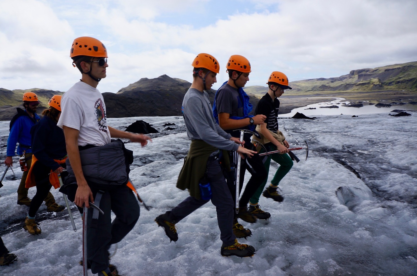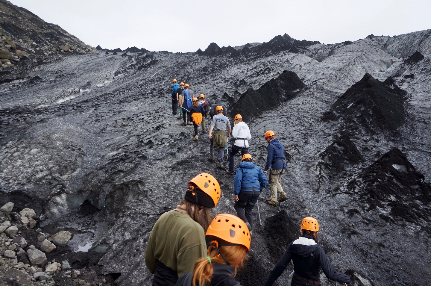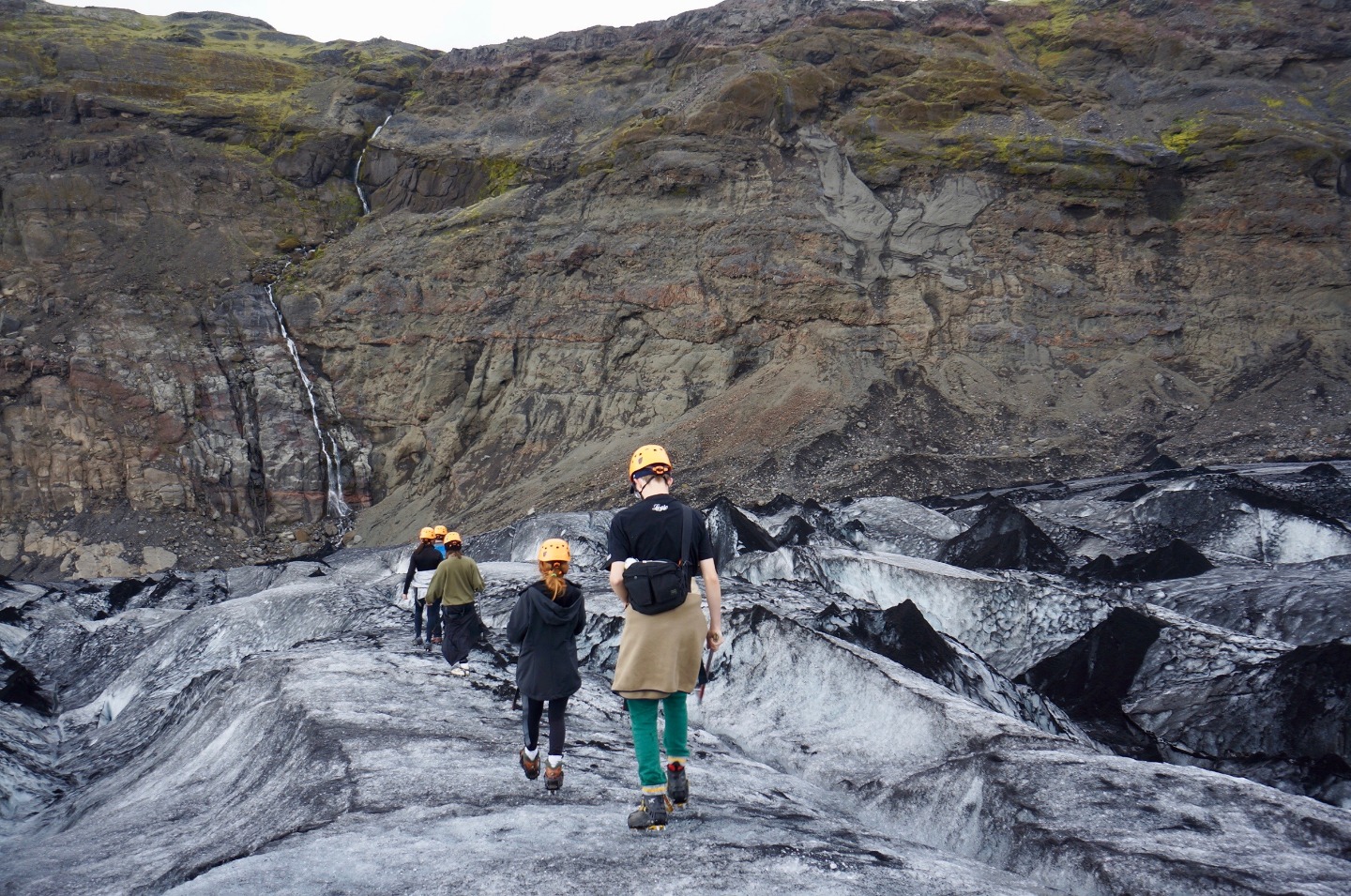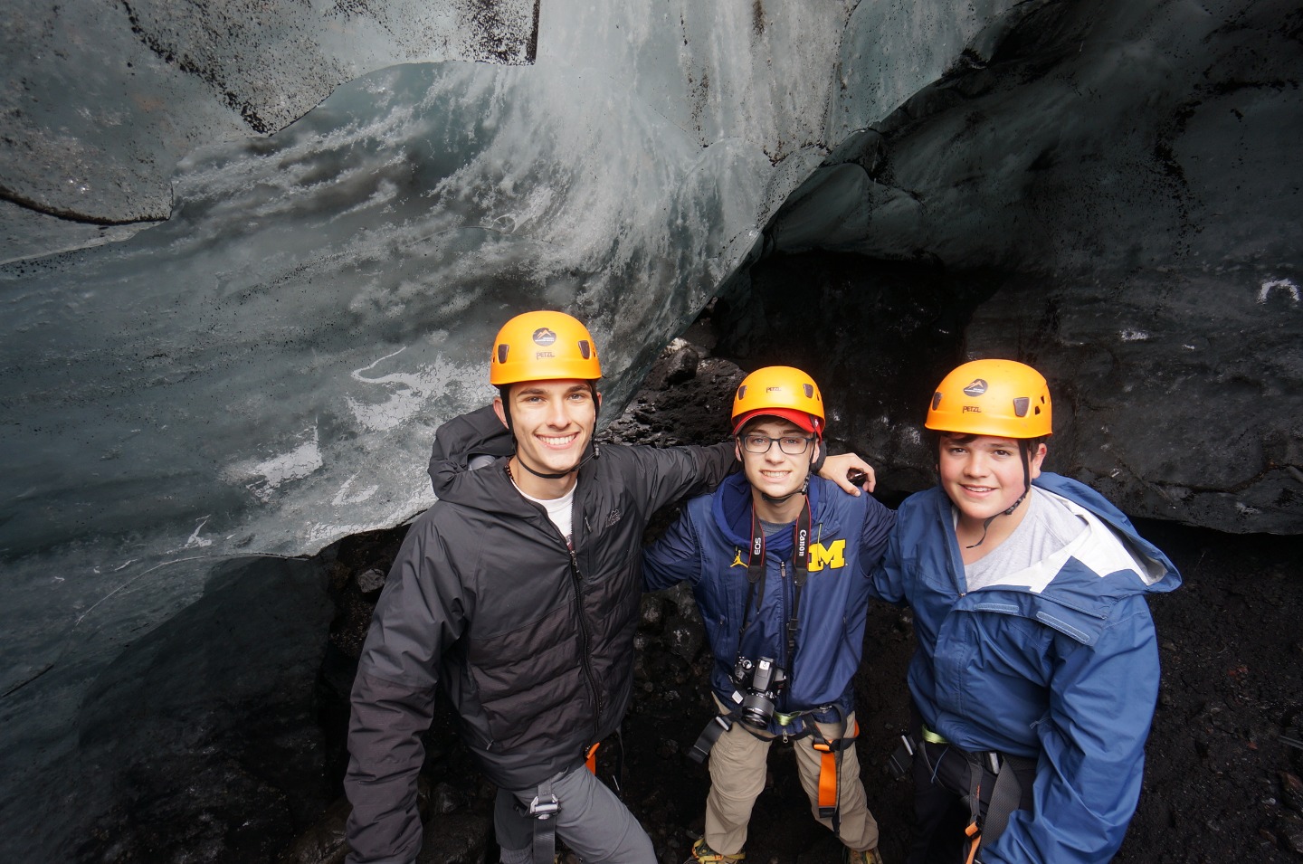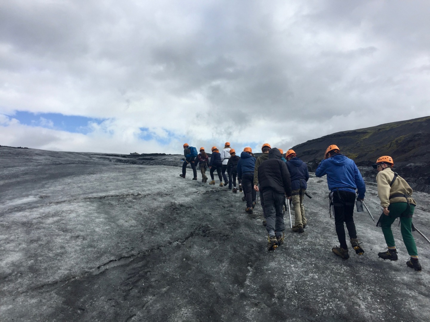Today I woke everyone up at 7:45 am. We had a delicious breakfast along with cups of tea. After that, we joined the residents of Solheimar for their daily morning meeting and prayers. This was our last morning with them, and we enjoyed singing along. Then Gummi took us to the greenhouse we had worked on previously to see our final product. Everyone felt so satisfied with the work they had done and felt accomplished with what they had done. Solheimar was a beautiful community with really kind people, and we enjoyed every last moment there until our bus picked us up for the glacier hike. The bus ride was about one hour and 45 minutes, but we lost track of time because the scenic view was amazing. Getting ready for the hike was a little difficult because we had to find the right size helmet and crampons and we had to get climbing harnesses. Soon after we got all of our gear, we began our hike onto the glacier-covered in layers of ash from various volcanic eruptions. As we reached the summit, our guide offered to take us to an ice cave to which we happily agreed. Arriving at the cave was a difficult journey because we had to be careful of loose ice and slipping. However, the ice cave was magnificent, and the danger was worth what we saw. After we hiked off the glacier, we took off our gear and hopped from waterfall to waterfall and even visited the famous black sand beach, Reynisfjara, for the rest of the day. The waterfalls were amazing, but the best one was the last one, Seljalandsfoss, that had a pathway behind it, and we got soaked. It was a really amazing day, and we enjoyed every single activity.