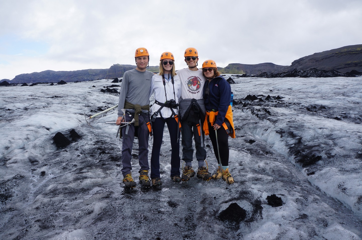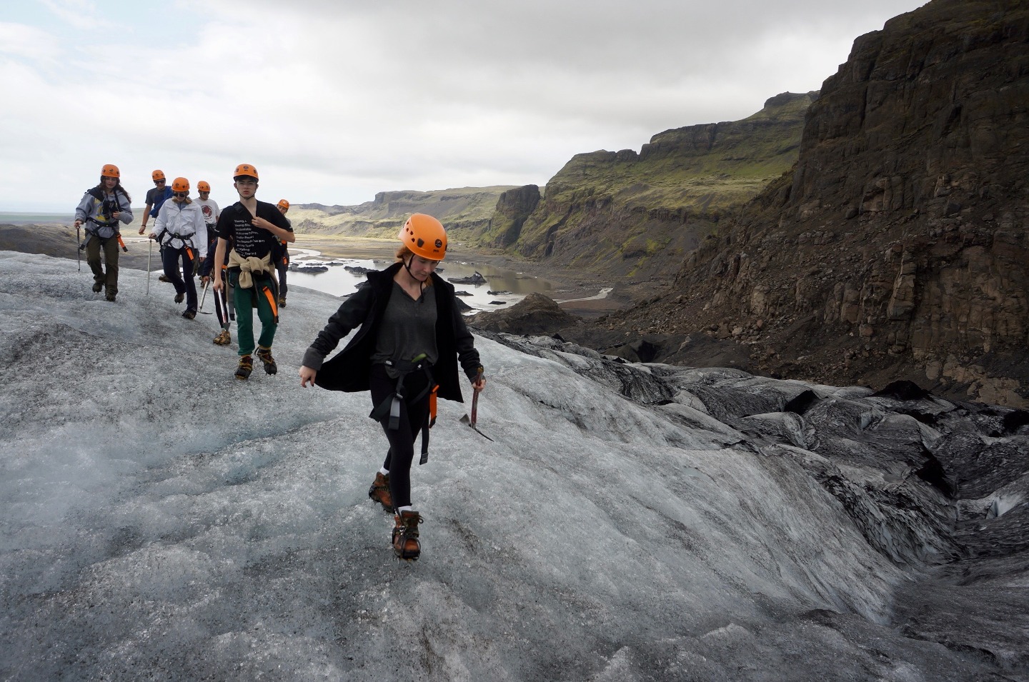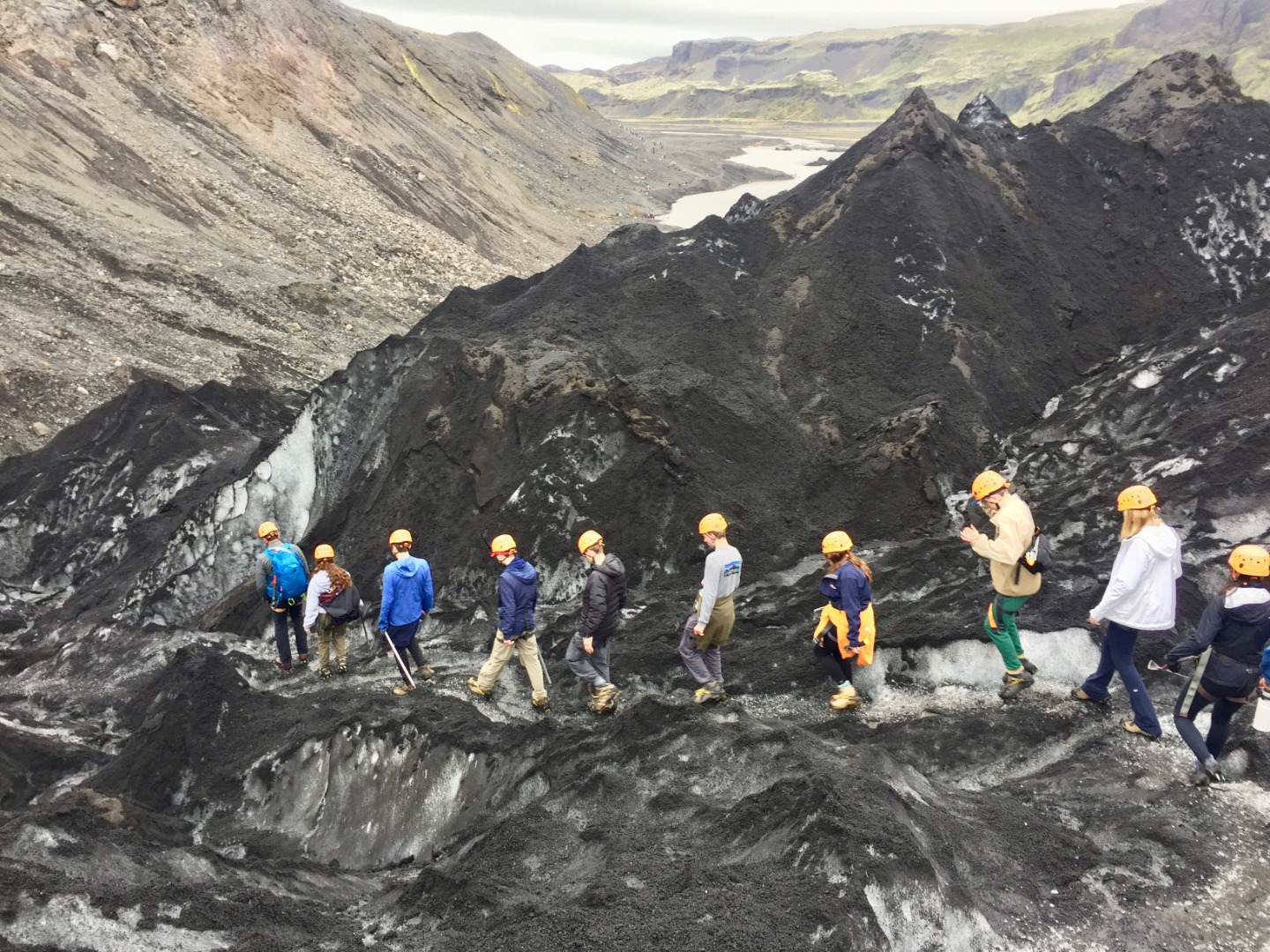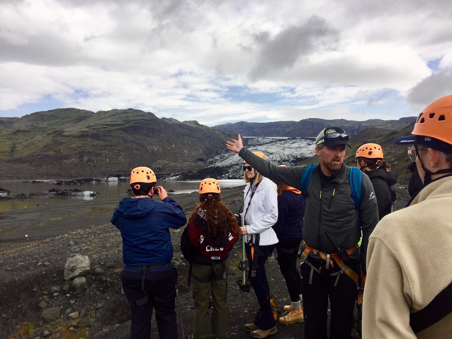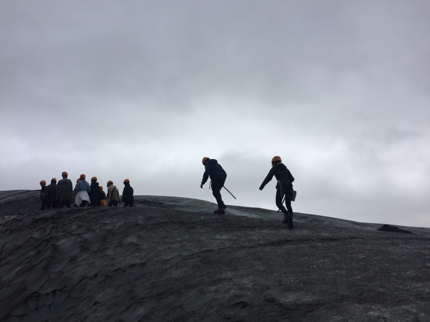 Today I woke everyone up at 7:45 am. We had a delicious breakfast along with cups of tea. After that, we joined the residents of Solheimar for their daily morning meeting and prayers. This was our last morning with them, and we enjoyed singing along. Then Gummi took us to the greenhouse we had worked on previously to see our final product. Everyone felt so satisfied with the work they had done and felt accomplished with what they had done. Solheimar was a beautiful community with really kind people, and we enjoyed every last moment there until our bus picked us up for the glacier hike. The bus ride was about one hour and 45 minutes, but we lost track of time because the scenic view was amazing. Getting ready for the hike was a little difficult because we had to find the right size helmet and crampons and we had to get climbing harnesses. Soon after we got all of our gear, we began our hike onto the glacier-covered in layers of ash from various volcanic eruptions. As we reached the summit, our guide offered to take us to an ice cave to which we happily agreed. Arriving at the cave was a difficult journey because we had to be careful of loose ice and slipping. However, the ice cave was magnificent, and the danger was worth what we saw. After we hiked off the glacier, we took off our gear and hopped from waterfall to waterfall and even visited the famous black sand beach, Reynisfjara, for the rest of the day. The waterfalls were amazing, but the best one was the last one, Seljalandsfoss, that had a pathway behind it, and we got soaked. It was a really amazing day, and we enjoyed every single activity.