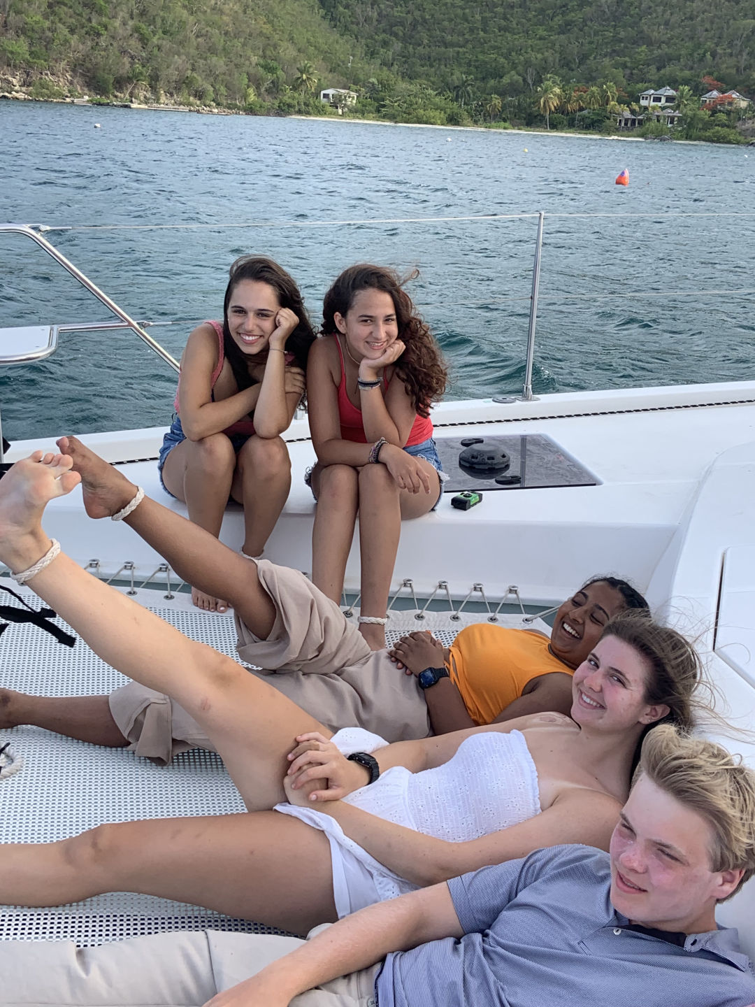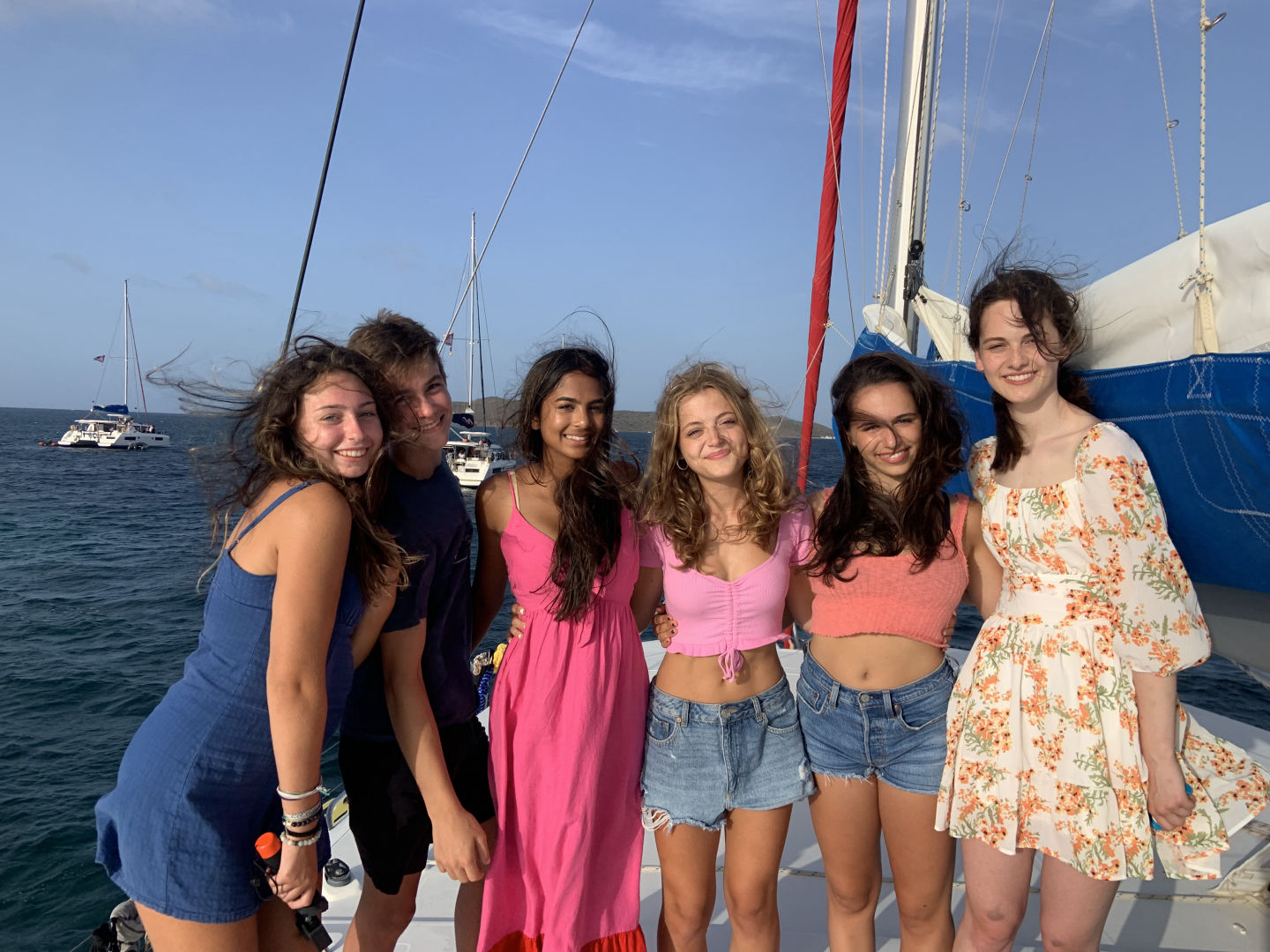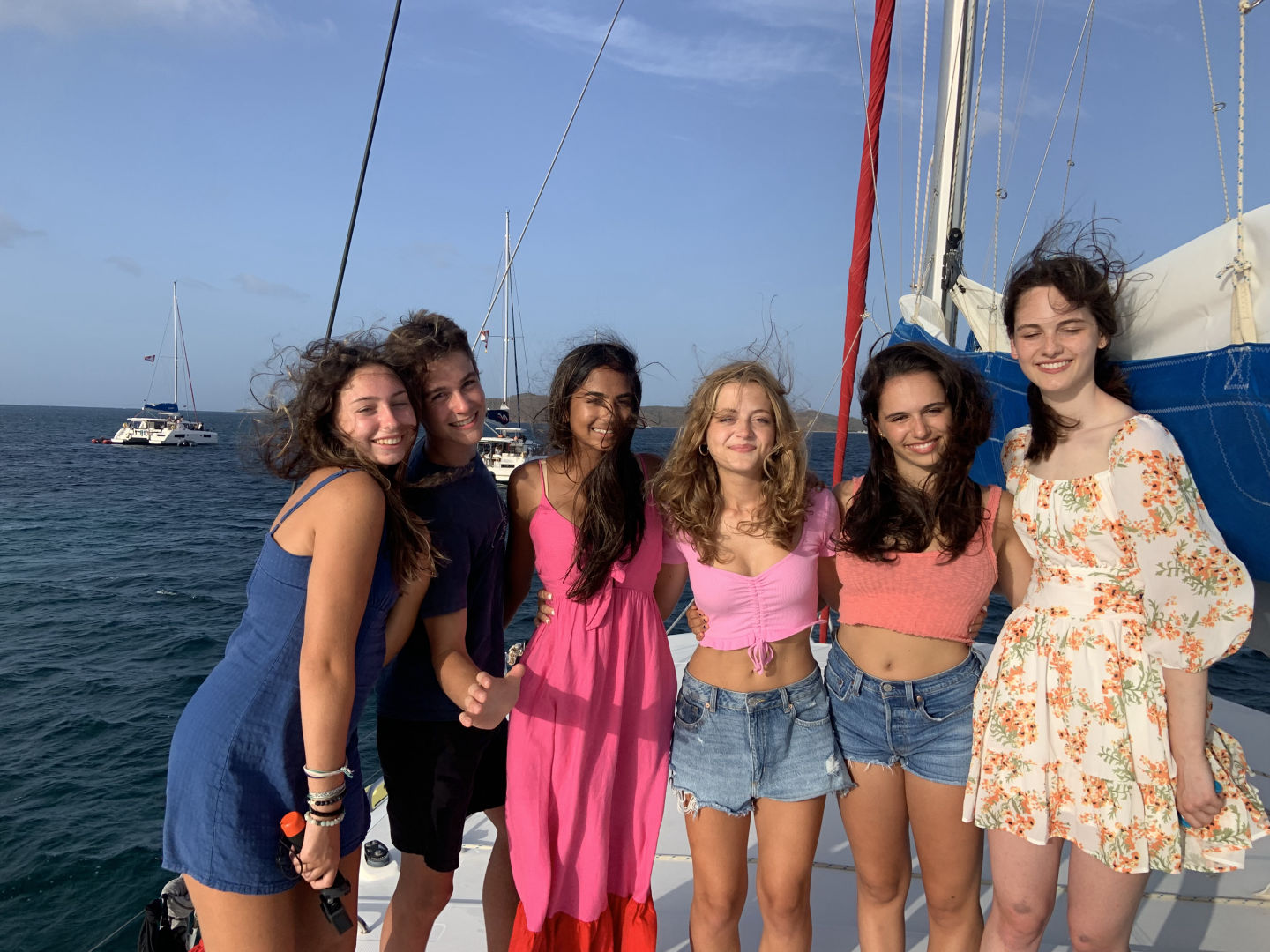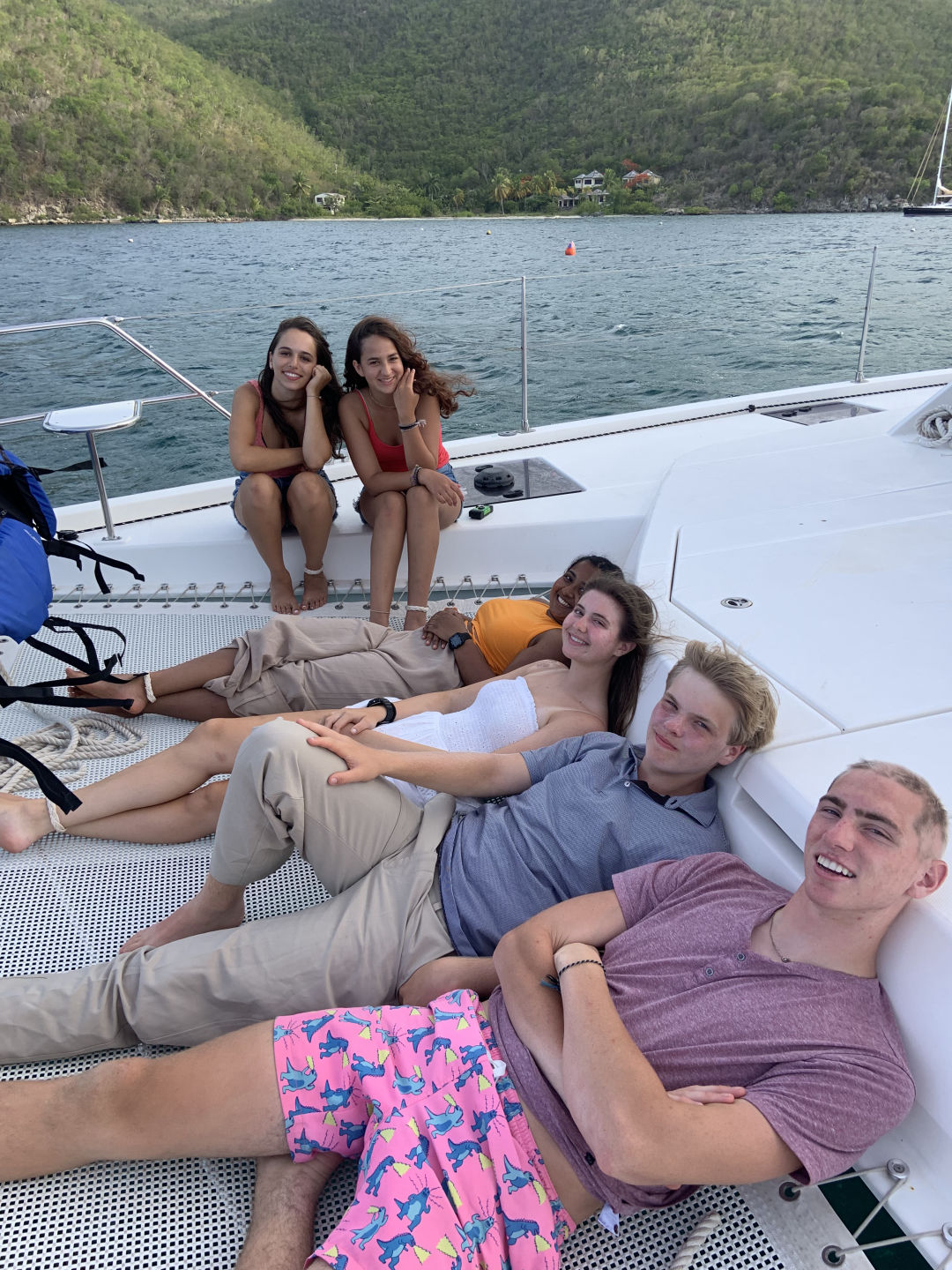 This morning we had french toast for breakfast made by Anna S. and Chris, and I must say it was the best breakfast we’ve had yet. We quickly got dressed and hopped on the dingy to get to the beach because we had a beach cleanup planned. As we stepped out of the dingy into ankle-deep water, Lily took a graceful fall into the water, leaving her drenched. We made our way to the opposite side of the island and began to clean up any garbage we found on the beach. After cleaning up any plastic we could find, we discovered a massive pile of ropes matted and tied together. Shaila found a sharp piece of coral and gave it to Elle in an attempt to “saw” down the rope in order to break down the pile and dispose of it. Liam and Elle were hard at work and celebrated after successfully cutting pieces of rope. We made our way back to the other side of the island to get back to the boat. Griffin was very helpful with carrying the bags of trash back to the boat, as he stayed back and helped Riley with the bags that were ripped and falling apart. Once we all got back to the boat, we waited in anticipation to get our phones for the first time since we’d been here. Everyone made calls and checked in with family for an hour while we sailed to Leverick Bay. As we finally got to the bay, we took ocean showers and prepared to use the Hibiclens for the first time. We turned our phones back in and got all ready to go on shore for lunch and shopping. We were all extremely excited, and we all sat down to eat together. After being influenced by Morgan, Griffin, Shaila, and Chris to try Hawaiian pizza, Elle tried it for the first time. However, it was not up to her New York pizza standards. We split up after lunch as Surya, Morgan, and Anna S. went to a cute beach boutique to get bracelets, and the rest got snacks at the local grocery store. We returned to the boat for an hour while staff set up the Beach Barbecue for all of Action Quest. Anna B. happily got her apples because she was struggling after we ran out. Our boat was slightly nervous about the party because we didn’t know any of the other kids on the other boats. We stuck together and realized how much closer our boat is to each other than any other boat. As Avah socialized and made friends with other girls around, Hannah took an unfortunate fall as she missed a step going down the stairs. We were all cracking up as she brushed the sand off of her. Once we were informed of some drama from the other boats, we decided to cut the night short and head back to the boat. As I’m writing this, we are all in the salon talking and laughing.