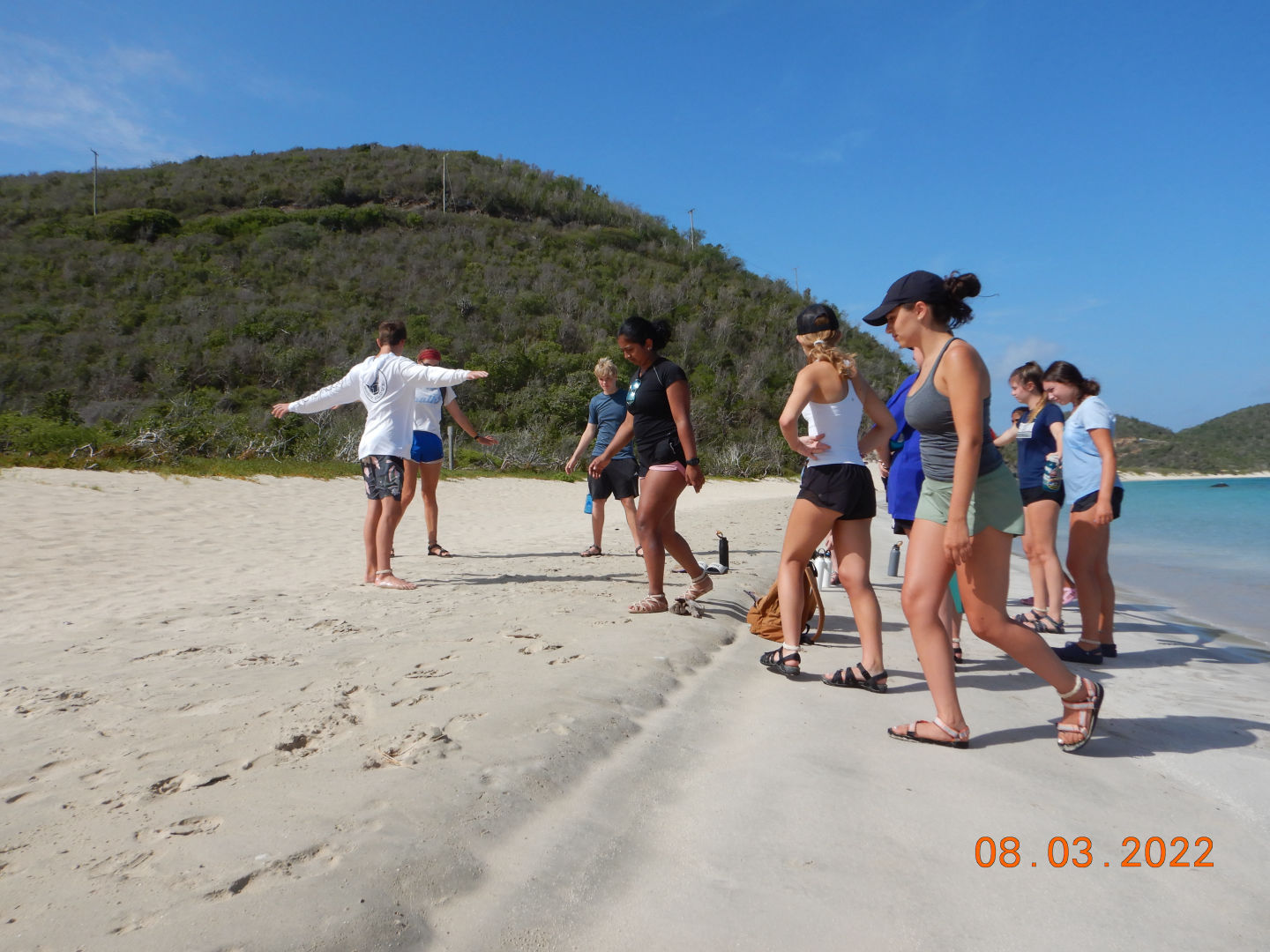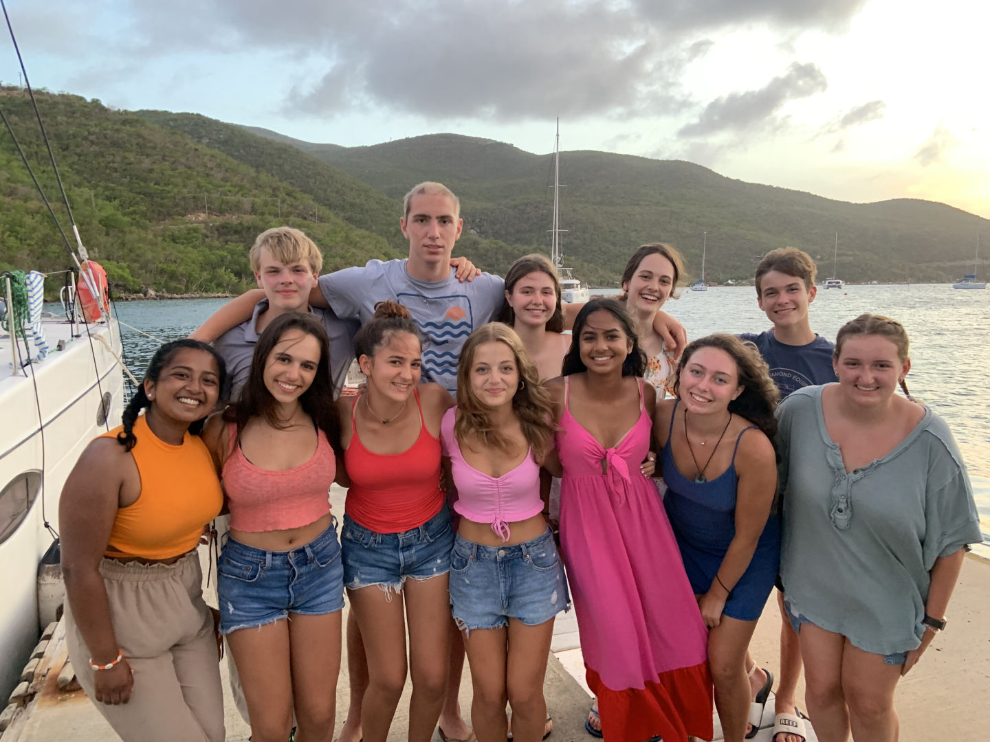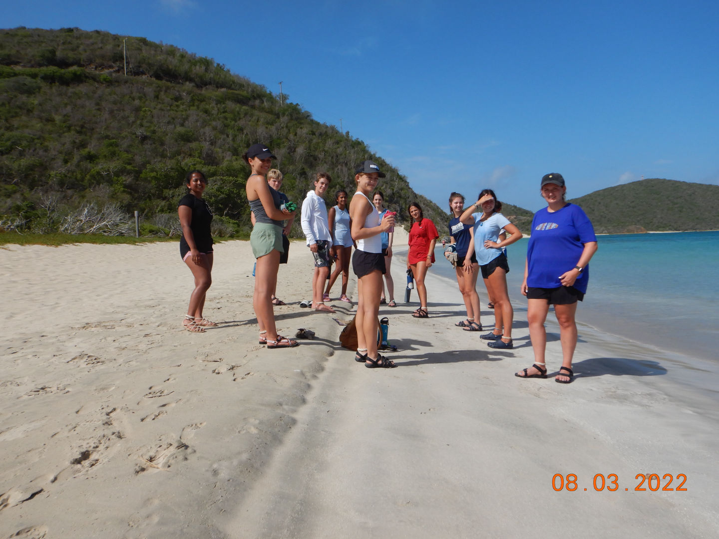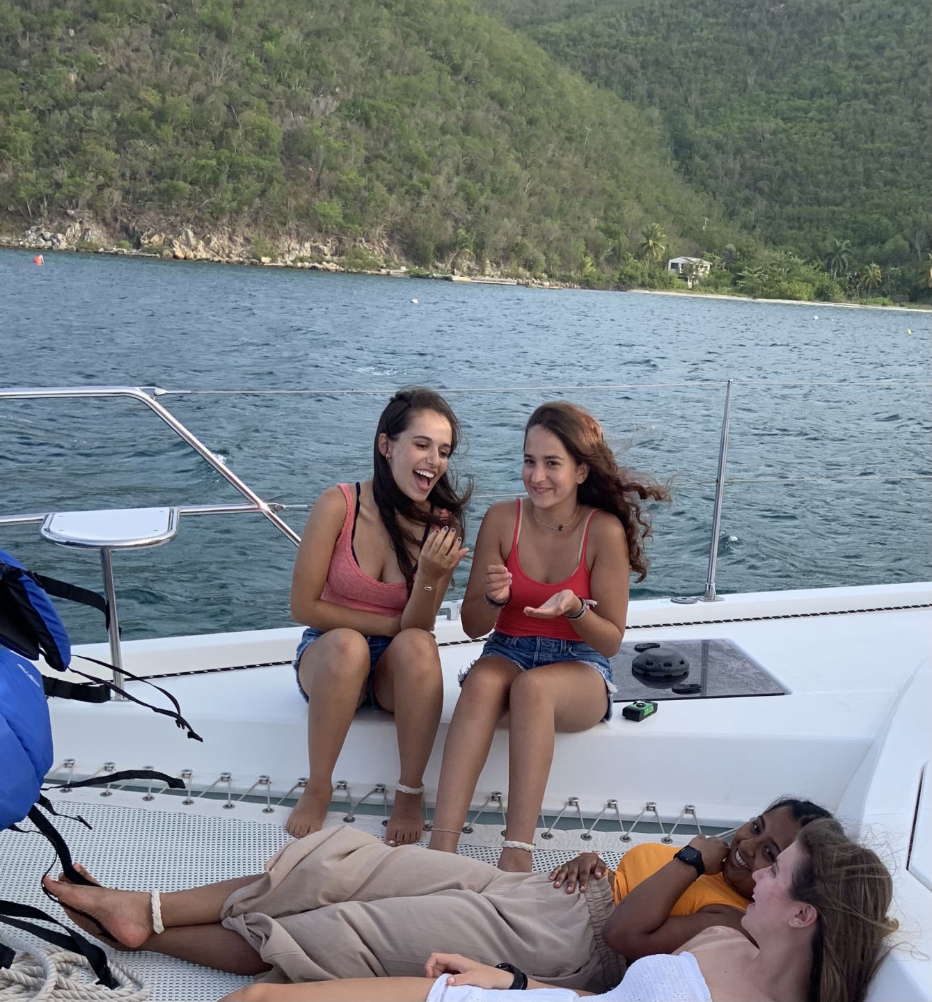 This morning we had french toast for breakfast made by Anna S. and Chris, and I must say it was the best breakfast we’ve had yet. We quickly got dressed and hopped on the dingy to get to the beach because we had a beach cleanup planned. As we stepped out of the dingy into ankle-deep water, Lily took a graceful fall into the water, leaving her drenched. We made our way to the opposite side of the island and began to clean up any garbage we found on the beach. After cleaning up any plastic we could find, we discovered a massive pile of ropes matted and tied together. Shaila found a sharp piece of coral and gave it to Elle in an attempt to “saw” down the rope in order to break down the pile and dispose of it. Liam and Elle were hard at work and celebrated after successfully cutting pieces of rope. We made our way back to the other side of the island to get back to the boat. Griffin was very helpful with carrying the bags of trash back to the boat, as he stayed back and helped Riley with the bags that were ripped and falling apart. Once we all got back to the boat, we waited in anticipation to get our phones for the first time since we’d been here. Everyone made calls and checked in with family for an hour while we sailed to Leverick Bay. As we finally got to the bay, we took ocean showers and prepared to use the Hibiclens for the first time. We turned our phones back in and got all ready to go on shore for lunch and shopping. We were all extremely excited, and we all sat down to eat together. After being influenced by Morgan, Griffin, Shaila, and Chris to try Hawaiian pizza, Elle tried it for the first time. However, it was not up to her New York pizza standards. We split up after lunch as Surya, Morgan, and Anna S. went to a cute beach boutique to get bracelets, and the rest got snacks at the local grocery store. We returned to the boat for an hour while staff set up the Beach Barbecue for all of Action Quest. Anna B. happily got her apples because she was struggling after we ran out. Our boat was slightly nervous about the party because we didn’t know any of the other kids on the other boats. We stuck together and realized how much closer our boat is to each other than any other boat. As Avah socialized and made friends with other girls around, Hannah took an unfortunate fall as she missed a step going down the stairs. We were all cracking up as she brushed the sand off of her. Once we were informed of some drama from the other boats, we decided to cut the night short and head back to the boat. As I’m writing this, we are all in the salon talking and laughing.