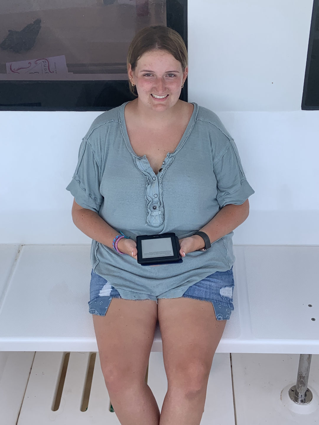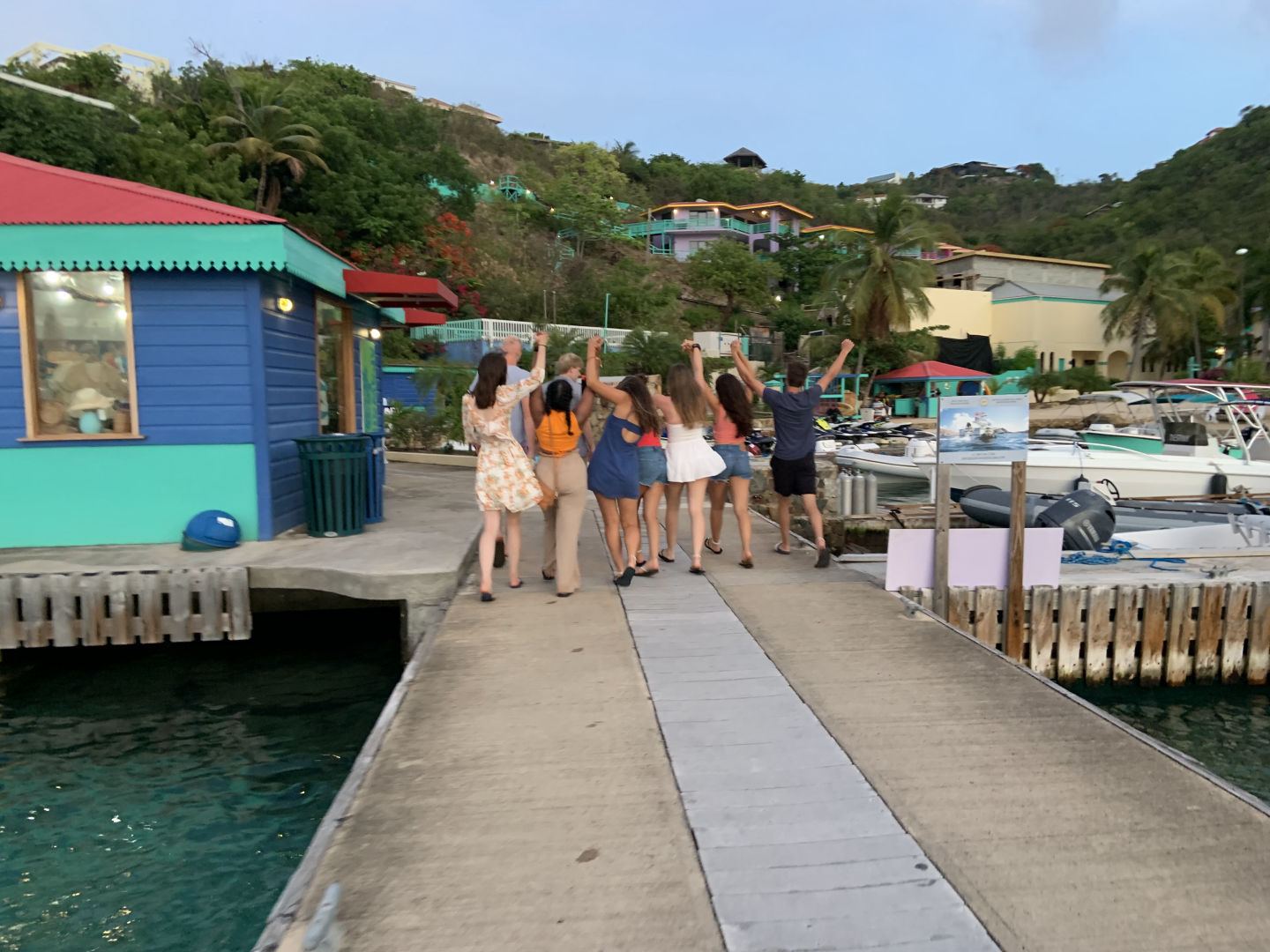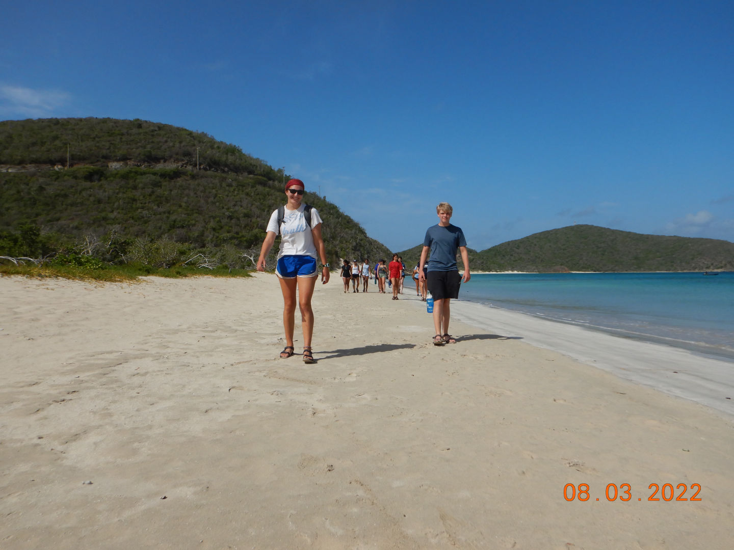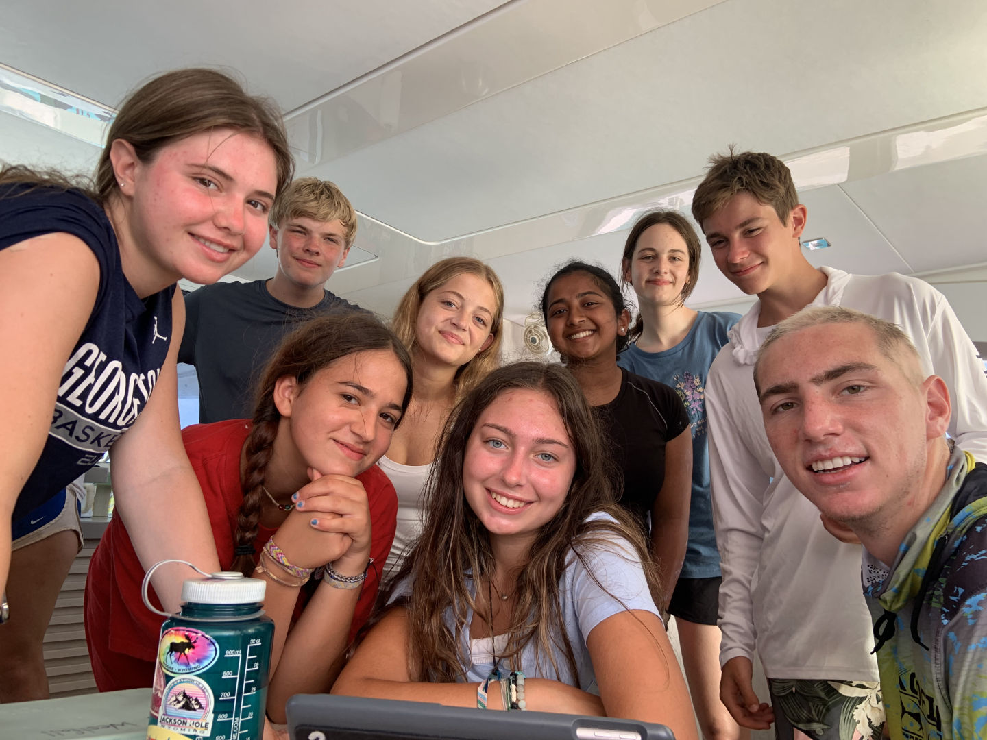 This morning we had french toast for breakfast made by Anna S. and Chris, and I must say it was the best breakfast we’ve had yet. We quickly got dressed and hopped on the dingy to get to the beach because we had a beach cleanup planned. As we stepped out of the dingy into ankle-deep water, Lily took a graceful fall into the water, leaving her drenched. We made our way to the opposite side of the island and began to clean up any garbage we found on the beach. After cleaning up any plastic we could find, we discovered a massive pile of ropes matted and tied together. Shaila found a sharp piece of coral and gave it to Elle in an attempt to “saw” down the rope in order to break down the pile and dispose of it. Liam and Elle were hard at work and celebrated after successfully cutting pieces of rope. We made our way back to the other side of the island to get back to the boat. Griffin was very helpful with carrying the bags of trash back to the boat, as he stayed back and helped Riley with the bags that were ripped and falling apart. Once we all got back to the boat, we waited in anticipation to get our phones for the first time since we’d been here. Everyone made calls and checked in with family for an hour while we sailed to Leverick Bay. As we finally got to the bay, we took ocean showers and prepared to use the Hibiclens for the first time. We turned our phones back in and got all ready to go on shore for lunch and shopping. We were all extremely excited, and we all sat down to eat together. After being influenced by Morgan, Griffin, Shaila, and Chris to try Hawaiian pizza, Elle tried it for the first time. However, it was not up to her New York pizza standards. We split up after lunch as Surya, Morgan, and Anna S. went to a cute beach boutique to get bracelets, and the rest got snacks at the local grocery store. We returned to the boat for an hour while staff set up the Beach Barbecue for all of Action Quest. Anna B. happily got her apples because she was struggling after we ran out. Our boat was slightly nervous about the party because we didn’t know any of the other kids on the other boats. We stuck together and realized how much closer our boat is to each other than any other boat. As Avah socialized and made friends with other girls around, Hannah took an unfortunate fall as she missed a step going down the stairs. We were all cracking up as she brushed the sand off of her. Once we were informed of some drama from the other boats, we decided to cut the night short and head back to the boat. As I’m writing this, we are all in the salon talking and laughing.