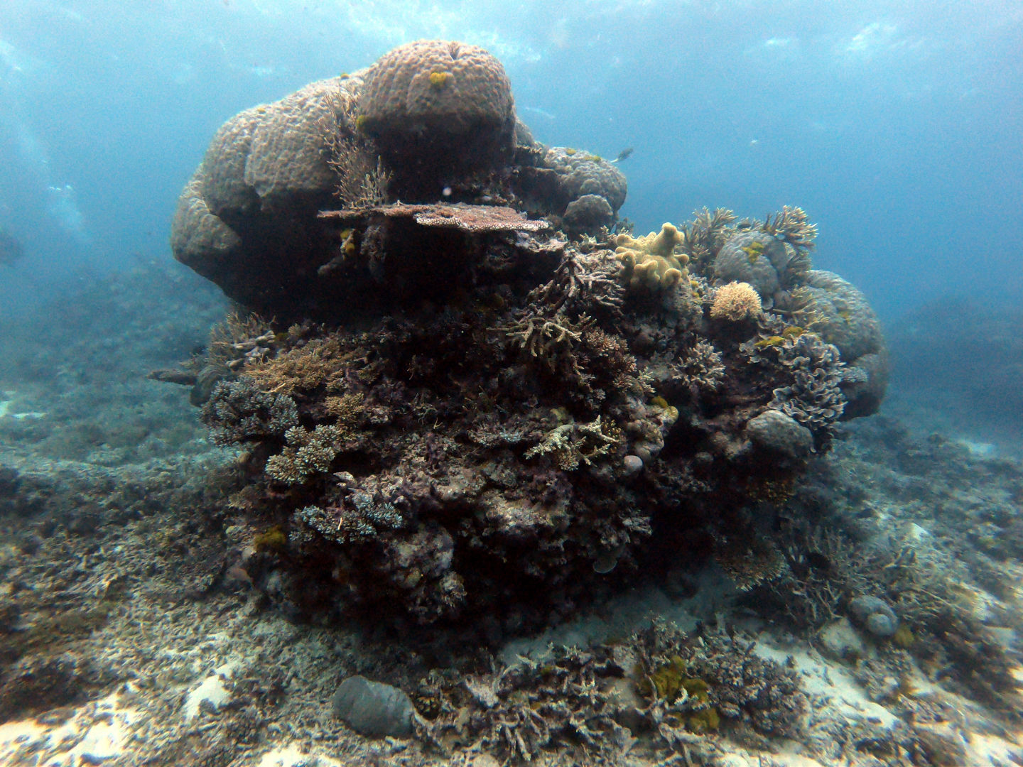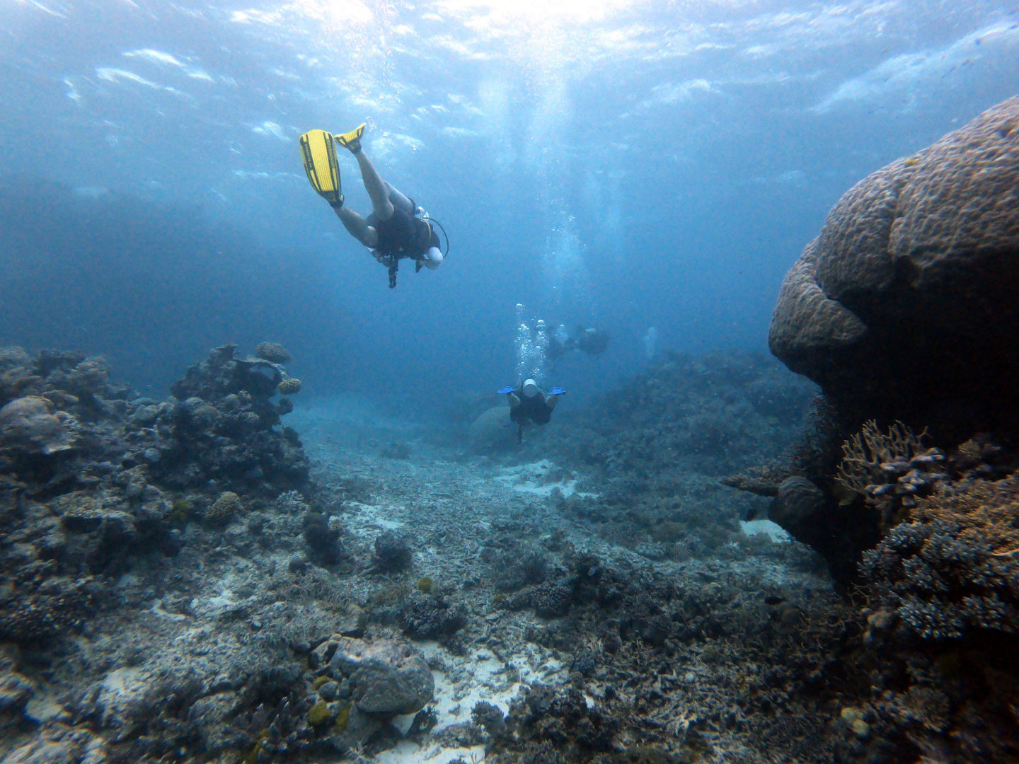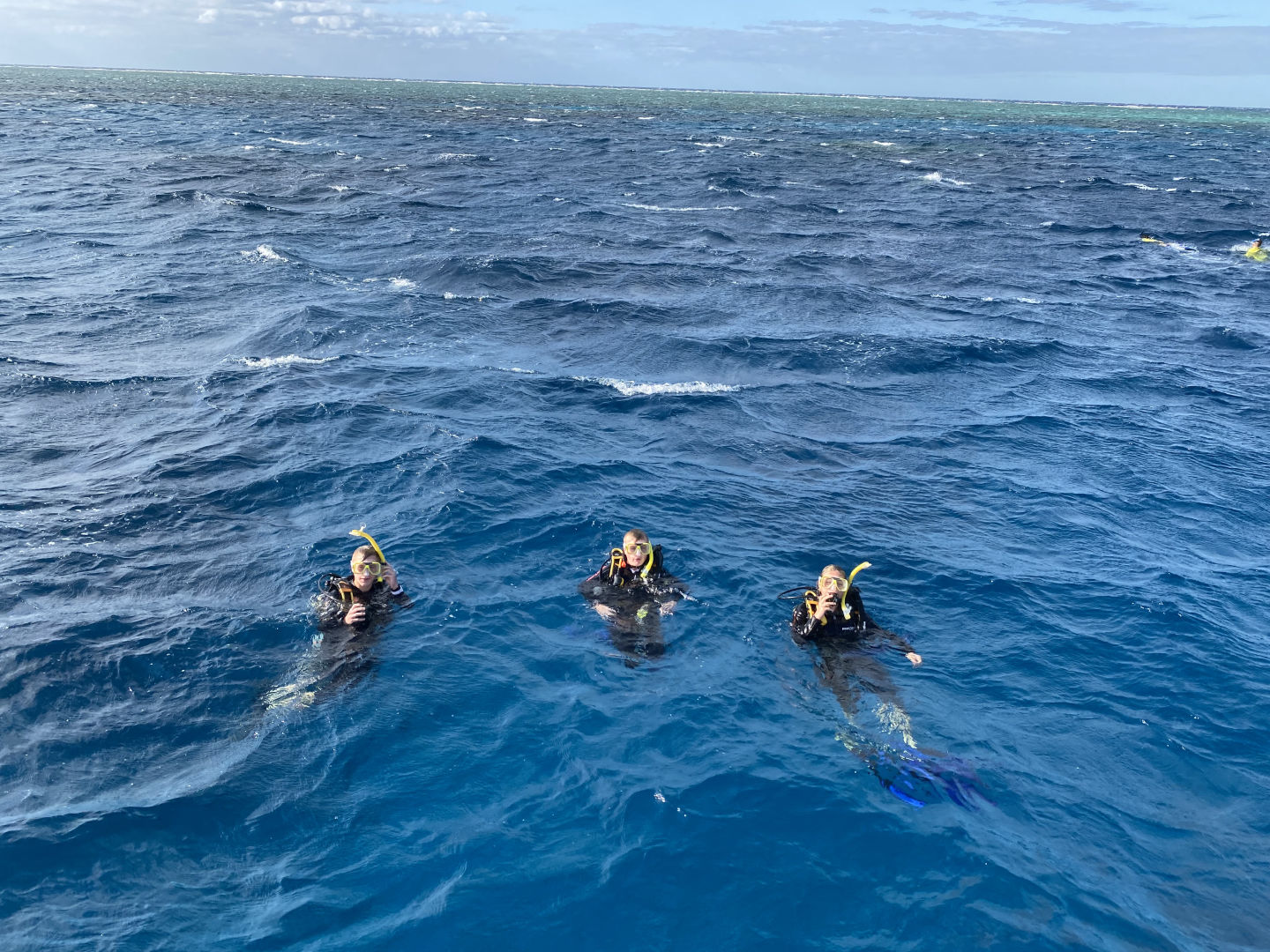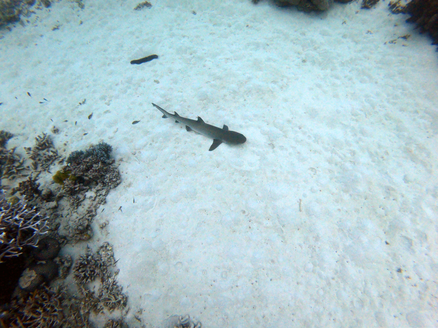Today, we got to sleep in until a pleasant 5:45 a.m., when the few members of our group who actually got up were greeted by the harsh winds of a frigid morning. Out of our group of 13, only 4 of us stumbled on deck: Amanda, Steph, Carter, and I. Carter. I were questioning our decision to get into the water as we felt the cold wind on our faces and heard the waves crash against the boat. What made it worse was that during the night, my towel had been claimed by the sea after being carried away by a gust of wind. Carter had had enough with the cold and decided not to dive, but I decided I might as well do it, seeing as I was already awake. Luckily, the water was warmer than the air above, allowing us to dive without becoming icicles. The early morning dive took place during the sunrise, allowing us to see the transition between night and day in the coral habitat. I’d say the coolest thing we saw on the dive was either the massive school of bumphead parrotfish swimming past us in the distance or the 5-foot shark resting on the sandy bottom towards the end of the dive. If it wasn’t cold before the dive, it definitely was once we surfaced and we were exposed to the elements while also soaked in water. After the cold dive, we joined the rest of our group inside for a cozy breakfast and for the announcement from our captain, which informed us that one of the dinghies had broken, meaning that the boat would be unable to leave the current dive site. I did not do the second dive as I had already dived the spot multiple times now, but I can say that the conditions from the morning kept strong for the whole day. For the final dive of the trip, I went in a group of just Jonah and myself, and I made the executive decision not to take it seriously whatsoever; this involved the first step of stealing an apple from the kitchen and storing it in my BCD pocket. I decided that diving was a bit too exerting for me, so I proceeded to take off my fins, sit on the sand, and take a few bites out of the apple I brought with us.