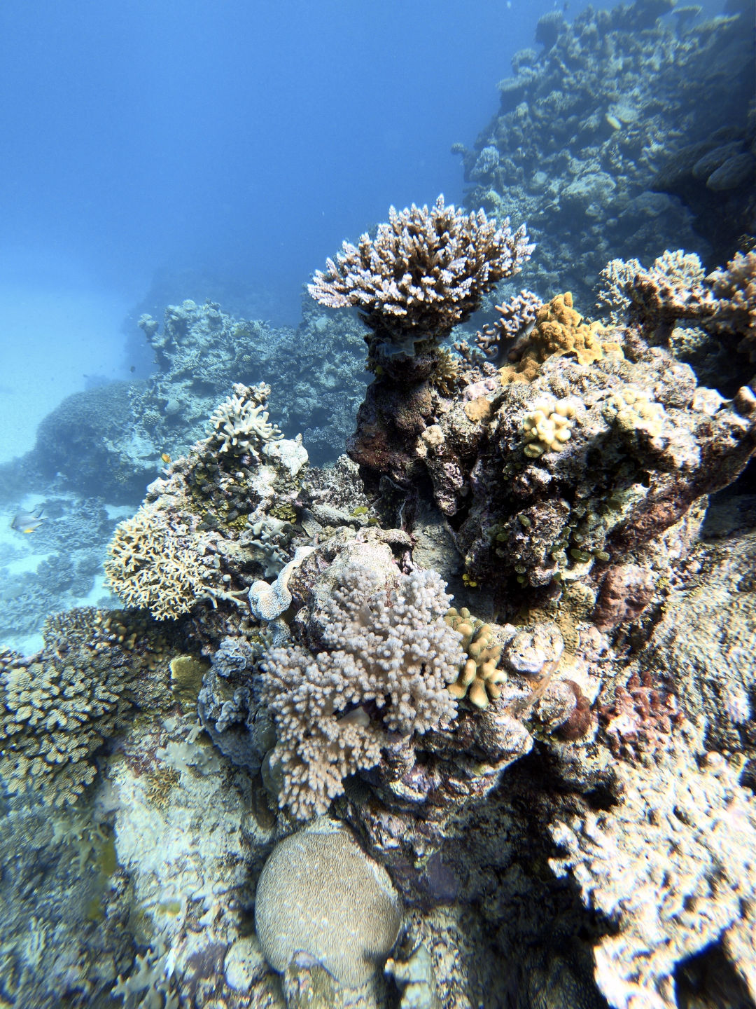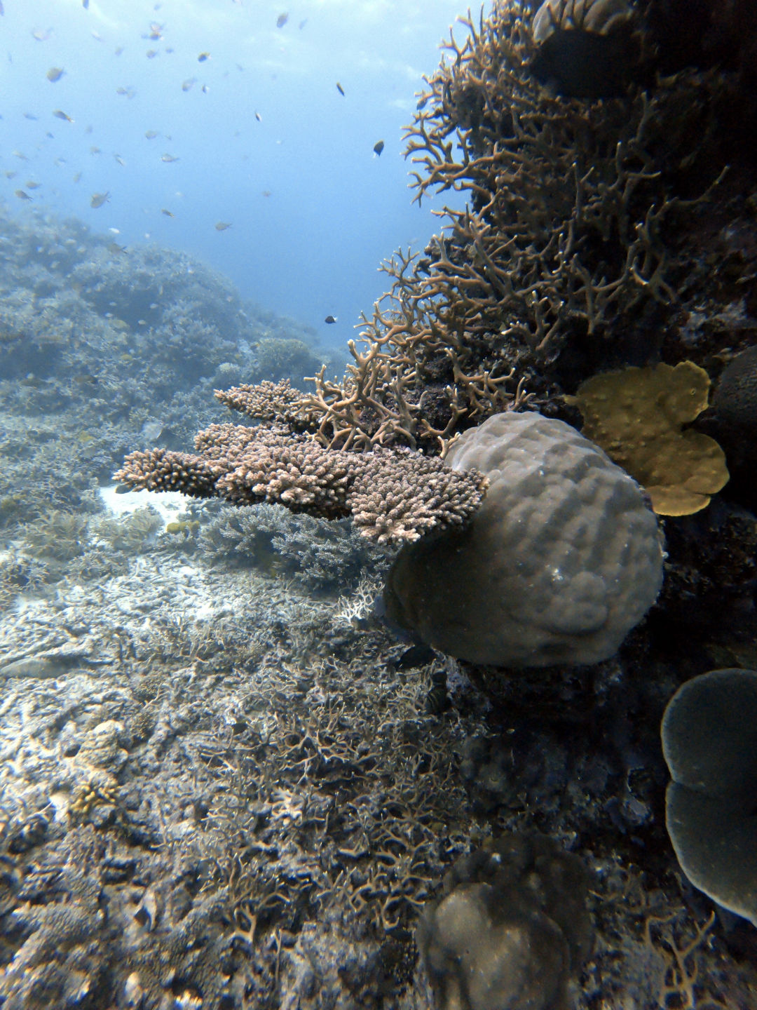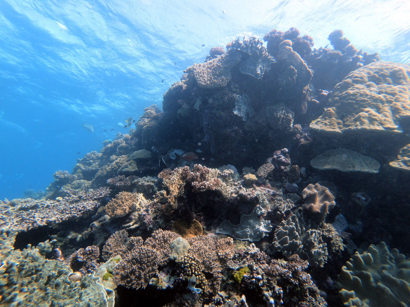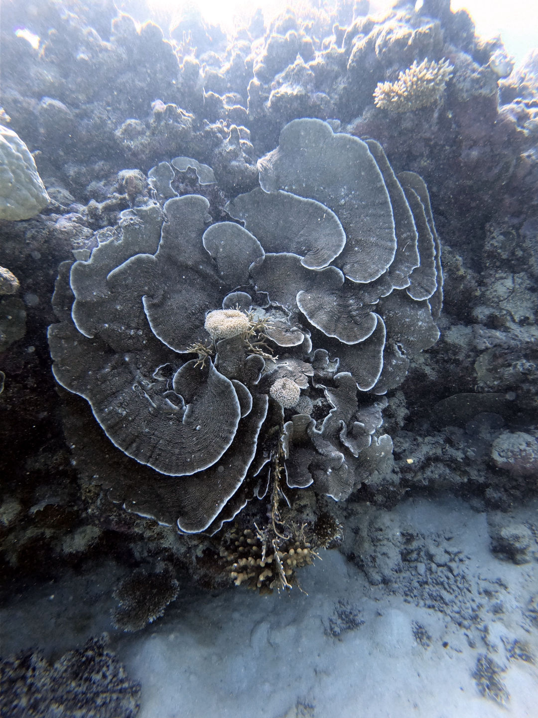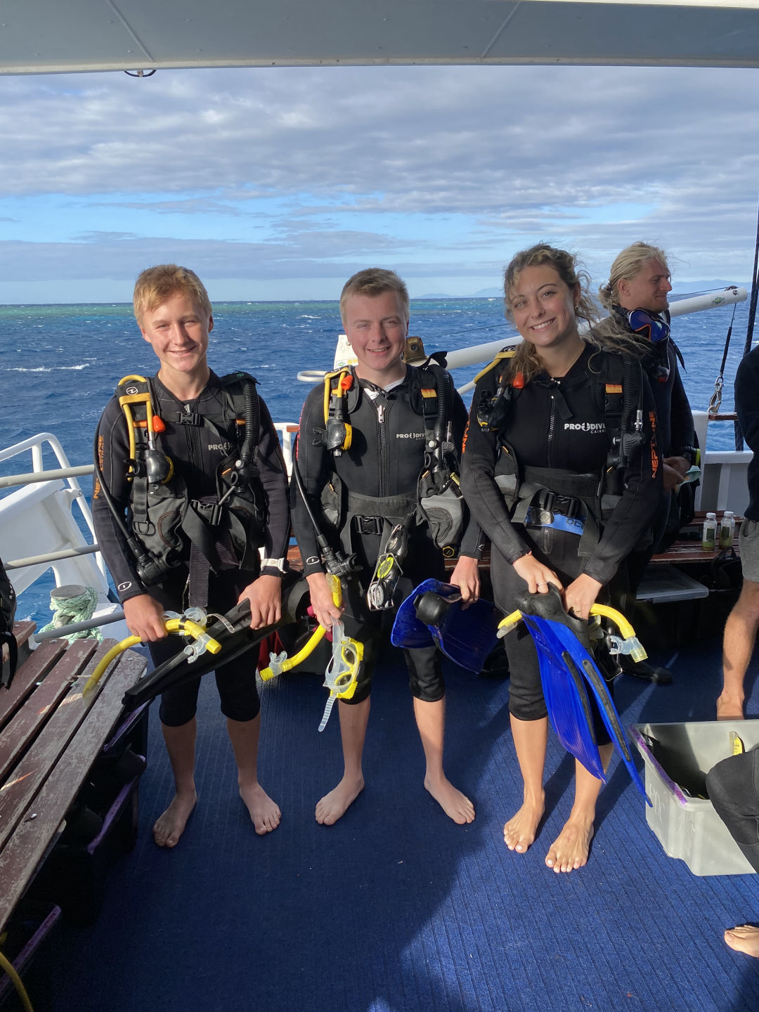 Today, we got to sleep in until a pleasant 5:45 a.m., when the few members of our group who actually got up were greeted by the harsh winds of a frigid morning. Out of our group of 13, only 4 of us stumbled on deck: Amanda, Steph, Carter, and I. Carter. I were questioning our decision to get into the water as we felt the cold wind on our faces and heard the waves crash against the boat. What made it worse was that during the night, my towel had been claimed by the sea after being carried away by a gust of wind. Carter had had enough with the cold and decided not to dive, but I decided I might as well do it, seeing as I was already awake. Luckily, the water was warmer than the air above, allowing us to dive without becoming icicles. The early morning dive took place during the sunrise, allowing us to see the transition between night and day in the coral habitat. I’d say the coolest thing we saw on the dive was either the massive school of bumphead parrotfish swimming past us in the distance or the 5-foot shark resting on the sandy bottom towards the end of the dive. If it wasn’t cold before the dive, it definitely was once we surfaced and we were exposed to the elements while also soaked in water. After the cold dive, we joined the rest of our group inside for a cozy breakfast and for the announcement from our captain, which informed us that one of the dinghies had broken, meaning that the boat would be unable to leave the current dive site. I did not do the second dive as I had already dived the spot multiple times now, but I can say that the conditions from the morning kept strong for the whole day. For the final dive of the trip, I went in a group of just Jonah and myself, and I made the executive decision not to take it seriously whatsoever; this involved the first step of stealing an apple from the kitchen and storing it in my BCD pocket. I decided that diving was a bit too exerting for me, so I proceeded to take off my fins, sit on the sand, and take a few bites out of the apple I brought with us.