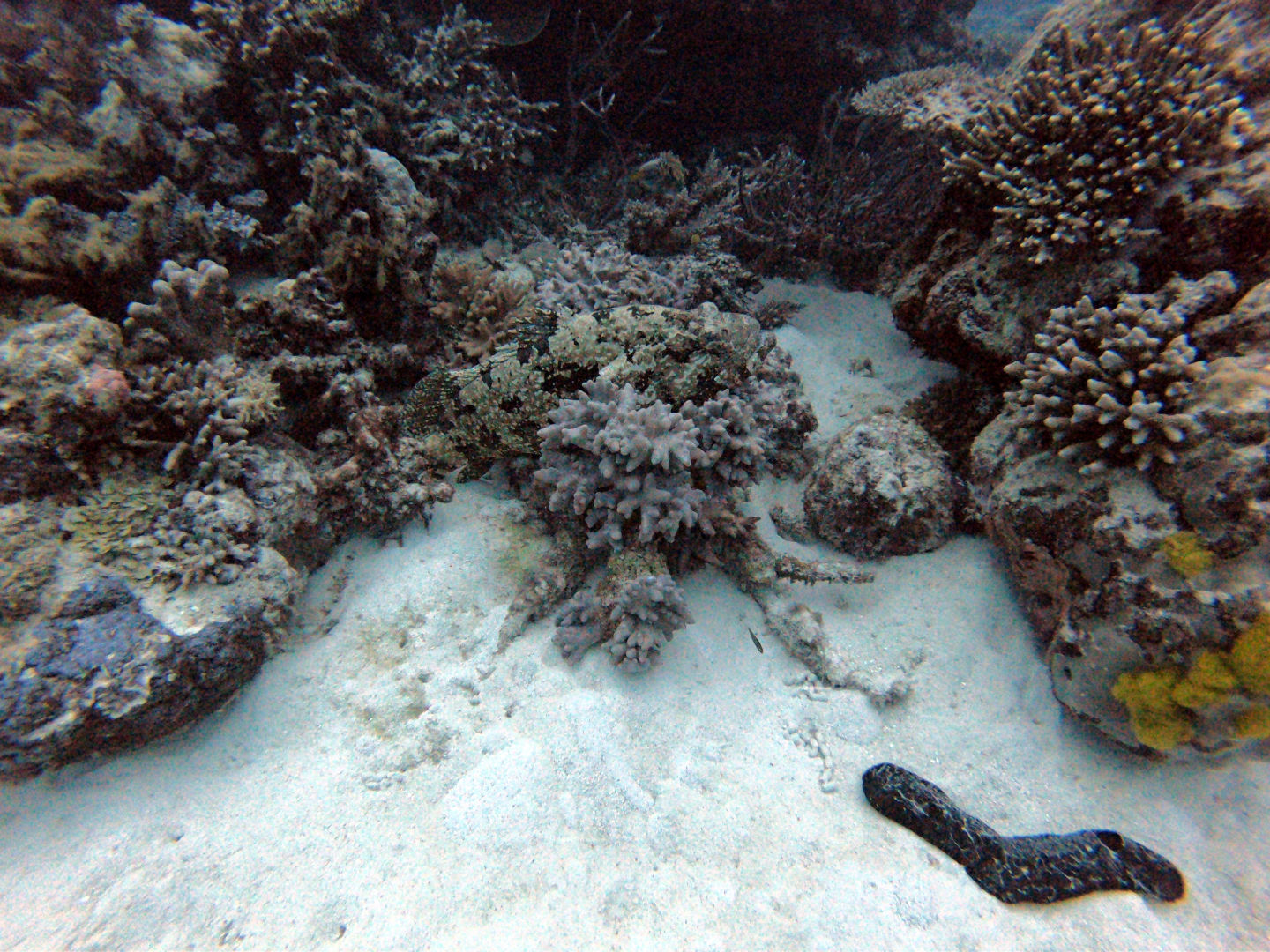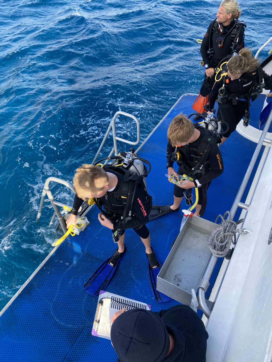 Eating an apple underwater is salty, to say the least, but I thought, what better time to teach Jonah how to eat something underwater than underwater, where we can’t talk. Long story short, Jonah didn’t drown mostly and now has a story to tell everyone about “eating” an apple underwater. After we finished our snack, I realized that lying on the ocean floor close behind me was a purple towel. Seeing this gave me hope that other lost items could be recovered, causing me to change the dive into a search and recovery mission. In total, we found four lost items: Lila’s purple towel, Roman’s underwear, a microfiber cloth with no owner, and my blue towel. So don’t worry, Mom, I only lost three things, not four. We saw a Moray eel of unknown species, so I deemed the dive a success, and we surfaced.