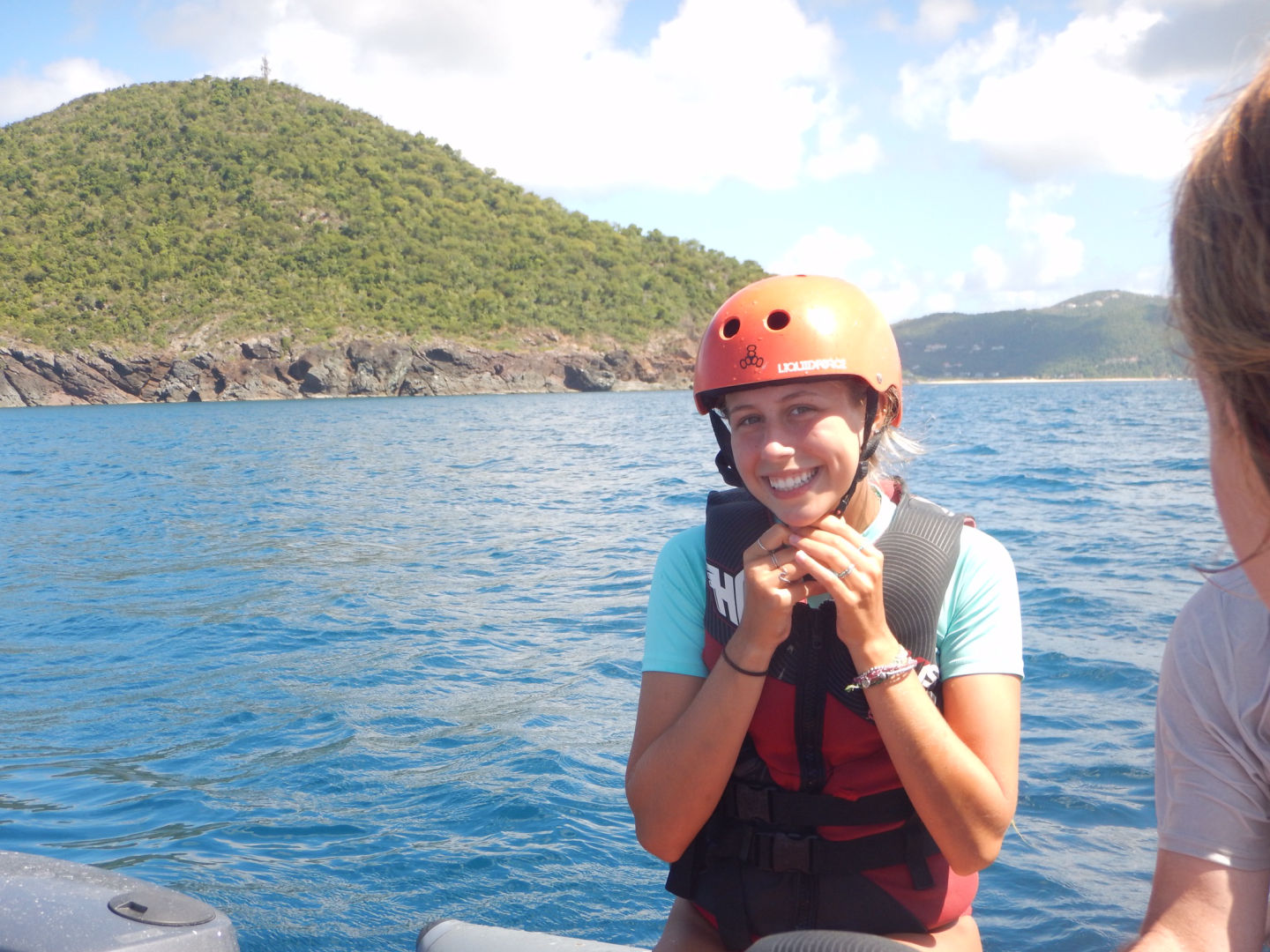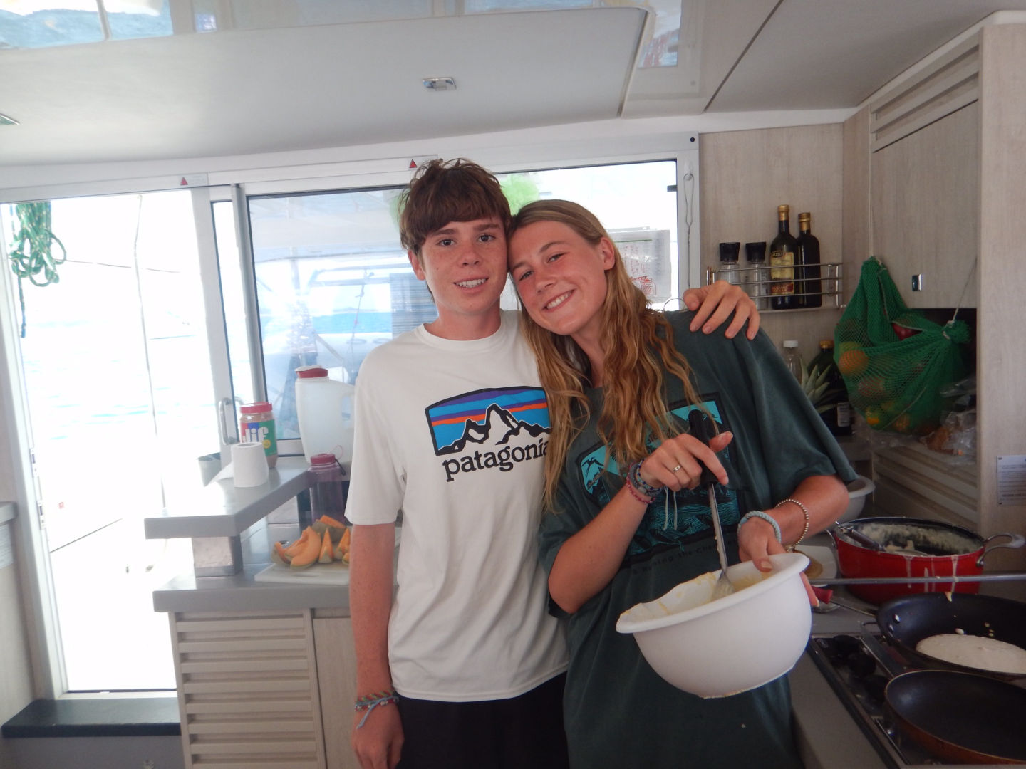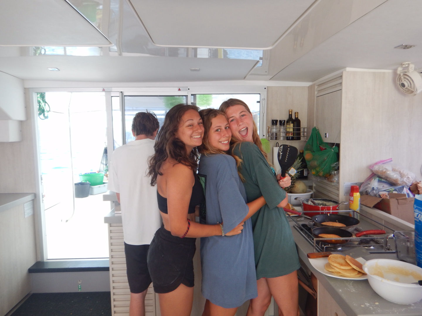 Checking the activity board when we all first woke up came with great surprise and excitement to see all the kids got to take control of the boat as the staff went off to a meeting for a few hours! The smell of pancakes and fruit-filled the air as we all sang and danced to music around the boat. We then sat down, and all ate as a group, devouring the food. It was SO GOOD! Thanks, Reece and Rafa:) We then discovered what the activity for the day was. FUN DAY! Everyone was so excited for this day to come, and now it was finally here. We finished up breakfast and cleaning before the staff got back and all got dressed. Everyone wore a bathing suit and a sun shirt ( no sunburns here!) We split into 2 different groups, having the option of either kneeboarding or wakeboarding. Most people chose to do kneeboarding since it required a lot less experience and were much easier to stay up. This was definitely one of my favorite parts of the trip. Watching each person with a helmet and life jacket glide across the water, uncontrollably laughing, put a smile on everyone’s face. We also were able to check out these really cool caves that had such a unique formation. As one group was doing the water activities, there was also a small sailboat called a “ Zest” that everyone took turns in having fun. Definitely no capsizing! Actually, maybe a few times… but that’s beside the point! In between all the fun, we managed to fit a few delicious grilled cheeses in, which gave us the energy to keep going throughout the day. The chefs of the day definitely impressed everyone. My personal favorite part of the day was watching one of the staff Dara, kneeboard. Her smile was unmatchable. We then all came back together for the best part of every day. Shower time!! Blasting music with soap in our hair and dancing all together definitely left other boats with envy. I can’t blame them. We have so much fun! After everyone was clean and hungry (yet again), we all sat down and ate pasta with Beef and salad. Yet Delisious. After a long day, everyone was so exhausted and ready for a good night’s sleep. We had a quick squeeze session, and all got into bed to get ready for the following day.