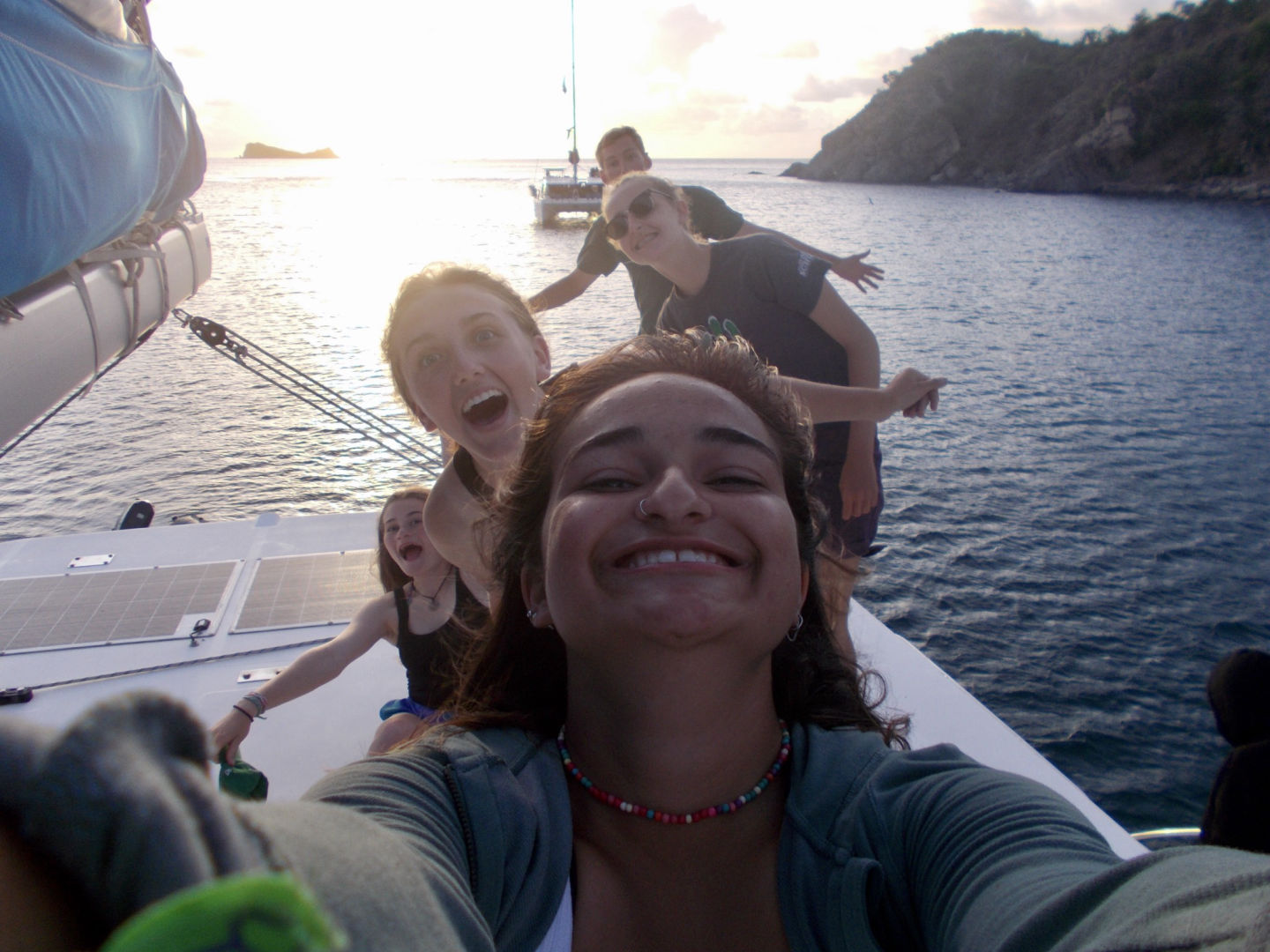 Today we awoke in Trellis Bay and had a scrumptious breakfast of assorted cereals. While eating, we sat with anticipation while J-rob took a deep-sea dive of 14 feet to rescue our bucket, which had fallen deep down into the ocean. We did a quick cleanup which involved getting our dirty clothes onto shore to be washed, so our boat is not as stinky now. We jumped down onto Shadow (our dinghy) and ventured to land with a storm coming in behind us. Our group waited for the taxi to come to pick us up to take us to Good Moon Farm, where we would be spending our day. However, we had to leave Empanada (Em, our skipper) behind to fix our engine. Larry drove us 20 minutes far up into the hills. While driving, we could see Road Town, Monkey Point (where we spent the day yesterday) and many beautiful views. We arrived and met Aragorn, and he gave us a nice talk about what he does at the farm and about farm life. After, we split into two groups. The first group stayed in the shade cutting up mangos while the other group being my group, plucked weeds from some of Aragorn’s crops. We periodically switched groups so that we wouldn’t get as sunburnt as Eric and Trevor. We did our jobs from 9-12 until we sat down for some delectable PBandJ. During lunch, some people got creative with their sandwiches and made jelly on top of jelly with smashed saltines as sprinkles for the sandwich. Julia found this new sandwich very tasty for some reason. After lunch, we continued weeding and cutting mangos until 1:30, when Larry came to pick us up. We had a peaceful drive back to the boat with Sigi arguing about how good the floor mangos tasted. We arrived back at sea level and went to Aragorn’s Studio, where some of us bought some souvenirs. While waiting to get back to the dinghy, Dara told us we had 5 minutes to go to the store we had seen when we had first arrived. We sprinted for our lives to spend our remaining money on Pringles, chips, drinks, and other delicious packaged snack food from the local convenience store. We arrived back on Dallas Blonde to find our boat very clean, something we haven’t seen since the first day. However, we messed up the boat again almost instantly — and by we, I mean Trevor and his snacks. We sailed back to Mountain Point, which took 1.5 hours. When we arrived, we quickly got into bathing suits to shower. While waiting for dinner, some people hung out on the bow while others hung out on the hardtop. We had a great dinner of veggie burgers and mashed potatoes made by Callie and Sigi. We closed off the night with clean-up and watching the sunset turn the sky pink and orange. Happy birthday to Sam’s dad Gerry!