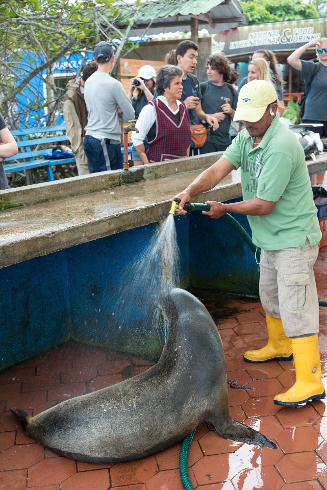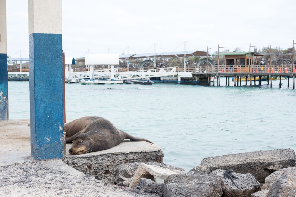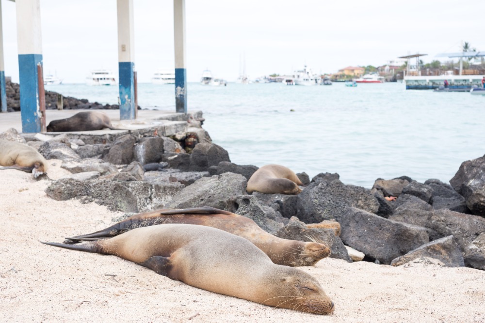 Afterward, at the dock, we spotted some very rare and intriguing sights. The first one is a large seal perched on the edge of a boat. There were at least 20 crabs on the shore of the pier who were accompanied by multiple camouflaging iguanas along the rocks. Eventually arriving at the Charles Darwin Institute, we learned about the exciting history of evolution in the Galapagos Islands. We then stopped by a cafe to enjoy some refreshments that we had on the way to a beautiful beach.