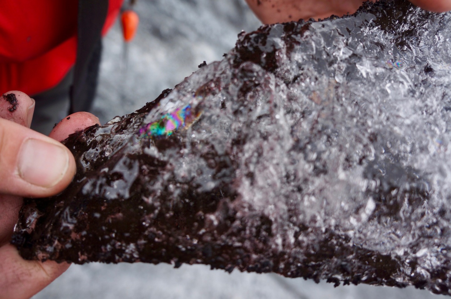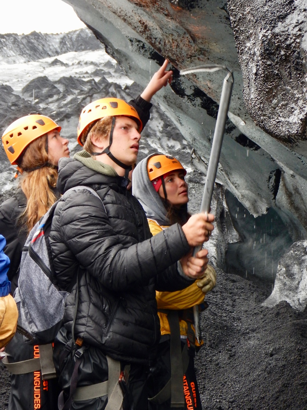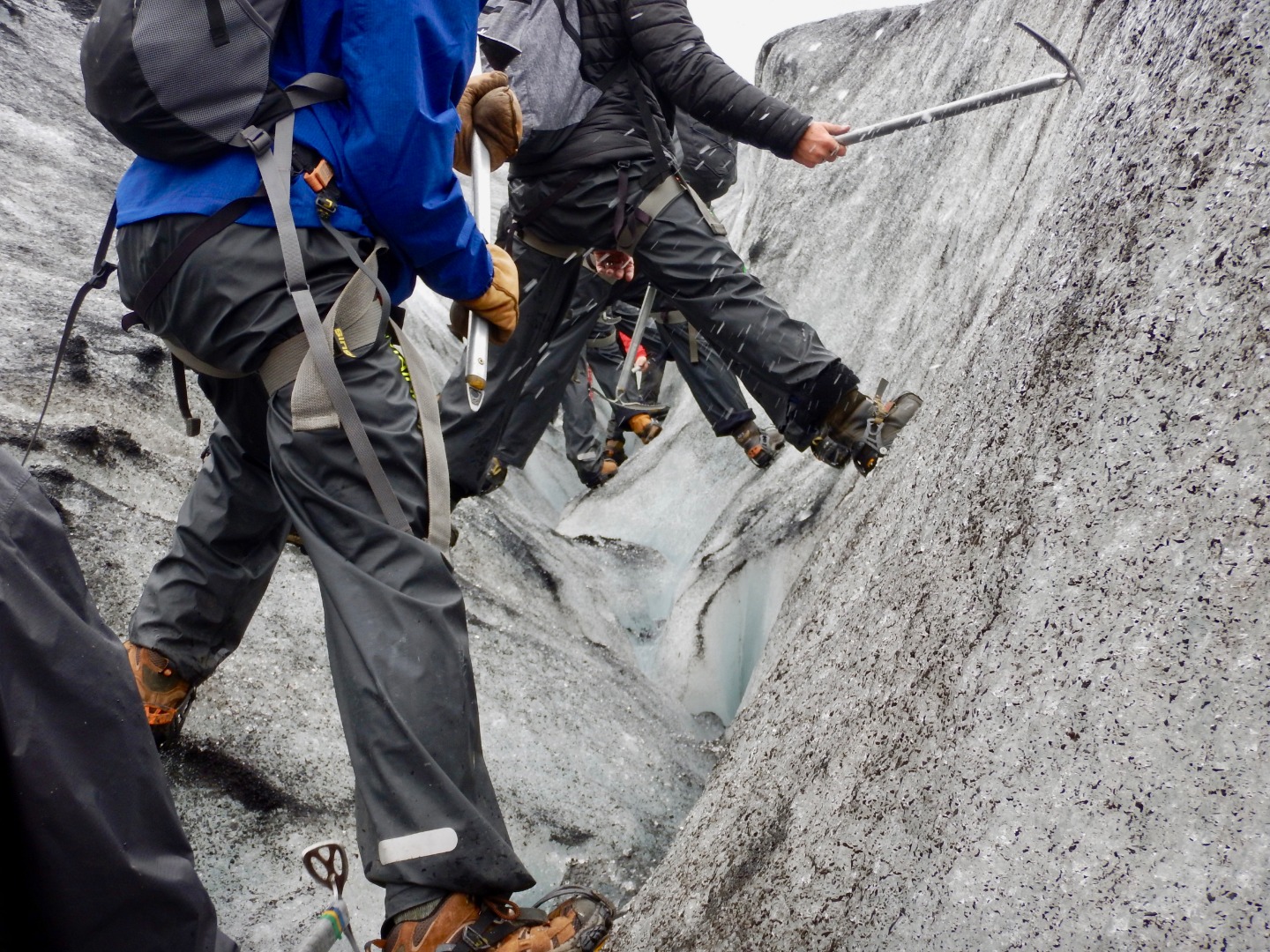 When we finally got to the glacier, none of us knew what to expect. As we got out of the bus, we quickly ate lunch, which was leftover pizza from last night. Then our tour guide had us put on rain pants, crampons, and helmets. He also gave us ice axes, which I thought were awesome. After everyone was geared up, we started the approach. Once we got close to the glacier, we had to put on our crampons and get ready to walk our way up. When we were walking up, our guide told us many interesting things about the glacier. The most interesting thing he told us was that rainbows are formed in glaciers. He proceeded to cut a chunk of ice out and handed it to us. Inside it was a mini rainbow.