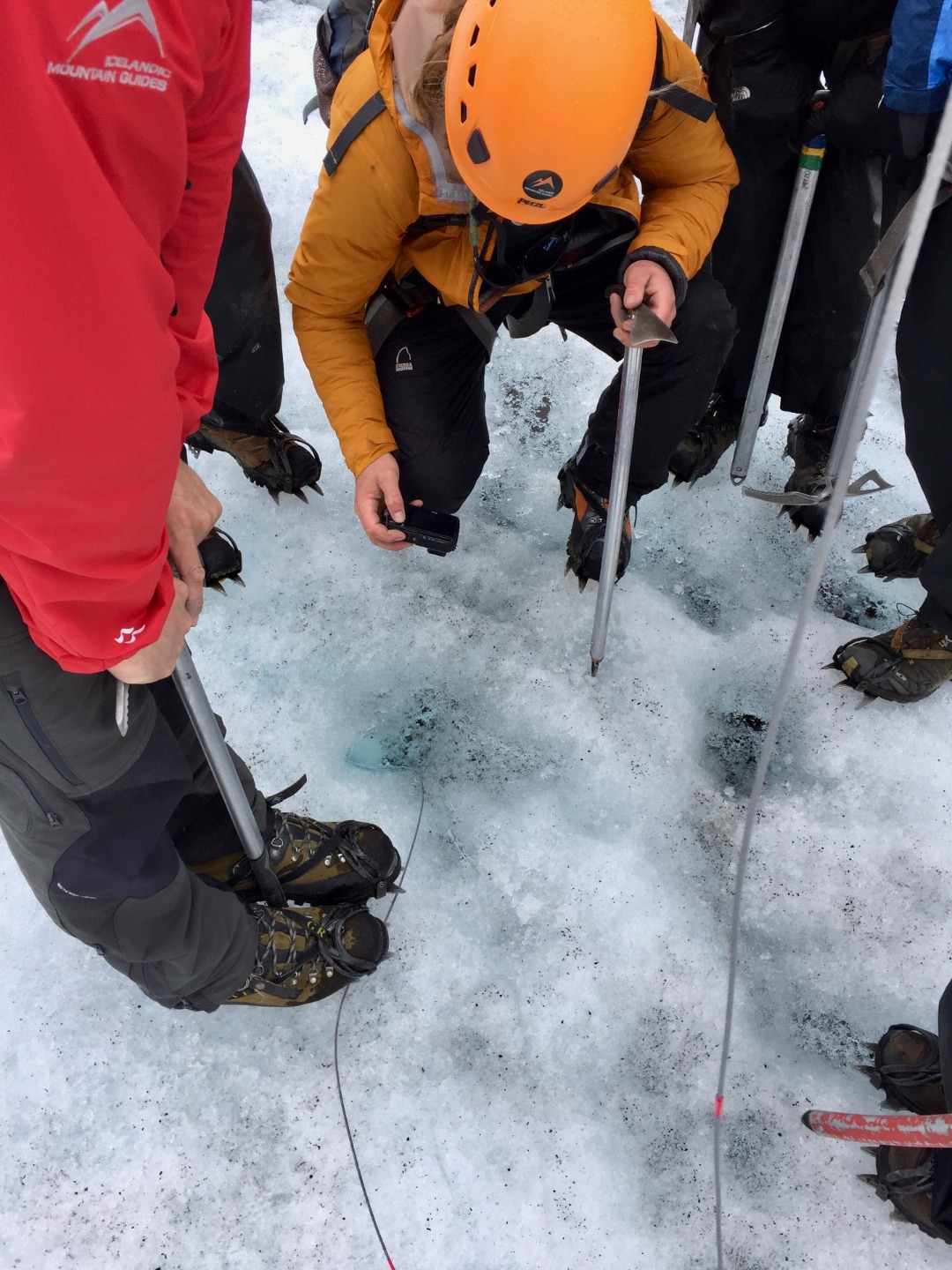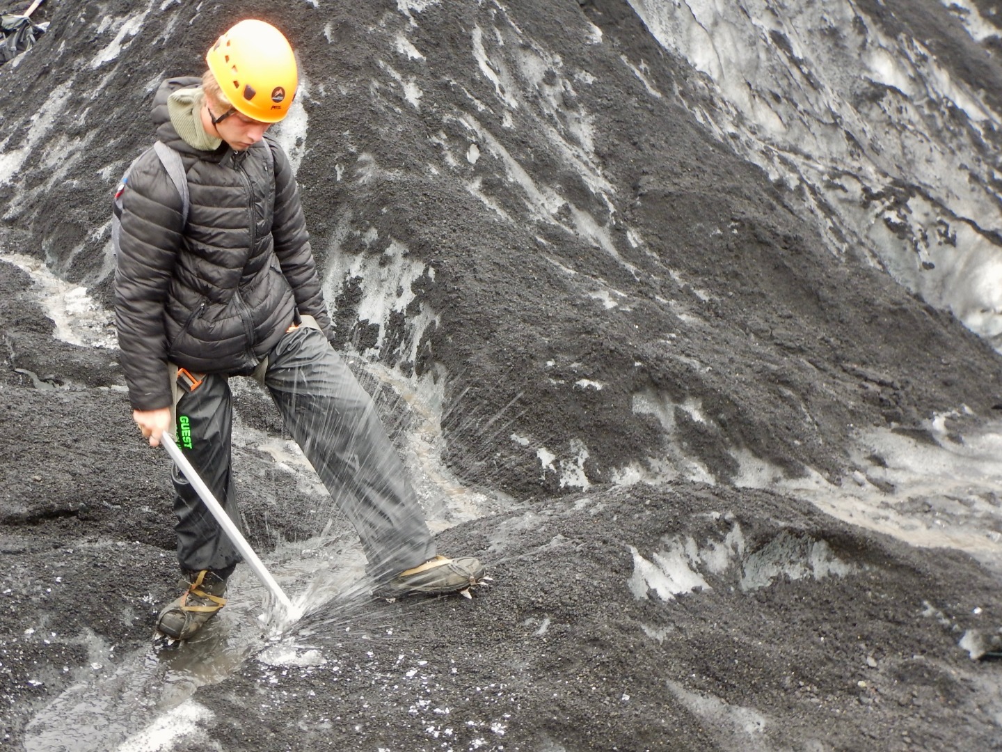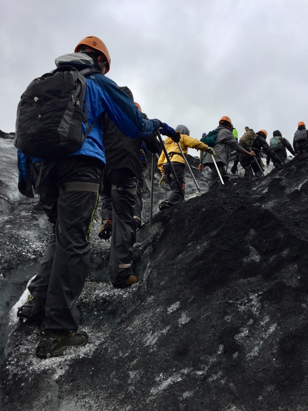 When we finally got to the glacier, none of us knew what to expect. As we got out of the bus, we quickly ate lunch, which was leftover pizza from last night. Then our tour guide had us put on rain pants, crampons, and helmets. He also gave us ice axes, which I thought were awesome. After everyone was geared up, we started the approach. Once we got close to the glacier, we had to put on our crampons and get ready to walk our way up. When we were walking up, our guide told us many interesting things about the glacier. The most interesting thing he told us was that rainbows are formed in glaciers. He proceeded to cut a chunk of ice out and handed it to us. Inside it was a mini rainbow.