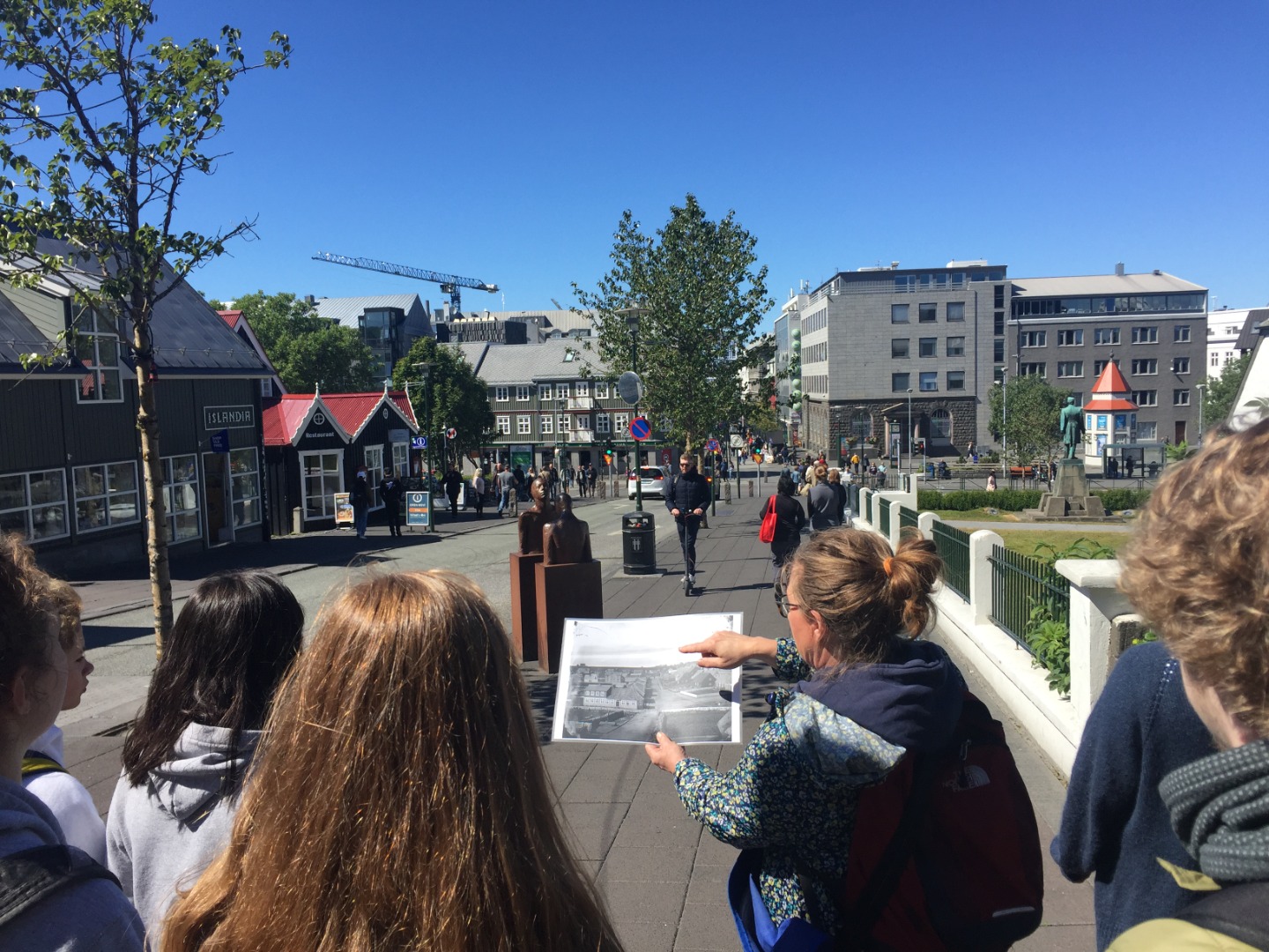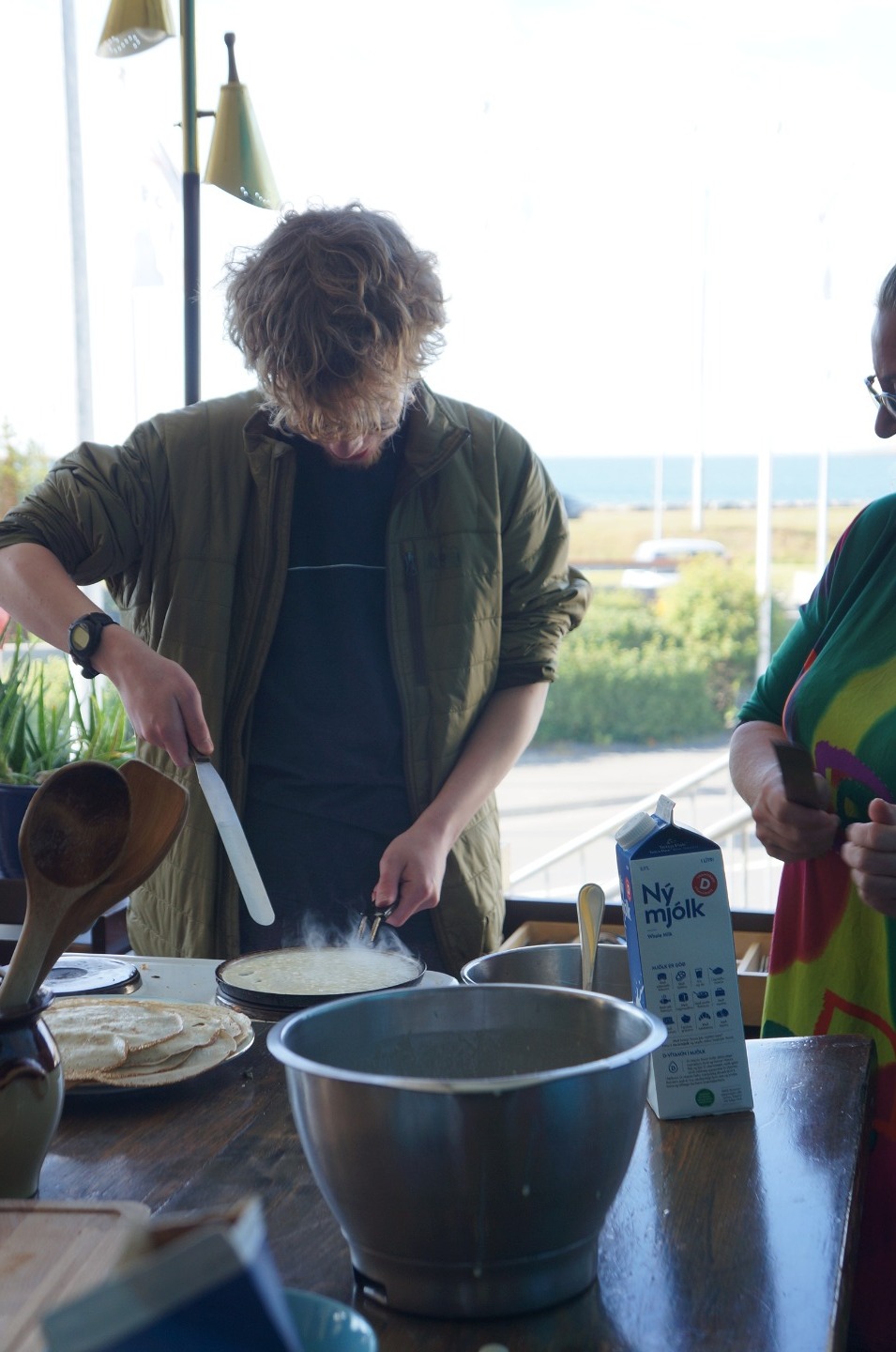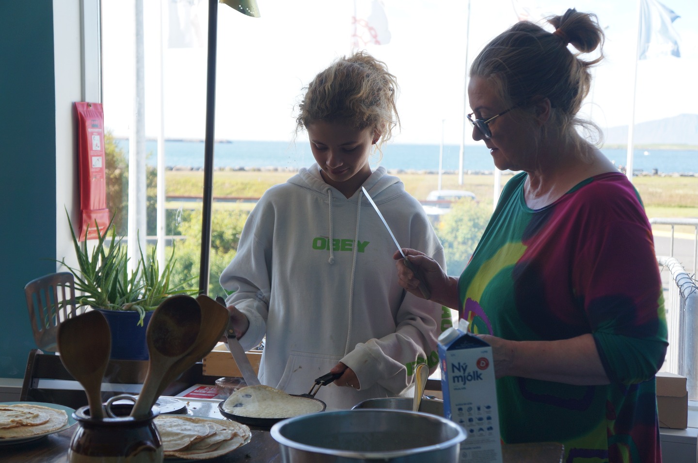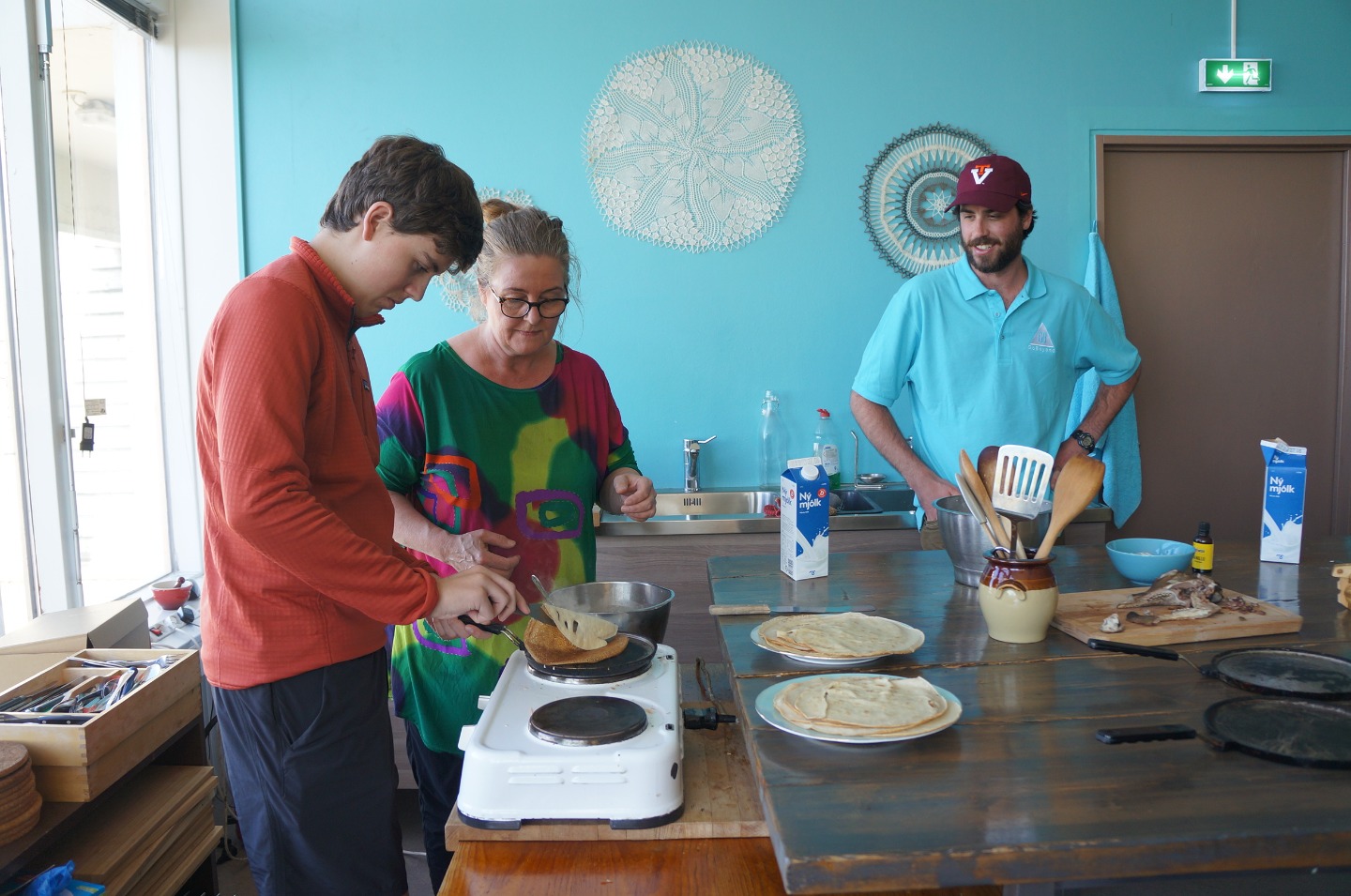 GoBeyond Iceland 2019 is off to a fantastic start! After collecting everyone from the airport and rendezvousing at our hostel in downtown Reykjavik, the adventure commenced. Those of us who arrived on the earlier flight embarked on a walking tour of the city with the one and only, Gigja Svavarsdottir. Among the many noteworthy sites was a monument celebrating the establishment of women’s voting rights in 1915. The group also visited Menntaskólinn, one of the first schools in Reykjavik, erected in 1846, and boasting not one but two Nobel laureates. Later on, Gigja told the story of the non-violent protests that took place in the ’70s which prevented urban developers from demolishing some of the oldest buildings in Reykjavik. These buildings have been transformed into restaurants and the tourist information center. Once the walking tour wrapped up, we all met at the Tin Can Factory for an Icelandic language and cooking class. While sipping on herbal teas from Gigja’s harvest, we learned that Icelandic is derived from Old Norse and is most closely related to Faroese, the language spoken in the Faroe Islands. Egil, our language and history guru, explained that all Icelanders are named after their mother or father, so their last name has the suffix -dottir for females (meaning ‘daughter of’) or -sson for males (‘son of’). Egil also enlightened us to the fact that our days of the week in English are named after Old Norse Gods: Tuesday = Tyr’s day – god of war , Wednesday = Odin’s day – god of wisdom, Thursday = Thor’s Day – god of thunder, Friday = Freyja (Odin’s wife) – goddess of fertility. We then snacked on traditional Icelandic fare which included lots of buttered up Rugbraud (brown bread steamed for 12 hours in geysir water!) with pickled herring and toasted angelica leaves, and a few classic Christmas time snacks. The brave souls among us sampled all different parts of a sheep’s head, including eyeballs!!! These are considered a true delicacy. Next, we tasted homemade Skyr yogurt drizzled with all sorts of syrups made from birch bark, mosses, and crowberries, to name a few. These syrups were made by a local woman who, feeling the effects of ageism during the financial collapse of 2008, drastically altered her career path and now employs elderly individuals to harvest herbs and berries to make the syrups. Later Gigja taught us how to make ponnukokur, traditional Icelandic pancakes. We learned that the eldest child inherits the family pancake pan, which is a great point of pride. We each tried our hand at “listening to the pancakes speak” and then “tickling” them into place. There are some professional pancake ticklers amongst us, and others, like myself, who were… ahem… not particularly skilled in the field of Icelandic pancakery. The pancakes, filled with rhubarb jam and a hefty dollop of whipped cream were delicious. Upon completing our cooking class and language lesson, Egil and Gigja granted us Icelandic names and diplomas. We returned to the hostel with full bellies and some choice phrases in Icelandic to practice during the rest of the journey. Bae for now! Patrekur Súsönnusson and Katla Jöhannasdottir (Patrick and Keeley)