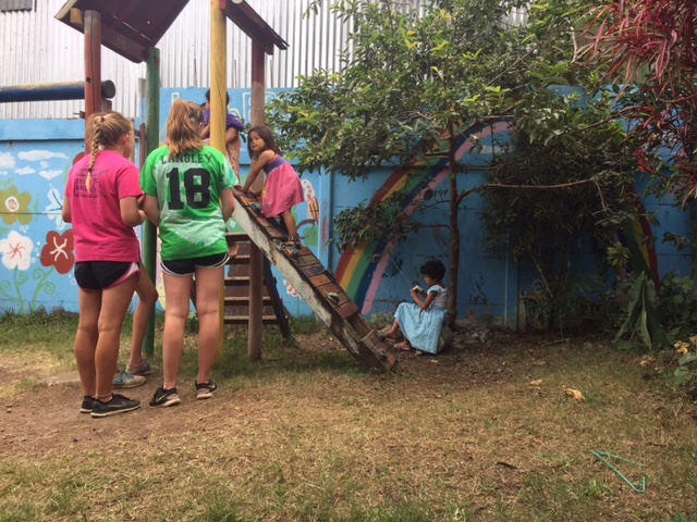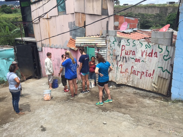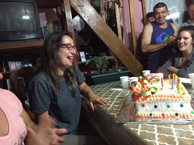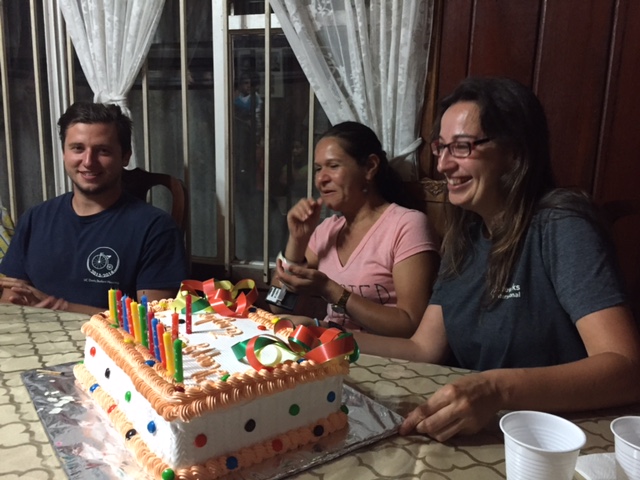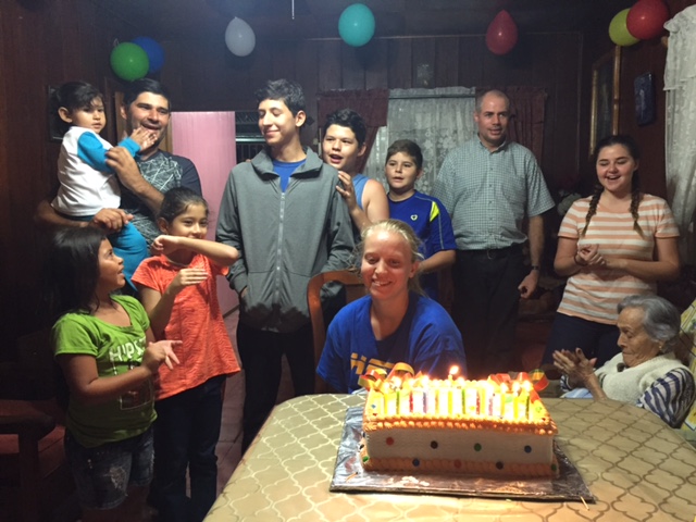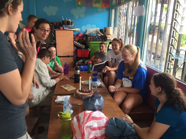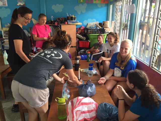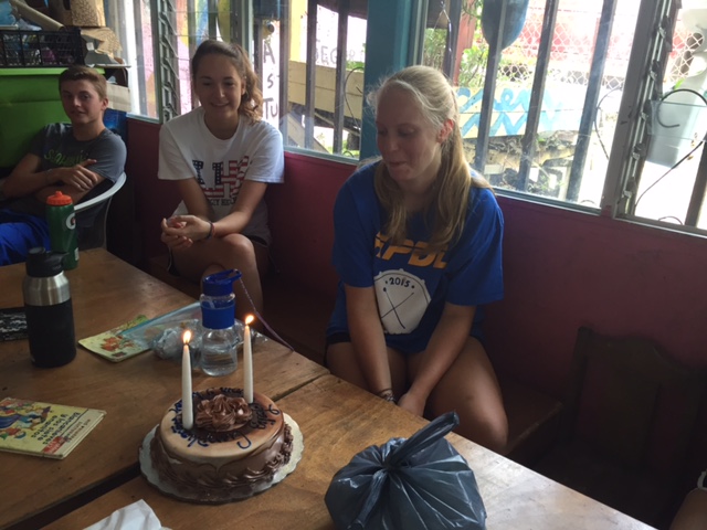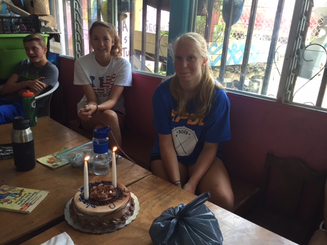 This morning, we woke up with our host families and got ready to meet at the hub by 9. We then went down to revisit La Carpio. Instead of helping out at the education center, we went to a different area. We needed three volunteers to miss out on making cement and Hannah, Kathryn, and Lucy graciously volunteered. I could tell they were bummed about it. After the fun times with the cement making, all of us got to hang out with the kids in the library. The kids were interested in our bracelets and loved to ask us if they could have our bracelets. When we left, Lucy was down three bracelets, and Kenta was down one. We drove to the capital San Jose and visited the market. It was difficult not to feel claustrophobic with five different shop owners in the same 10 feet of space, but no one had their money stolen and everyone was happy with their purchases: Lucy got 6 engraved slingshots, Sebastian bought a rainbow bracelet, Alyssa found some dolphin studs, Hannah got the little green guy from Monsters Inc. on a backpack, Kenta bought a painting on feathers, Avery got earrings, Kathryn got slingshots as well, and Alex walked around looking at things. When we returned to our host families, I had an awesome birthday party with the family of my host family. We had some cake and ice cream, and I received two drawings from some cousins. I missed sharing my birthday with my pa, but I know he had fun celebrating his 89th birthday!