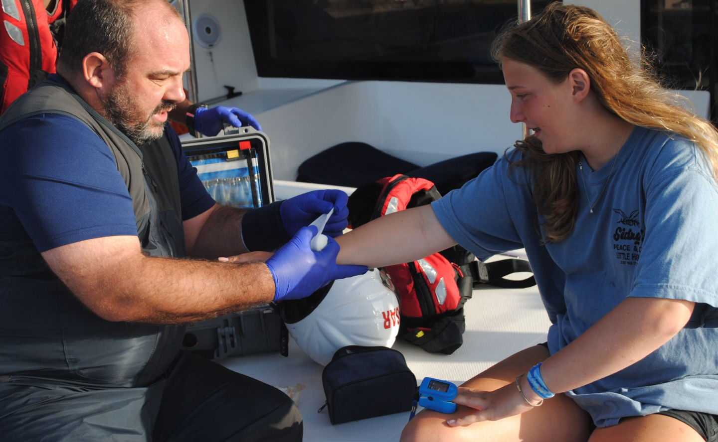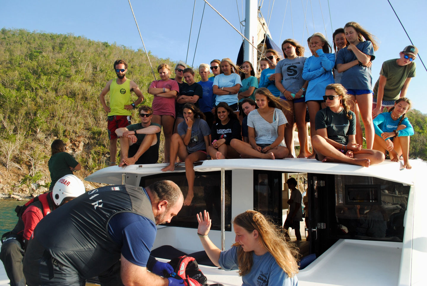Today was an exhilarating day! We started the day with a sleep-in until 8, and then we feasted on muffins with a side of pancakes and eggs. After breakfast, we then began to get ready for the planting day ahead of us. We sailed over to the mangrove pond and began to monitor the mangroves and replant them. After the productive morning, we sailed over to Peter Island, where we began to chill, eat caesar salad wraps, swim, and tan. During our chill time, we played cards, and I jumped and swam with Alden and G-Ball. After a nap and a tan on the boat, we got ready for our VISAR (Virgin Island Search and Rescue) fake rescue scenario. As Chase and I were skippers today, we got to be the victims for our fake accident. In my accident, I was cutting a cantaloupe with a circular saw and accidentally cut my hand. Charlie pretended to be a concerned friend who was asking super annoying questions to which the VISAR workers responded by telling him he is a shock victim caused by the extreme accidents. Chase’s accident was falling through a hatch and having a spinal injury. We then had to get into the VISAR boat and pretend to go to the hospital. The VISAR boat was amazing and such a thrill — 50 knots (which was very fast). After our scenario, we headed back home to Ewak and had a fantastic dinner. Today was thrilling and so much fun, and I can’t wait for what is yet to come.