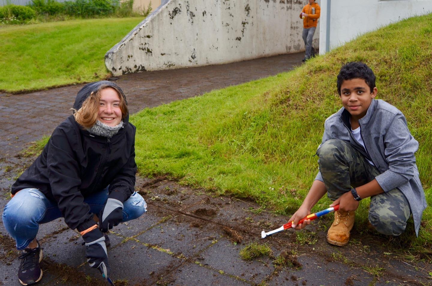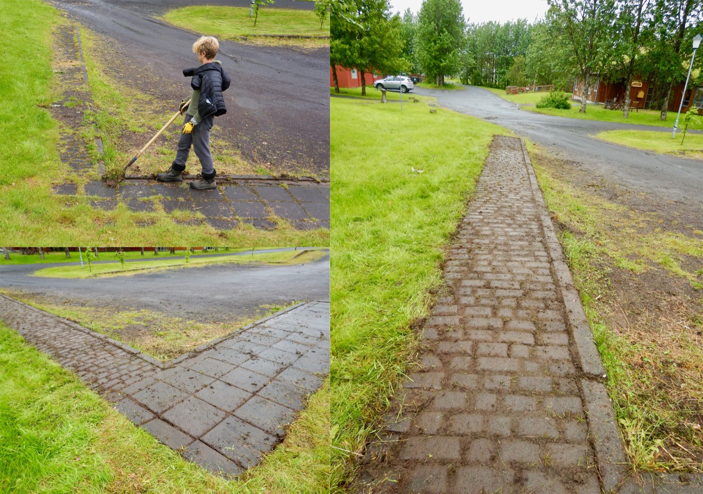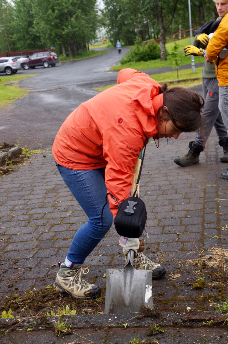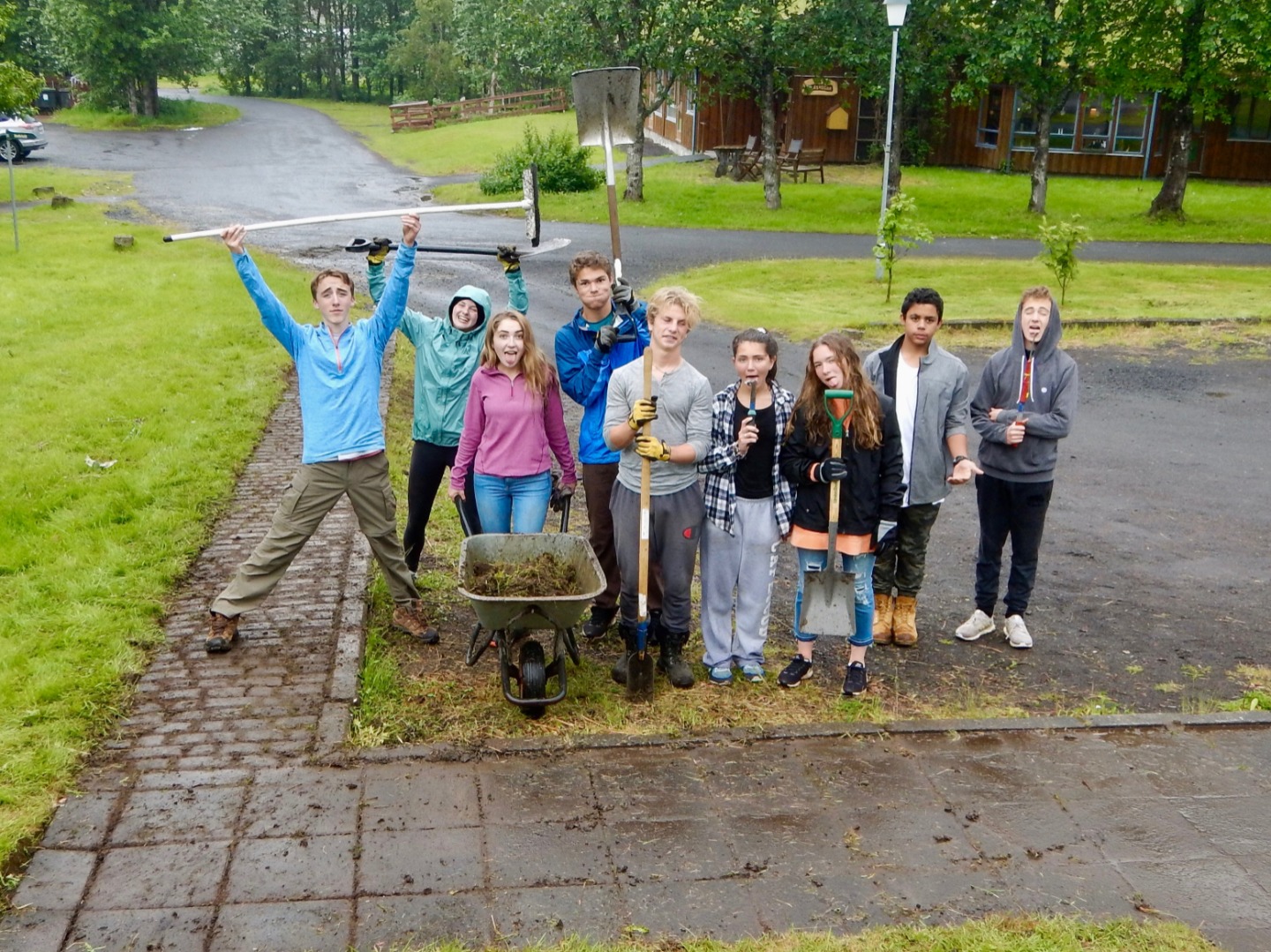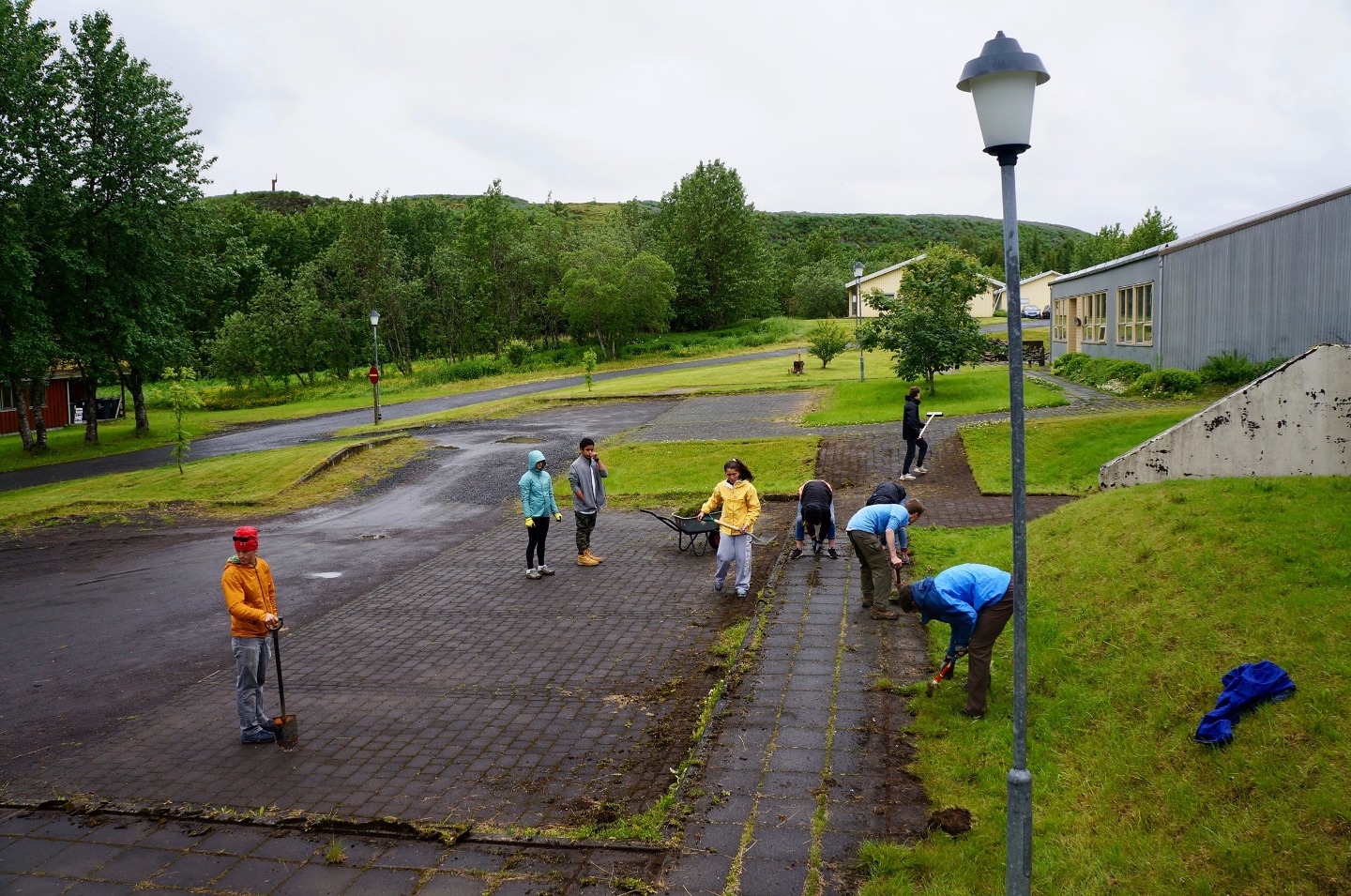 We headed back to Sólheimar for lunch, which was soup. The rain started up around then. For service, Ben suggested we try a new system: six people working their butts off cleaning the sidewalk and three sitting inside drinking hot cocoa and eating cookies. Then, in ten minutes, three others rested, and the groups switched. During my breaks, I played the piano and listened to the thumping of Eric and Carter playing basketball. The rain loosened up the grass in the cracks in between the bricks, and within an hour and a half we had pulled up all the overgrown grass from the sidewalk and dumped it into the forest to decompose. Everything was cold and muddy and wet, the type of wet that soaks through rain jackets and goes straight to your skin, but we had finished.