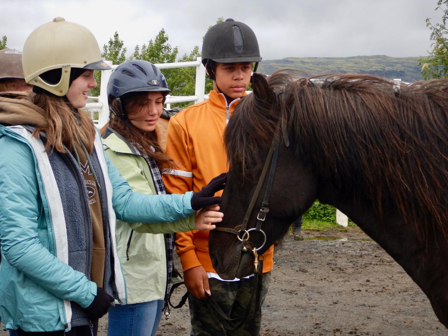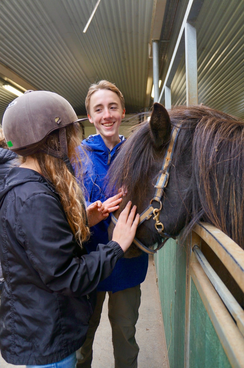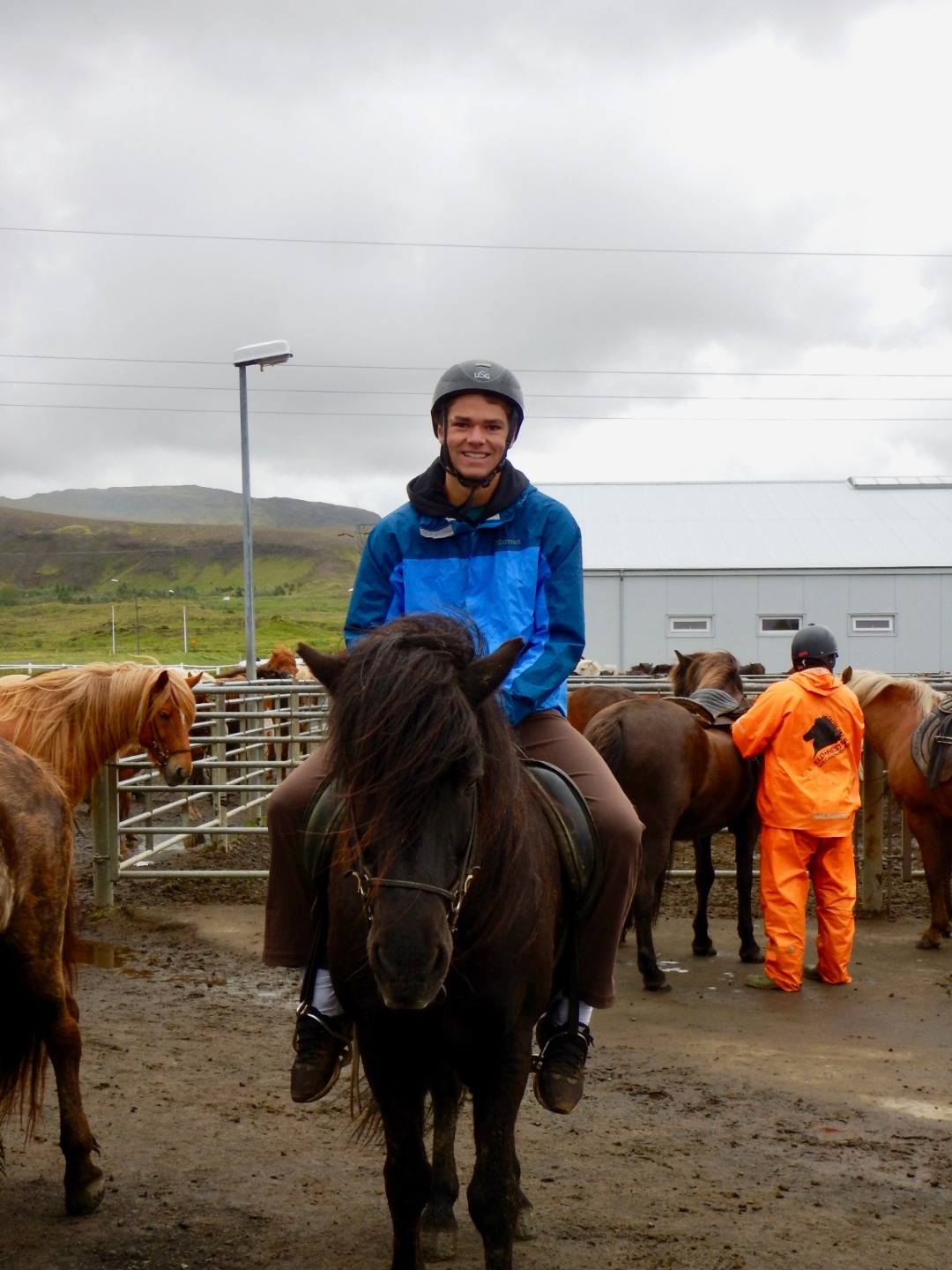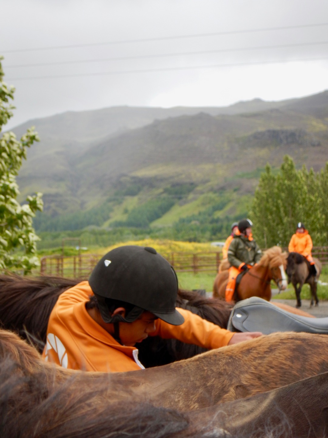 It rained today, a steady downpour that started after lunch and is still dumping outside the window. Somehow, we made it to day 11 without getting really, truly soaked. We started our day by heading down to the yard for the daily meeting, but no one showed up, and we figured we had the time wrong. So we ate breakfast, then packed up and left Sólheimar to visit a nearby horse stable, where we rode Icelandic horses. They are the only horses allowed in Iceland and are characterized by their sturdiness, weathered appearance, and unique feet (still not sure what’s so different about them, but I know there’s something). Once the horses leave Iceland, they are prohibited from returning to keep the gene pool pure and disease-free, and no other breeds are allowed onto the island. Most of them were brown, some were sandy blonde, and some were black, and all of them were beautiful, if not a little wet from the drizzle.