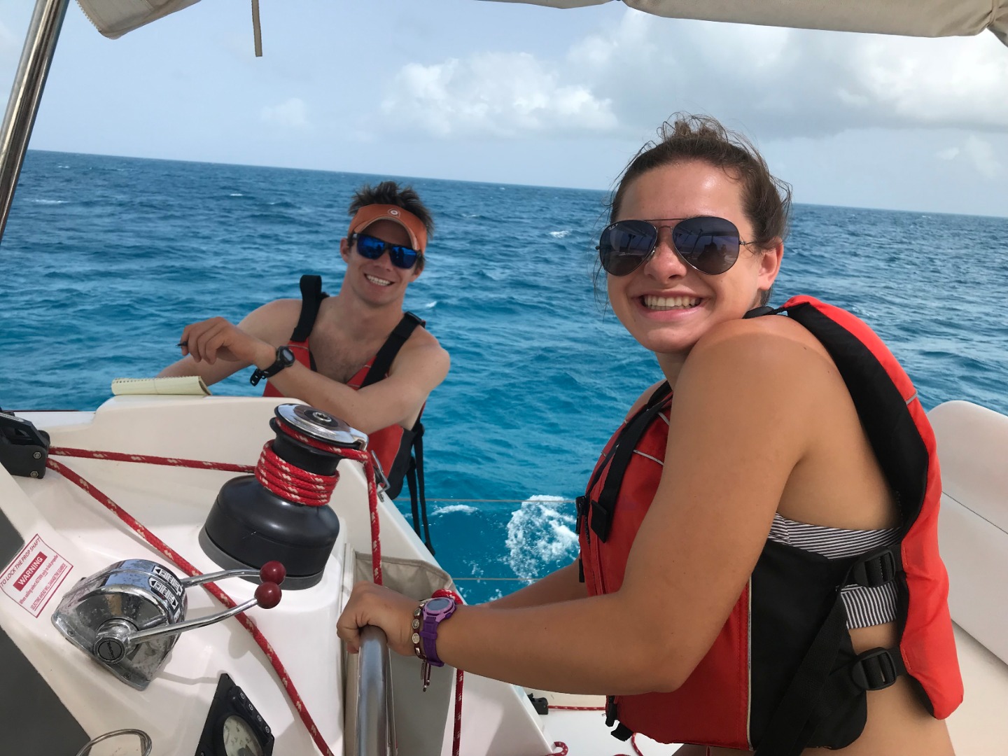 After waking up to a nice egg and blueberry brownie (brownie because they are made in brownie pans and not cupcake tins) breakfast I was told today was the day we were sailing away from Anegada. I’m not going to lie; I thought it wasn’t going to be very eventful because I was the skipper and that meant I had to do the sailing. I hadn’t ever helmed a sailboat before this day, so I thought it was going to be a little turn here, a little speeding up there, and a nice smooth stop into the mooring ball. Boy, was I wrong. I had to keep certain islands to my left, specific mountains to my right, and the degrees gauge near or around 230 degrees magnetic at all times. Not to mention that the steering wheel is stiff and takes a lot of physical effort to turn- especially when Elliot is telling me to “hard turn right” or “aggressive turn left.” But, I did it, and I had a lot of fun manning the ship! Also, I now have a new appreciation for people who handle the driving aspect of boats because I realize how much effort goes into it. After our sail to Beef Island, the rest of the boat went to shore while I stayed back and cleaned out Jackson’s backpack. Why may you ask? Well, I’ll tell you. Yesterday after turtle tagging David asked me to put the Gatorade powder by a backpack to be carried back to the boat, and I decided that since Jackson loves it so much, he should carry it. I fastened the lid, stuck it in his backpack, and thought we were set to go! Little did I know that the lid was going to come off quite easily and completely drown his backpack in blue powder. He said that when he opened it, a blue cloud came out…and I felt SO bad. Don’t worry, everything has been washed with fresh water (one of our most finite resources) dried, and nothing was ruined in the process! Moving into the afternoon, we sailed to an island with these incredible rock formations that formed super large half circles perfect for snorkeling. When I say incredible, I mean incredible. The water is a brighter blue than imaginable and the rock formations have these lines and shapes so unique that these coves look like the places advertised on Facebook as “Top 10 secret treasures of the world”. David, Koko, Angela, Myles, Yousef and I went off on one of the dinghies and found a separate area to snorkel where Yousef thought he saw two sharks (which were just tarpon fish) and Koko, and I saw a SQUID! Though it may not sound THAT exciting, you’re hearing from someone who had never seen a squid in the wild before, aka it was really exciting. We finished the day off with some fresh water showers and a surprise fish attack on route to picking up fresh food. Yes, you read that right, a fish attack. David and I were going to pick up the fresh food when a shiny, foot-and-a-half floppy thing came flying into the dinghy, courtesy of a staff member from a different boat. Not only that, but the fish had teeth, and I mean BIG teeth. So of course we went and threw it at the students in the dive boat next to us, as good cordial people would do. *Don’t worry, no fish were (seriously) harmed during this process.*