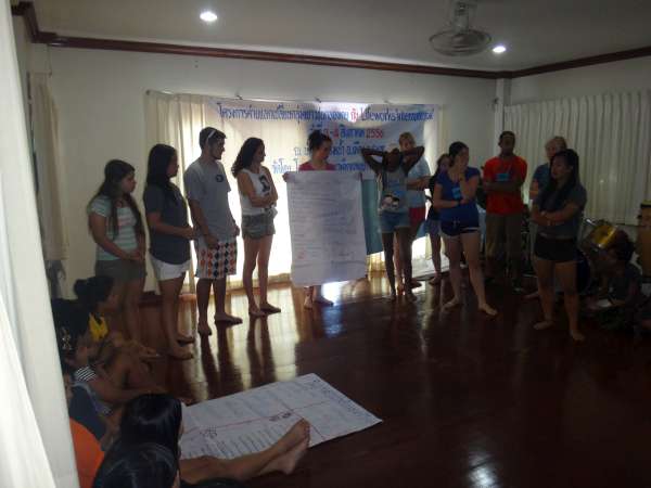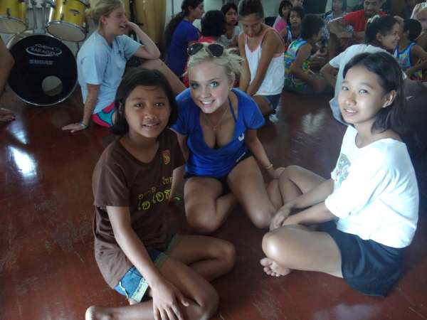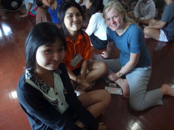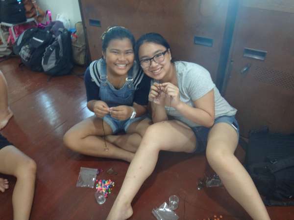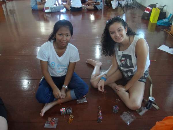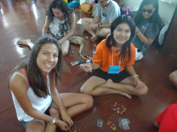 Today was a very tiring and mentally strenuous day. Last night was an interesting night, as we stayed at a guest house run by some family members of the people that run the orphanage where we were staying, and this involved Styrofoam mattresses. Some of us felt sleep deprived in the morning, but the day started to get a little better when we were given doughnuts for breakfast. Our moods were uplifted after having a sweet breakfast and seeing what lovely weather we were blessed with; the sun came out even during the rainy season! After breakfast, we were herded upstairs for our discussion of issues facing youth with the Thai teens; I was surprised to find out that there were many commonalities between problems in our countries. We both agreed that substance abuse and body image were major problems for teens in both Thailand and America. After our discussion, we had a brief snack break before we began our crafts. With our buddy, we made both a necklace and key chain as gifts for each other with beautiful beads. As craft making concluded, we were all delighted to be served an authentic Thai lunch from the orphanage. Although lunch was appetizing, our attentions were diverted from the food towards the tiny Thai orphans.