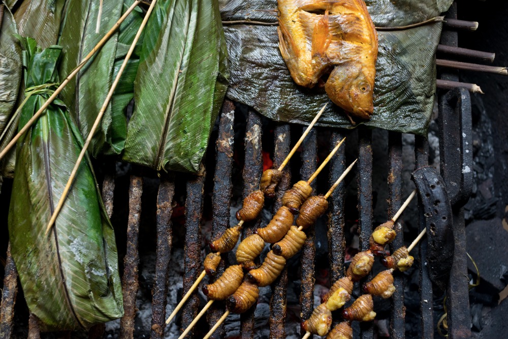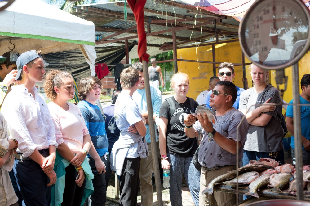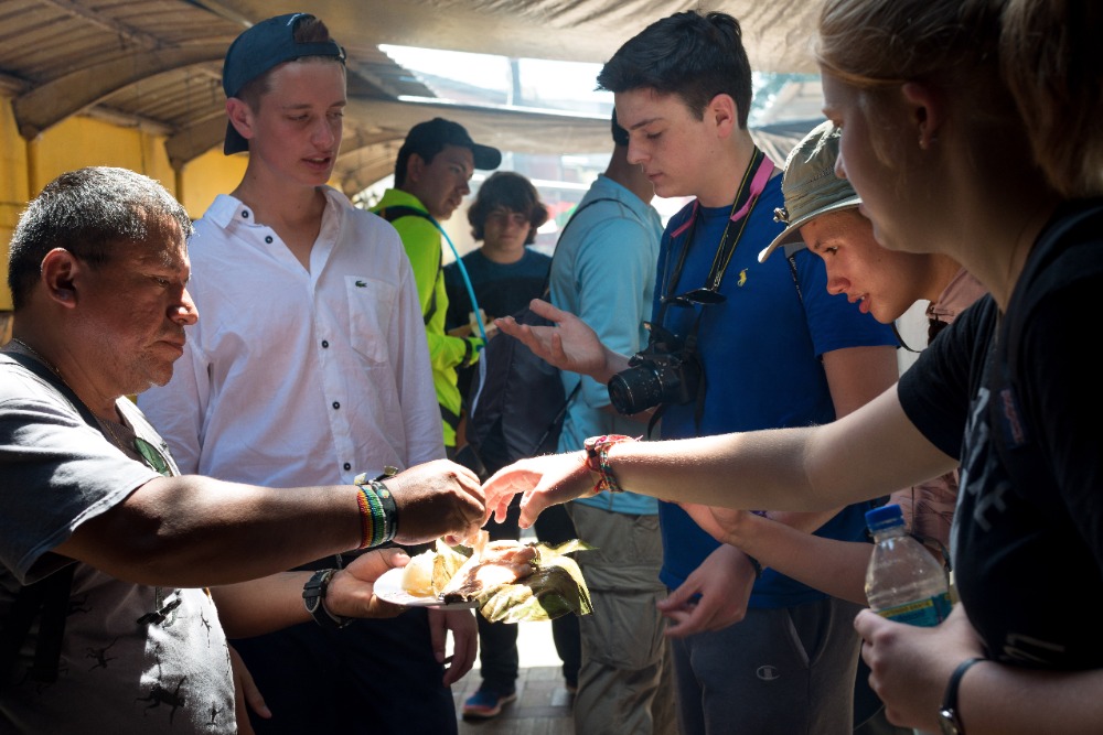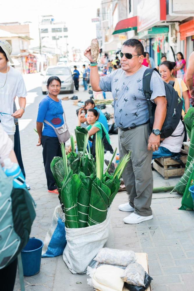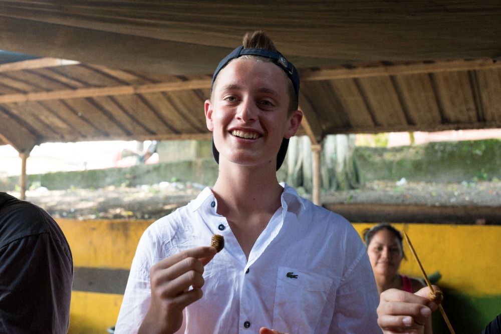 As we arrived in Coca, the door opened with many markets along the streets. Seeing so many markets in such proximity to one another brought many memories from S. Korea, where I used to live. We entered through the market streets as a few of the students started to scream, jump, and shout as the roosters greeted us jovially and lively. Walking further down the streets, our fantastic tour guide Hector introduced grubs, a wiggly worm for eating. A few minutes later, Hector gladly asked Hugo and David to try eating the energetic live grubs. With scrunched faces, they both shouted, NO! Shaking their heads fast, so we tried the grilled grubs instead. Some people were brightly smiling after eating them as they said they tasted like bacon, but for me, it felt like the grub was moving in my tummy even though it was cooked.