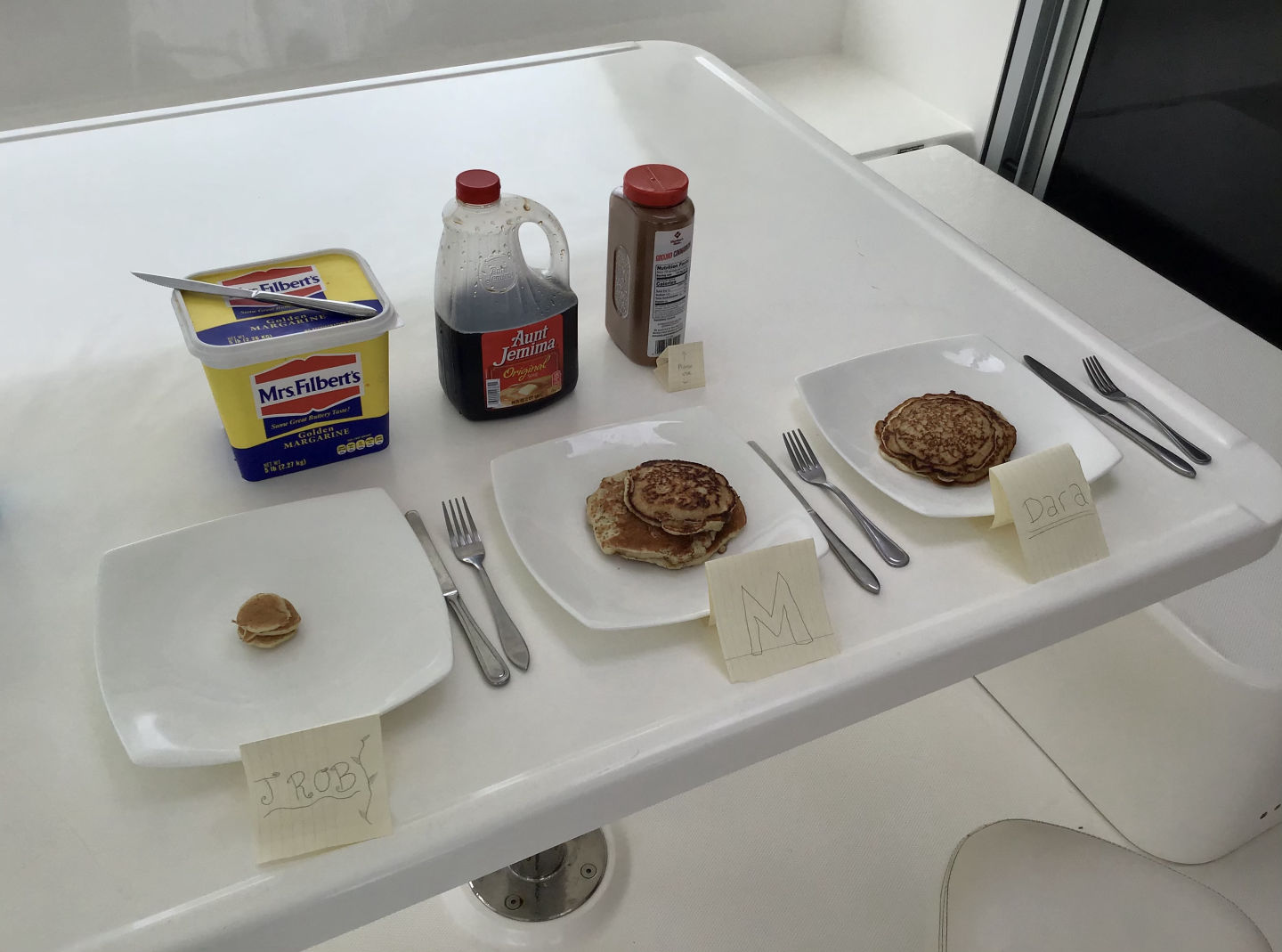 The soft pitter-patter of the rain was the first thing that we heard this morning. Since we stepped off our planes and onto the boat, it’d been nothing but bright sunshiny days – that is, until today. We experienced on-and-off thunderstorms from the moment our eyes opened until we fell asleep. However, we did not let the rain deter us. Breakfast this morning was the first challenge. Our skipper and mates had a staff meeting early in the morning, so we were on our own to make pancakes and fruit. As a prank on James (one of the mates and our medic), our chefs (Sam and Julia) decided to make him 3 baby pancakes instead of normal-sized ones (although we did have normal ones for him hidden away). Once they came back, he was pleasantly surprised, and we all had a good laugh about it. We then motored over to Scrub Island to top up on water, and then it was back to Trellis Bay for lunch, shopping, phone time, and a beach clean-up. We ate lunch at Jeremy’s Kitchen, then stocked up on snacks at the convenience/grocery store. We all called our families and friends (Hi Mom, Dad, Maren, and pets!) and then headed off for a beach clean-up, only stopping once all of our trash bags had been filled to bursting. After dinghying back to out the boat, we came to Muskmelon Bay for showers, dinner, and sleep. Dinner was delicious – tortellini and chicken Caesar salad – and only had one or two small accidents (I’m looking at you, floor lettuce!). Post-dinner was the Squeeze, which included listing your favorite part of the day and answering a question from the skipper: What is a story that you’ve heard that has stuck with you for ages, and why? Then, it was time to wind down in prep for an early bedtime, as tomorrow begins with a 4:00 am wake up and dawn sail! 🙂