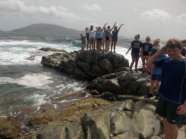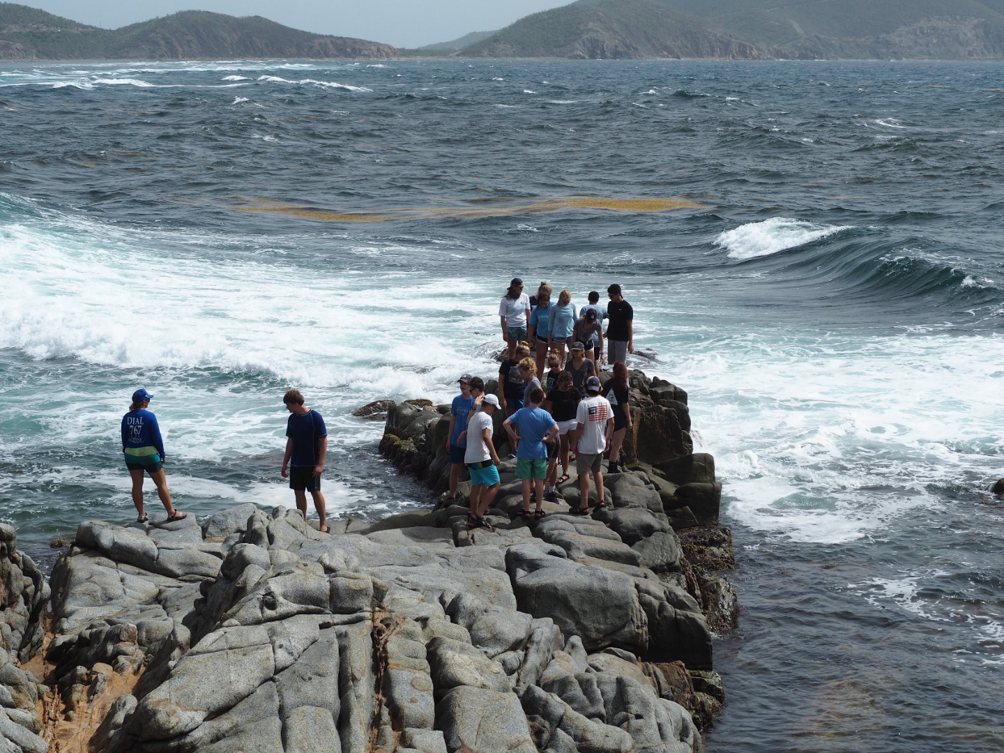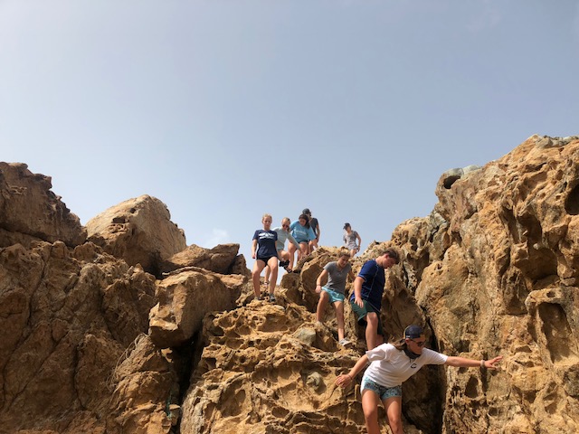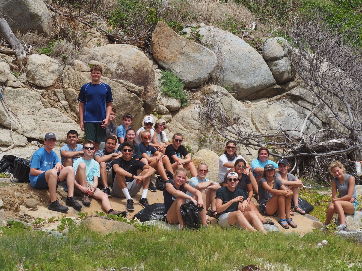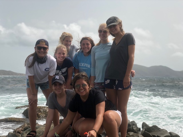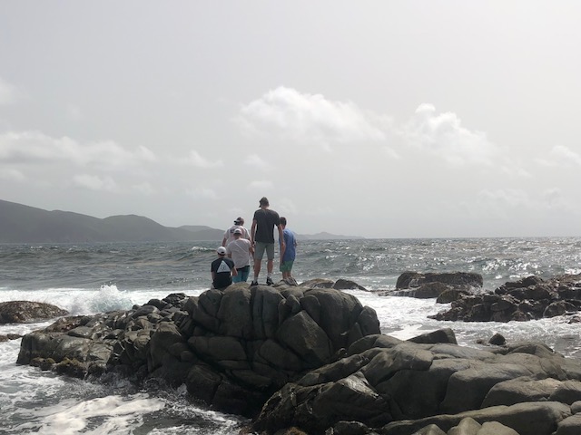So, today started quite interestingly. We began the morning with Gwen and Hannah so graciously trying to haul up the anchor, and captain, and dingy tender all at once while all of us still slept. But, unfortunately, the dock line holding the dingy to the boat got caught in the port side propeller. This, of course, delayed us as both Gwen and Hannah, as well as Will from Some Beez, had to unwrap the line from around the propeller by hand. To make it worse, Hannah was stung by a jellyfish while in the water helping. It was a terrible sting, and we all awoke very concerned, but she was a real trooper and went through the rest of the day coping with the continual pain from the venom of the Jelly. After concluding our very eventful morning with successfully removing all of the lines from the propeller, we headed back to Spanish Town. But, instead of working hard, we took a day off after the long day that preceded and ventured deeper into Virgin Gorda to the well known “Coppermine National Park.” This was an incredible spot, taking us up and down rigid rock structures alongside huge, crashing waves – terrifying yet spectacular. This tested my fear of heights. But it’s moments like these that make this program so incredibly rewarding, as I encouraged myself to complete what was an experience of a lifetime. At the end of this mind-blowing hike, we landed upon a beach where we did a quick cleanup, picking up plastic bottles, fishing net, bottle caps, and many other pieces of trash that threaten the safety of the marine ecosystem. We continued our clean up at another beach ways down the road. Here, you could truly see the damage caused by Hurricane Irma – jet skis and boat lines buried under the sand, unable to be retrieved by our bare hands. BZ took the opportunity to teach us more about different types of plastics, using examples that we had collected across the beach. The rest of the day was chill yet fun-filled as we had our first shore time, or free time, in Virgin Gorda where we got to buy lunch, and snacks, and even use our phones – we were all extremely excited because, being teenagers, we were just itching to reconnect with the technological world. The day concluded with a beautifully prepared Veggie Burger barbecue where Some Beez and our boat connected and had one big, social feast. The excitement over the programs adventures and the gradual strengthening of the Two Ghosts family is truly beginning to shine. We can not wait for the coming opportunities and adventures.